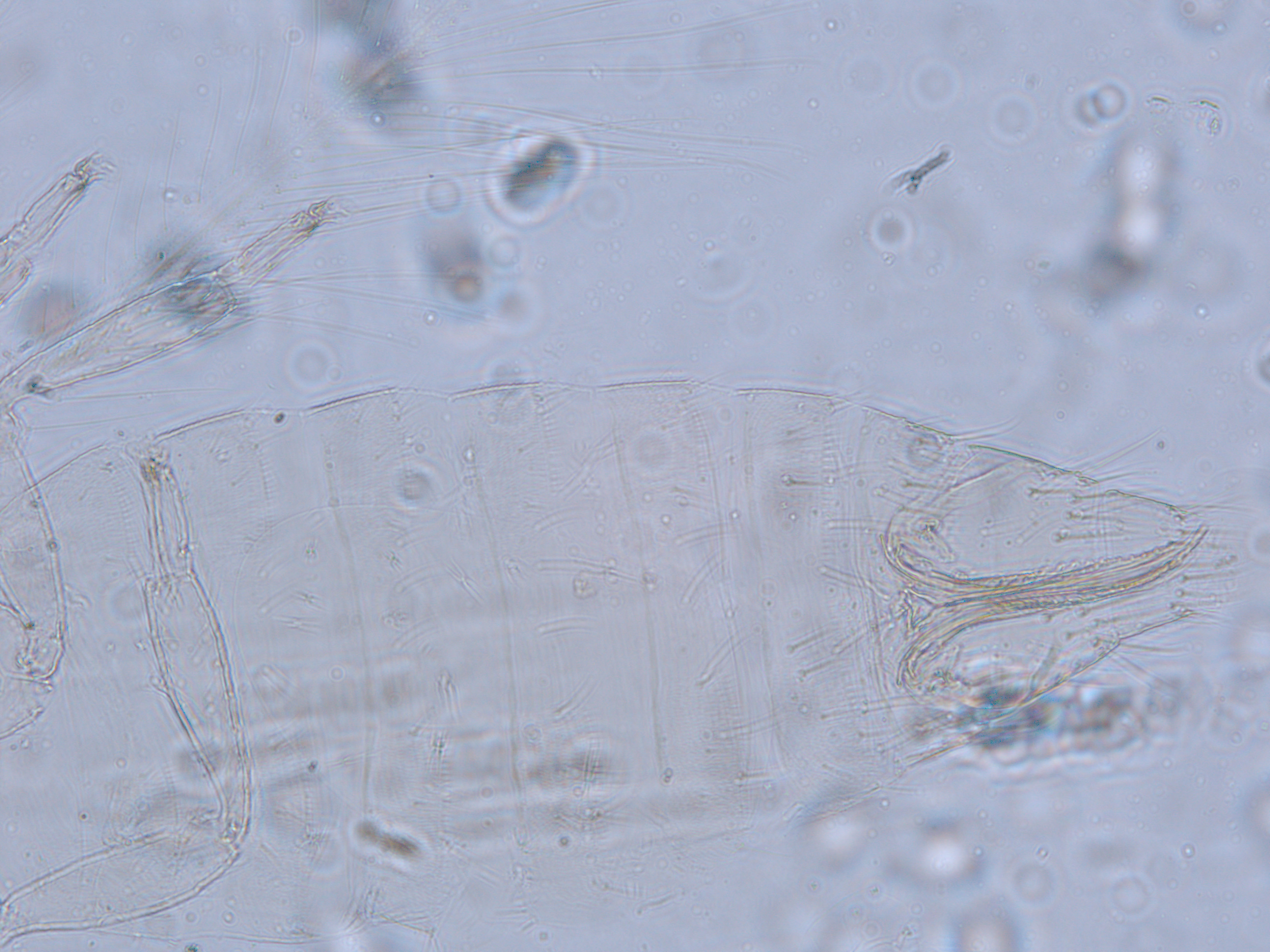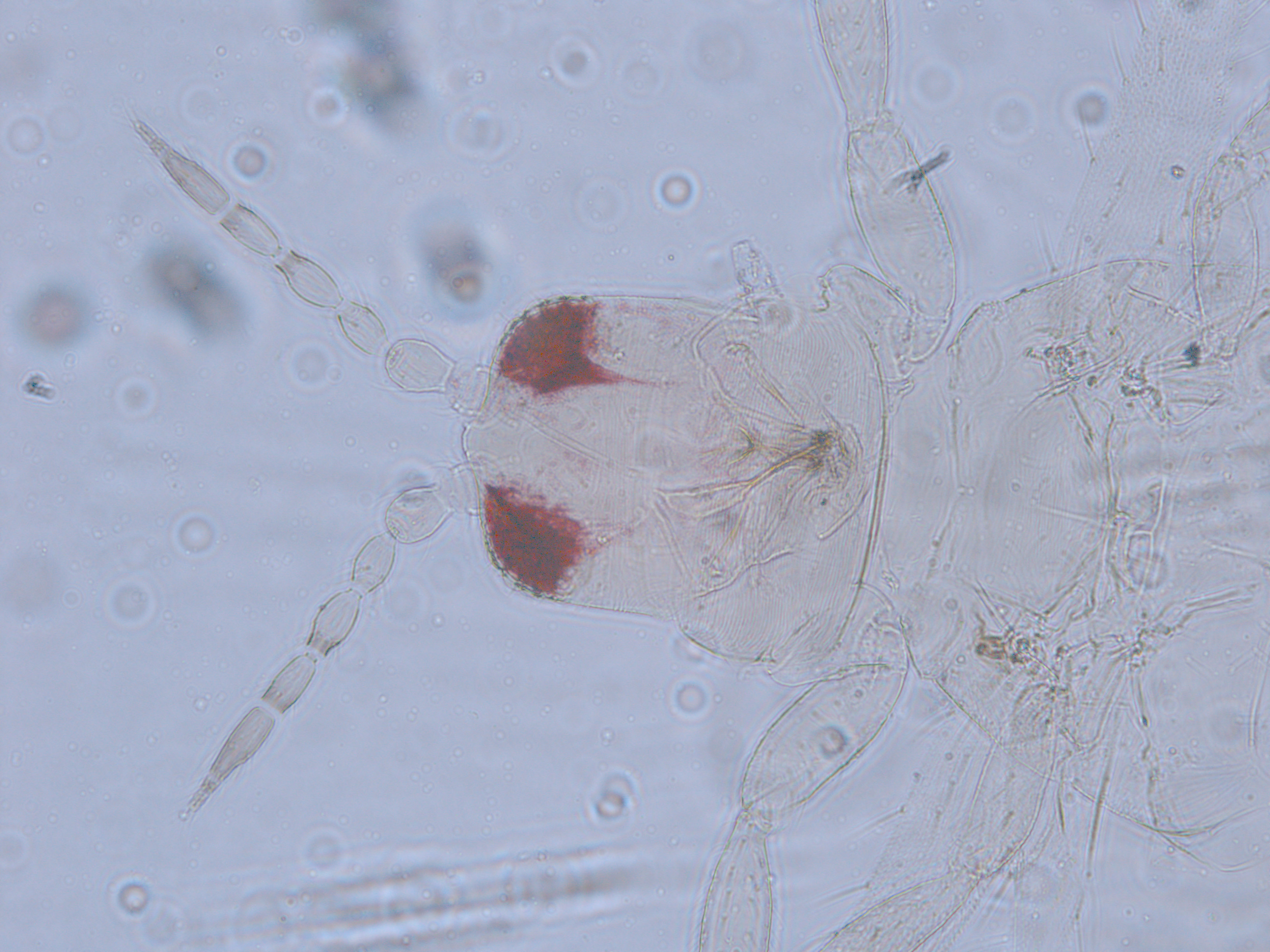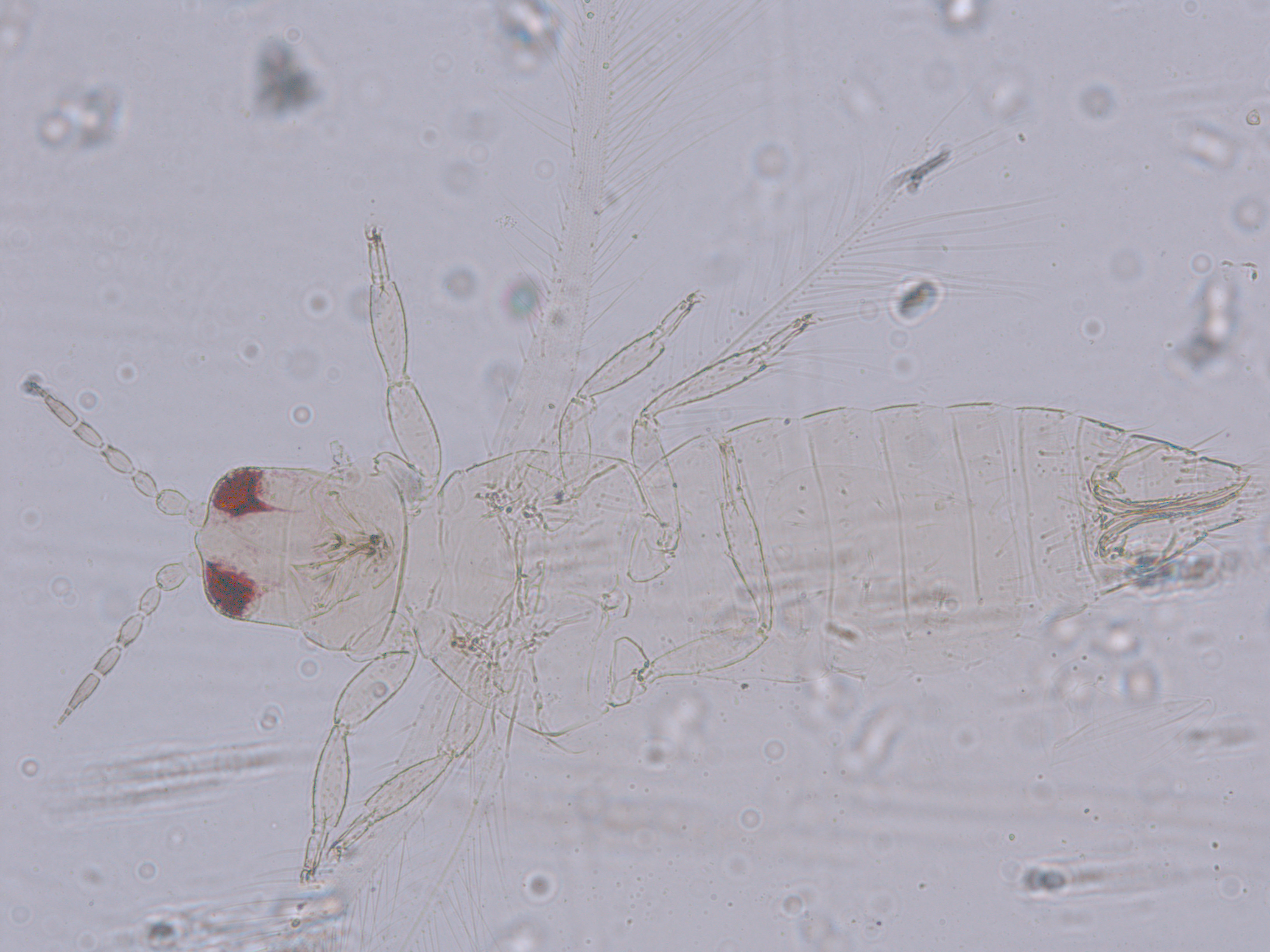 描述:雌虫:体浅黄色,复眼黑红,触角节IV-VI端部和VII-VIII浅灰色;口锥端部、各足跗节端部及产卵器较深。头略短于前胸,前单眼前外侧、单眼间及头后部有交错横线纹;复眼大占据头长的2/3;单眼呈扁三角形排列,位于复眼间略后部;前单眼鬃2对,其1对位于近复眼前内缘,另1对在前单眼前外侧;单眼间鬃位于前、后单眼中途内缘连线上;单眼和复眼后鬃约6对;触角8节,节III略短于IV和VI,节III背和IV腹面有短的叉状感觉锥,节V和VI外端、VI内侧各有简单感觉锥1个;各节近端背面和侧面有较长刚毛,节II-VI有密横排微毛;幕骨小。前胸背板密布横交错线纹于背板,但侧部有3个小的,后中部两侧有一大而横的及一小的无纹区;无长鬃;中胸背板前缘光滑,前部横纹略向前弯,后部两侧侧横线纹各自向中后延伸;前部细孔移位至两侧;前外侧对鬃不长于后中对鬃和后缘对鬃,后中对鬃位于中部,后缘对鬃向前移,接近后中对鬃;后胸背板中部纵网纹清楚,其前和两侧的纵网纹轻而模糊,网纹两侧密布纵弯线纹;前缘对鬃与前中对鬃的长度相似,均在前缘上;前翅前缘鬃22根,前脉鬃6+3,后脉鬃2根,翅瓣前缘端半部鬃4根,后基部有鬃1根,后端缘有长鬃2根;各足各节刚毛相当长但无粗刺。腹部节I-VIII背板两侧密布微毛,中部无毛区较宽,无线纹,约为有毛区宽度的一半;节VII和VIII背板后缘梳完整;细孔距微毛区较劲,中对鬃在其内后方;节IX后缘之前有6对鬃呈弧形排列;节X后部有鬃4对;股节背板和腹板前缘线几乎不可见,腹板节II-VII两侧微毛区宽度总和不及光滑区宽度;节II-VII腹板有细横纹;节II后缘鬃2对,接近后缘,节III-VIII后缘3对鬃较长,远离后缘至前中部,无附属鬃。