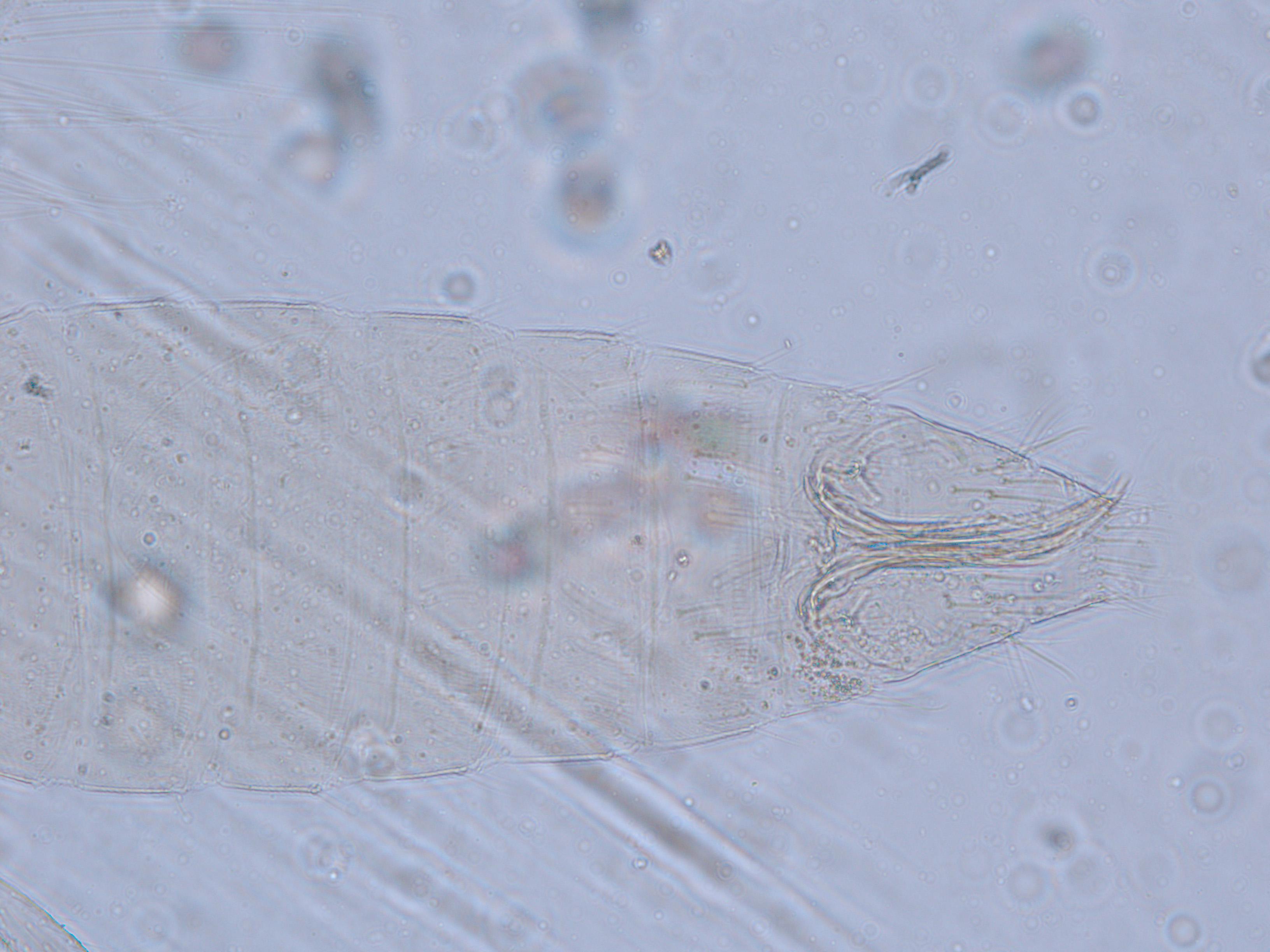 描述:雌虫:体浅黄色,复眼黑红,触角节IV-VI端部和VII-VIII浅灰色;口锥端部、各足跗节端部及产卵器较深。头略短于前胸,前单眼前外侧、单眼间及头后部有交错横线纹;复眼大占据头长的2/3;单眼呈扁三角形排列,位于复眼间略后部;前单眼鬃2对,其1对位于近复眼前内缘,另1对在前单眼前外侧;单眼间鬃位于前、后单眼中途内缘连线上;单眼和复眼后鬃约6对;触角8节,节III略短于IV和VI,节III背和IV腹面有短的叉状感觉锥,节V和VI外端、VI内侧各有简单感觉锥1个;各节近端背面和侧面有较长刚毛,节II-VI有密横排微毛;幕骨小。前胸背板密布横交错线纹于背板,但侧部有3个小的,后中部两侧有一大而横的及一小的无纹区;无长鬃;中胸背板前缘光滑,前部横纹略向前弯,后部两侧侧横线纹各自向中后延伸;前部细孔移位至两侧;前外侧对鬃不长于后中对鬃和后缘对鬃,后中对鬃位于中部,后缘对鬃向前移,接近后中对鬃;后胸背板中部纵网纹清楚,其前和两侧的纵网纹轻而模糊,网纹两侧密布纵弯线纹;前缘对鬃与前中对鬃的长度相似,均在前缘上;前翅前缘鬃22根,前脉鬃6+3,后脉鬃2根,翅瓣前缘端半部鬃4根,后基部有鬃1根,后端缘有长鬃2根;各足各节刚毛相当长但无粗刺。腹部节I-VIII背板两侧密布微毛,中部无毛区较宽,无线纹,约为有毛区宽度的一半;节VII和VIII背板后缘梳完整;细孔距微毛区较劲,中对鬃在其内后方;节IX后缘之前有6对鬃呈弧形排列;节X后部有鬃4对;股节背板和腹板前缘线几乎不可见,腹板节II-VII两侧微毛区宽度总和不及光滑区宽度;节II-VII腹板有细横纹;节II后缘鬃2对,接近后缘,节III-VIII后缘3对鬃较长,远离后缘至前中部,无附属鬃。
