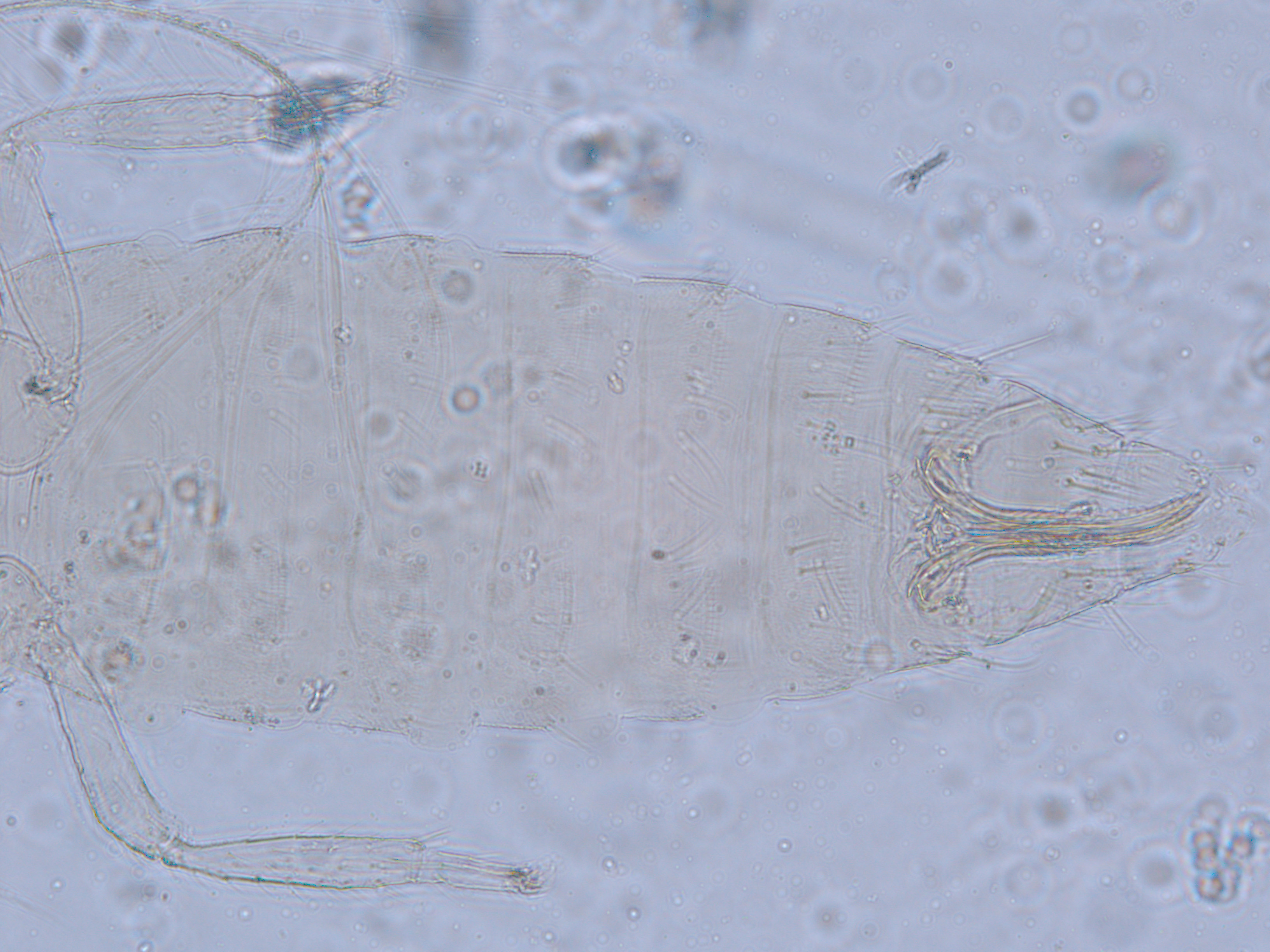 描述:雌虫:体浅黄色,复眼黑红,触角节IV-VI端部和VII-VIII浅灰色;口锥端部、各足跗节端部及产卵器较深。头略短于前胸,前单眼前外侧、单眼间及头后部有交错横线纹;复眼大占据头长的2/3;单眼呈扁三角形排列,位于复眼间略后部;前单眼鬃2对,其1对位于近复眼前内缘,另1对在前单眼前外侧;单眼间鬃位于前、后单眼中途内缘连线上;单眼和复眼后鬃约6对;触角8节,节III略短于IV和VI,节III背和IV腹面有短的叉状感觉锥,节V和VI外端、VI内侧各有简单感觉锥1个;各节近端背面和侧面有较长刚毛,节II-VI有密横排微毛;幕骨小。前胸背板密布横交错线纹于背板,但侧部有3个小的,后中部两侧有一大而横的及一小的无纹区;无长鬃;中胸背板前缘光滑,前部横纹略向前弯,后部两侧侧横线纹各自向中后延伸;前部细孔移位至两侧;前外侧对鬃不长于后中对鬃和后缘对鬃,后中对鬃位于中部,后缘对鬃向前移,接近后中对鬃;后胸背板中部纵网纹清楚,其前和两侧的纵网纹轻而模糊,网纹两侧密布纵弯线纹;前缘对鬃与前中对鬃的长度相似,均在前缘上;前翅前缘鬃22根,前脉鬃6+3,后脉鬃2根,翅瓣前缘端半部鬃4根,后基部有鬃1根,后端缘有长鬃2根;各足各节刚毛相当长但无粗刺。腹部节I-VIII背板两侧密布微毛,中部无毛区较宽,无线纹,约为有毛区宽度的一半;节VII和VIII背板后缘梳完整;细孔距微毛区较劲,中对鬃在其内后方;节IX后缘之前有6对鬃呈弧形排列;节X后部有鬃4对;股节背板和腹板前缘线几乎不可见,腹板节II-VII两侧微毛区宽度总和不及光滑区宽度;节II-VII腹板有细横纹;节II后缘鬃2对,接近后缘,节III-VIII后缘3对鬃较长,远离后缘至前中部,无附属鬃。