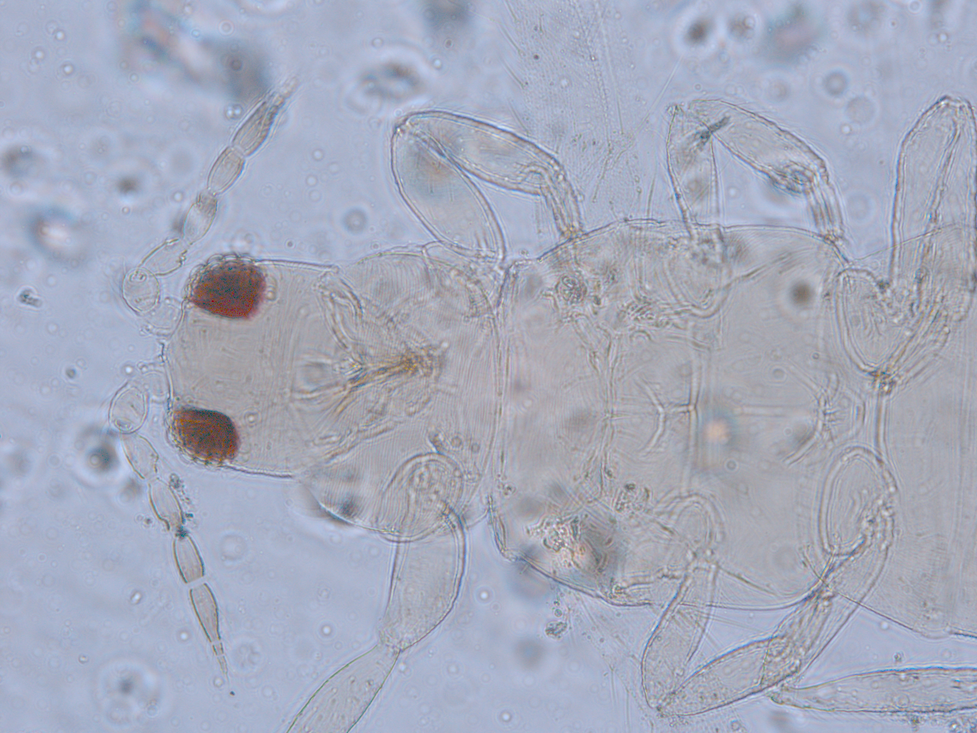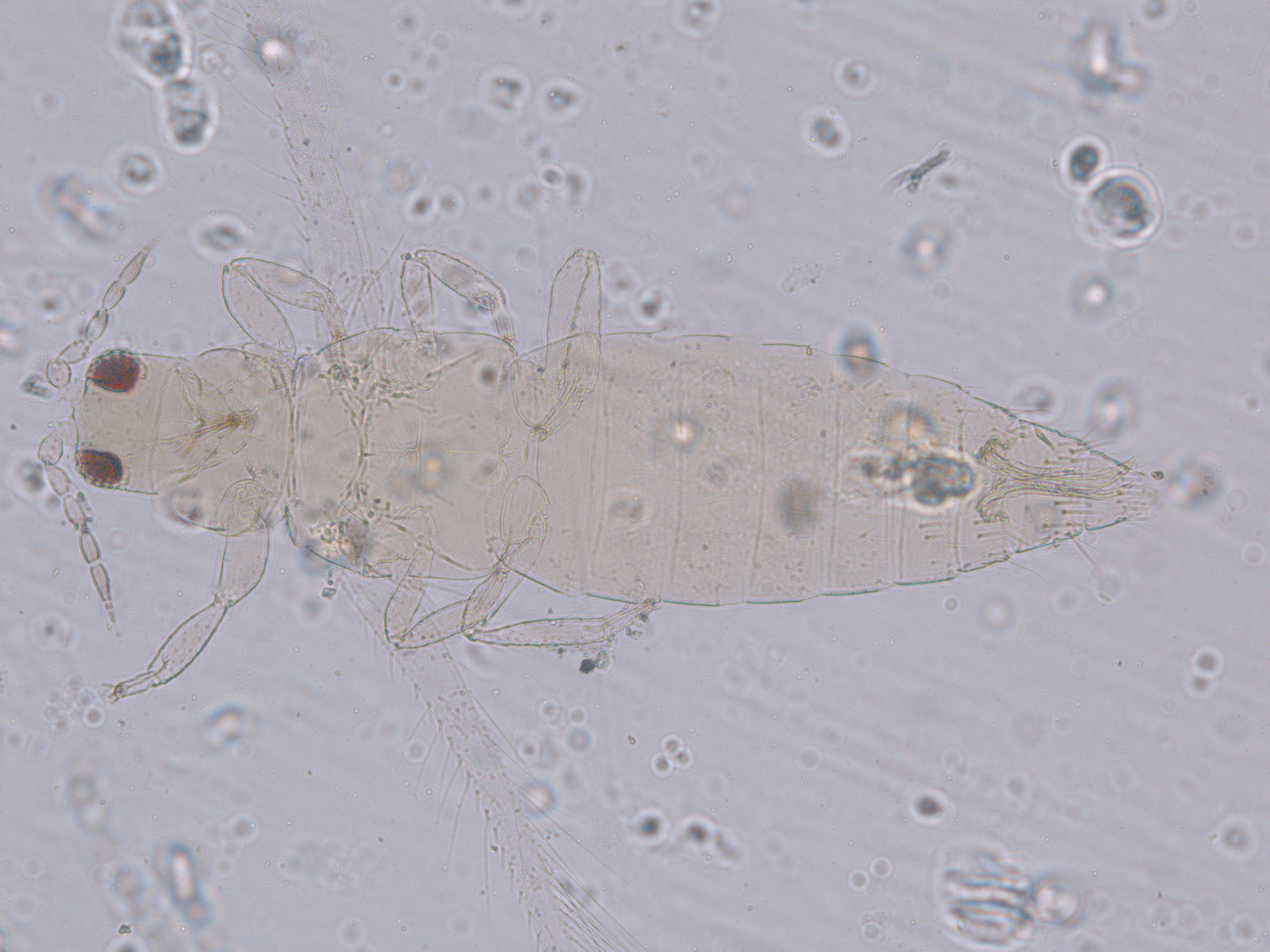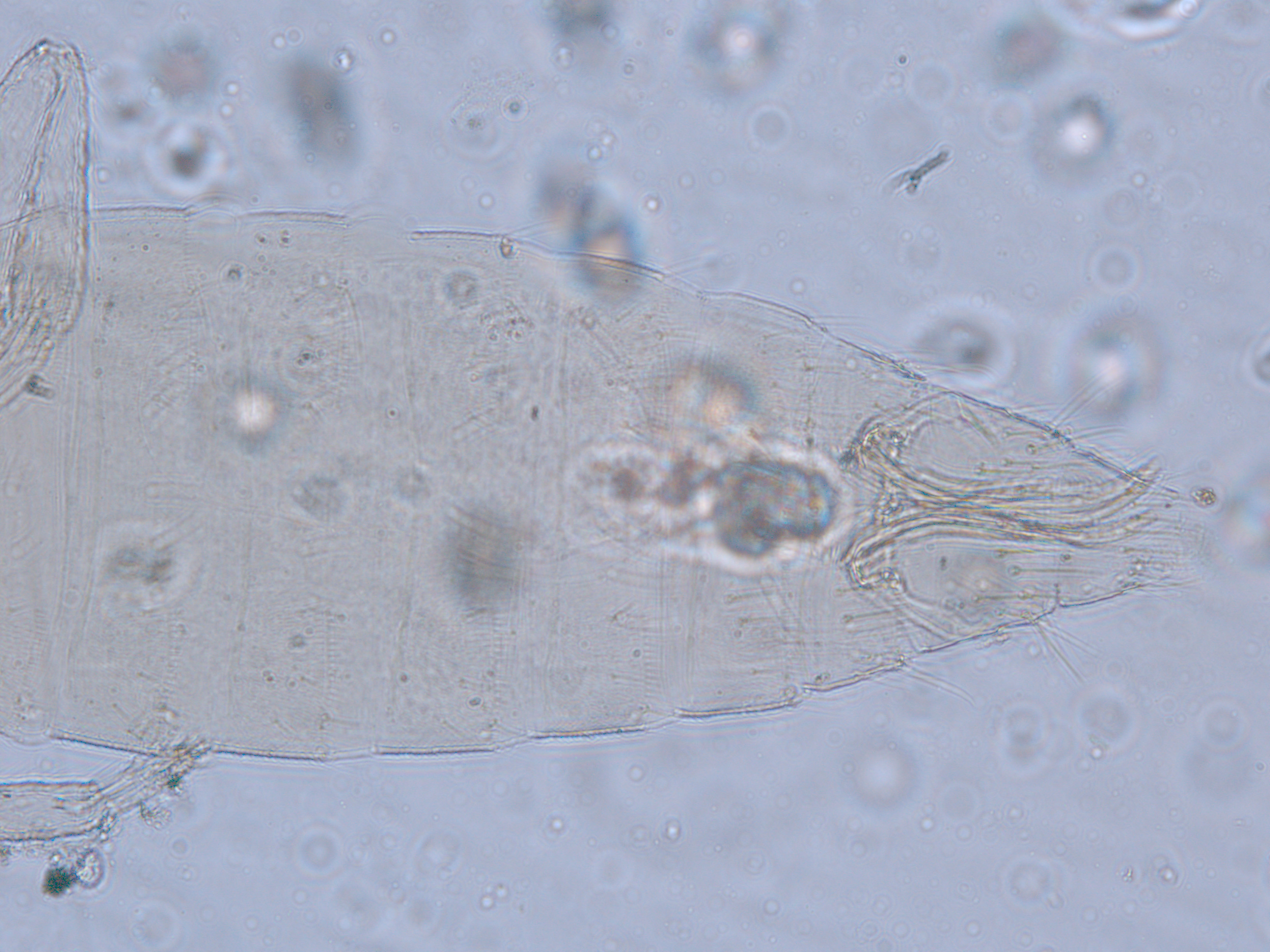 描述:雌虫:体浅黄色,复眼黑红,触角节IV-VI端部和VII-VIII浅灰色;口锥端部、各足跗节端部及产卵器较深。头略短于前胸,前单眼前外侧、单眼间及头后部有交错横线纹;复眼大占据头长的2/3;单眼呈扁三角形排列,位于复眼间略后部;前单眼鬃2对,其1对位于近复眼前内缘,另1对在前单眼前外侧;单眼间鬃位于前、后单眼中途内缘连线上;单眼和复眼后鬃约6对;触角8节,节III略短于IV和VI,节III背和IV腹面有短的叉状感觉锥,节V和VI外端、VI内侧各有简单感觉锥1个;各节近端背面和侧面有较长刚毛,节II-VI有密横排微毛;幕骨小。前胸背板密布横交错线纹于背板,但侧部有3个小的,后中部两侧有一大而横的及一小的无纹区;无长鬃;中胸背板前缘光滑,前部横纹略向前弯,后部两侧侧横线纹各自向中后延伸;前部细孔移位至两侧;前外侧对鬃不长于后中对鬃和后缘对鬃,后中对鬃位于中部,后缘对鬃向前移,接近后中对鬃;后胸背板中部纵网纹清楚,其前和两侧的纵网纹轻而模糊,网纹两侧密布纵弯线纹;前缘对鬃与前中对鬃的长度相似,均在前缘上;前翅前缘鬃22根,前脉鬃6+3,后脉鬃2根,翅瓣前缘端半部鬃4根,后基部有鬃1根,后端缘有长鬃2根;各足各节刚毛相当长但无粗刺。腹部节I-VIII背板两侧密布微毛,中部无毛区较宽,无线纹,约为有毛区宽度的一半;节VII和VIII背板后缘梳完整;细孔距微毛区较劲,中对鬃在其内后方;节IX后缘之前有6对鬃呈弧形排列;节X后部有鬃4对;股节背板和腹板前缘线几乎不可见,腹板节II-VII两侧微毛区宽度总和不及光滑区宽度;节II-VII腹板有细横纹;节II后缘鬃2对,接近后缘,节III-VIII后缘3对鬃较长,远离后缘至前中部,无附属鬃。