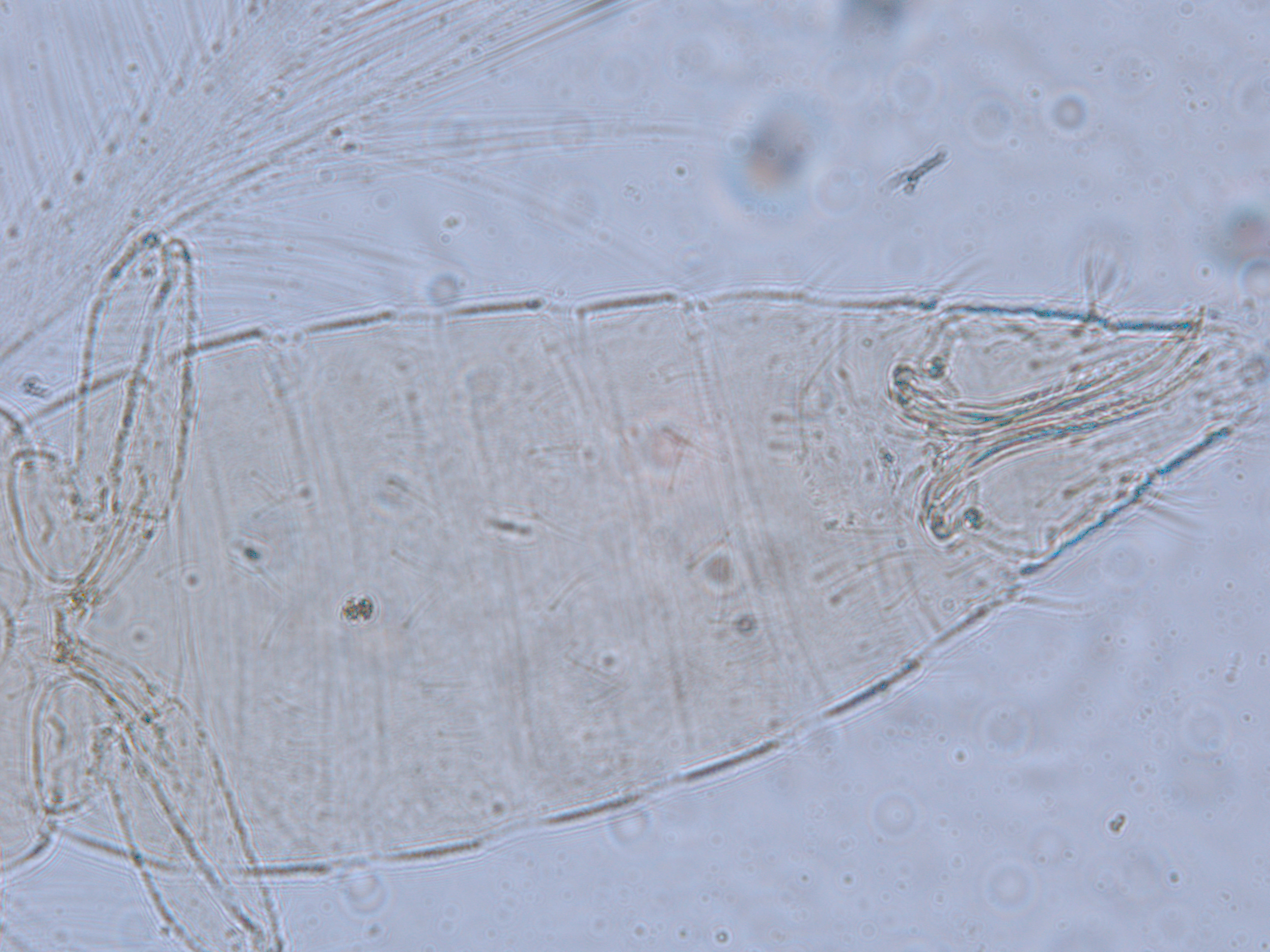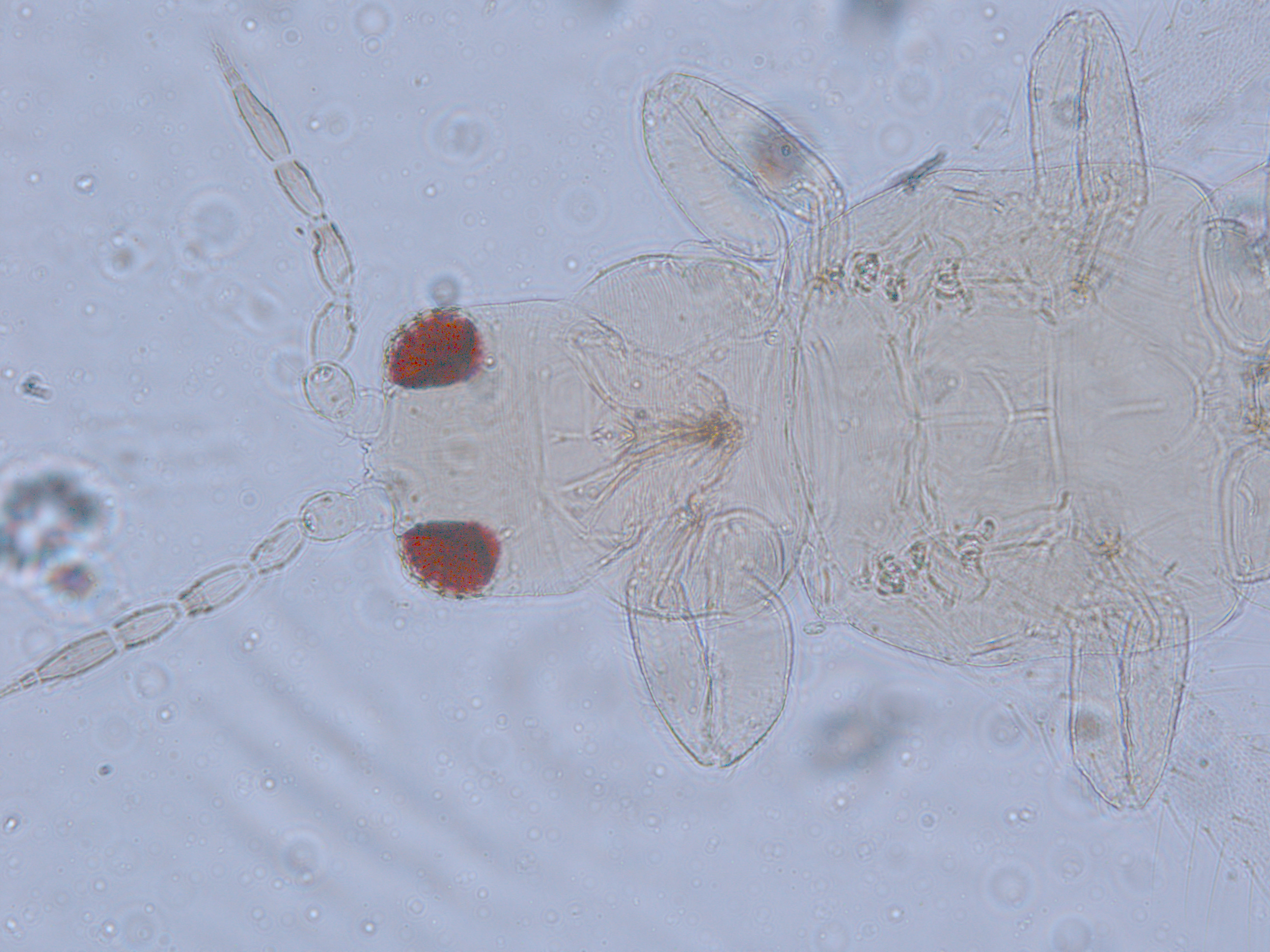 描述:雌虫:体浅黄色,复眼黑红,触角节IV-VI端部和VII-VIII浅灰色;口锥端部、各足跗节端部及产卵器较深。头略短于前胸,前单眼前外侧、单眼间及头后部有交错横线纹;复眼大占据头长的2/3;单眼呈扁三角形排列,位于复眼间略后部;前单眼鬃2对,其1对位于近复眼前内缘,另1对在前单眼前外侧;单眼间鬃位于前、后单眼中途内缘连线上;单眼和复眼后鬃约6对;触角8节,节III略短于IV和VI,节III背和IV腹面有短的叉状感觉锥,节V和VI外端、VI内侧各有简单感觉锥1个;各节近端背面和侧面有较长刚毛,节II-VI有密横排微毛;幕骨小。前胸背板密布横交错线纹于背板,但侧部有3个小的,后中部两侧有一大而横的及一小的无纹区;无长鬃;中胸背板前缘光滑,前部横纹略向前弯,后部两侧侧横线纹各自向中后延伸;前部细孔移位至两侧;前外侧对鬃不长于后中对鬃和后缘对鬃,后中对鬃位于中部,后缘对鬃向前移,接近后中对鬃;后胸背板中部纵网纹清楚,其前和两侧的纵网纹轻而模糊,网纹两侧密布纵弯线纹;前缘对鬃与前中对鬃的长度相似,均在前缘上;前翅前缘鬃22根,前脉鬃6+3,后脉鬃2根,翅瓣前缘端半部鬃4根,后基部有鬃1根,后端缘有长鬃2根;各足各节刚毛相当长但无粗刺。腹部节I-VIII背板两侧密布微毛,中部无毛区较宽,无线纹,约为有毛区宽度的一半;节VII和VIII背板后缘梳完整;细孔距微毛区较劲,中对鬃在其内后方;节IX后缘之前有6对鬃呈弧形排列;节X后部有鬃4对;股节背板和腹板前缘线几乎不可见,腹板节II-VII两侧微毛区宽度总和不及光滑区宽度;节II-VII腹板有细横纹;节II后缘鬃2对,接近后缘,节III-VIII后缘3对鬃较长,远离后缘至前中部,无附属鬃。