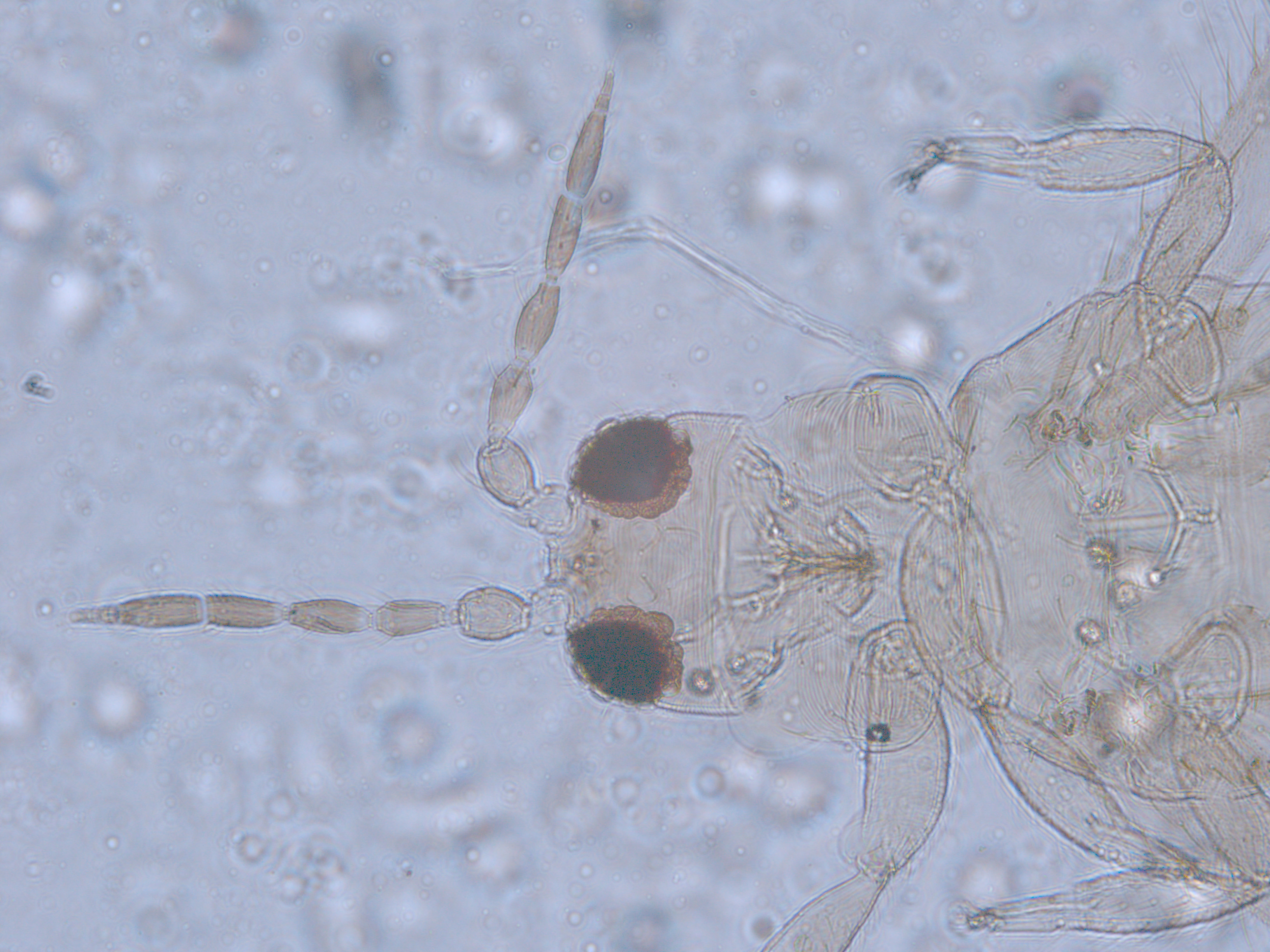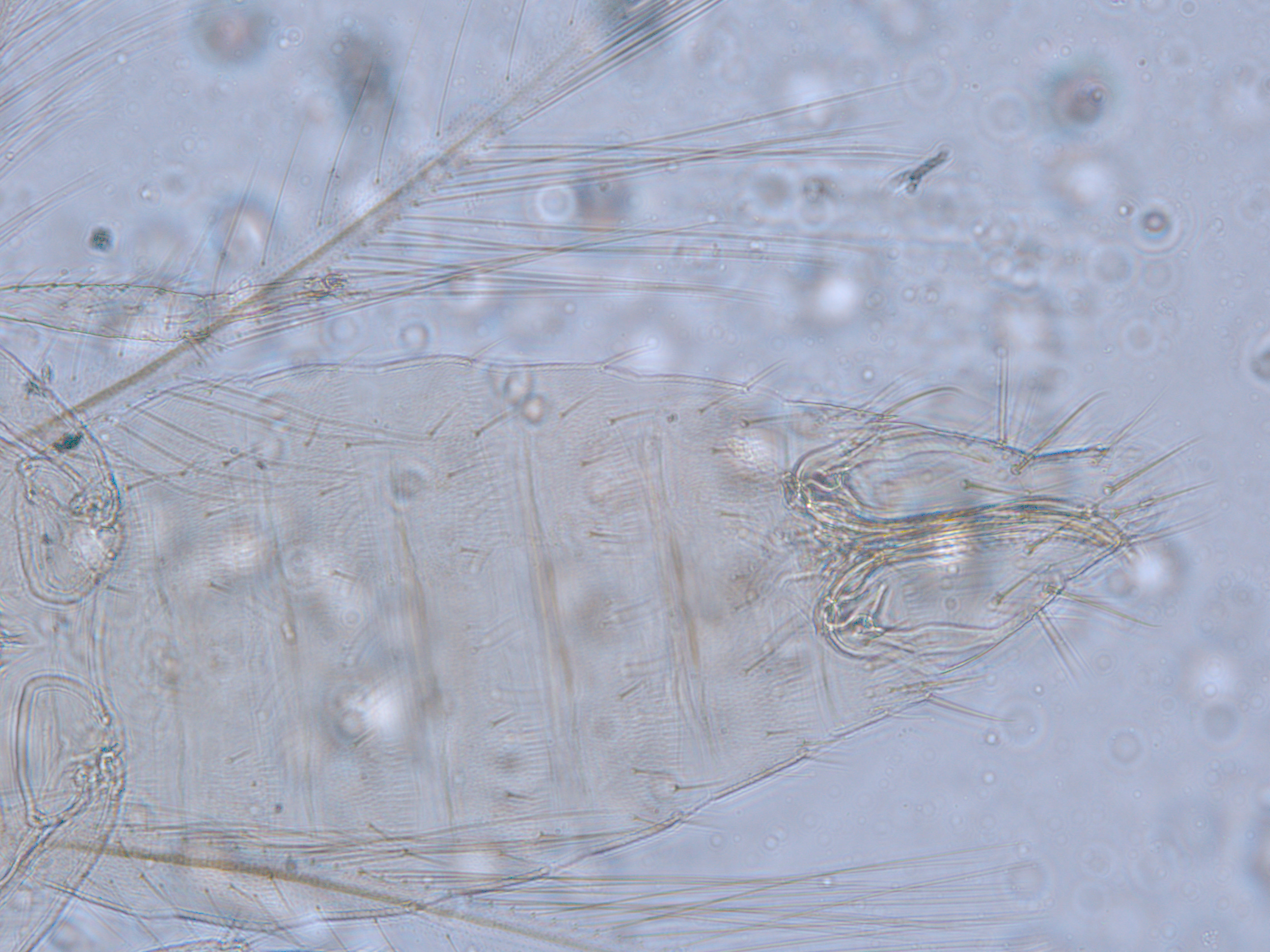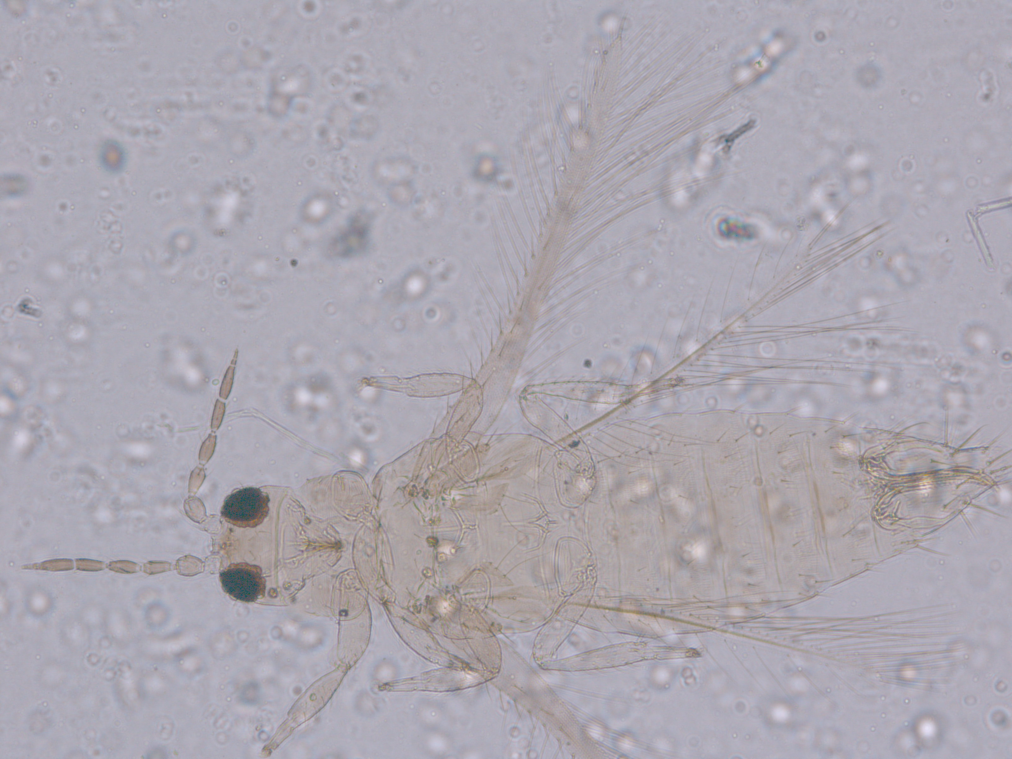 描述:雌虫:体浅黄色,复眼黑红,触角节IV-VI端部和VII-VIII浅灰色;口锥端部、各足跗节端部及产卵器较深。头略短于前胸,前单眼前外侧、单眼间及头后部有交错横线纹;复眼大占据头长的2/3;单眼呈扁三角形排列,位于复眼间略后部;前单眼鬃2对,其1对位于近复眼前内缘,另1对在前单眼前外侧;单眼间鬃位于前、后单眼中途内缘连线上;单眼和复眼后鬃约6对;触角8节,节III略短于IV和VI,节III背和IV腹面有短的叉状感觉锥,节V和VI外端、VI内侧各有简单感觉锥1个;各节近端背面和侧面有较长刚毛,节II-VI有密横排微毛;幕骨小。前胸背板密布横交错线纹于背板,但侧部有3个小的,后中部两侧有一大而横的及一小的无纹区;无长鬃;中胸背板前缘光滑,前部横纹略向前弯,后部两侧侧横线纹各自向中后延伸;前部细孔移位至两侧;前外侧对鬃不长于后中对鬃和后缘对鬃,后中对鬃位于中部,后缘对鬃向前移,接近后中对鬃;后胸背板中部纵网纹清楚,其前和两侧的纵网纹轻而模糊,网纹两侧密布纵弯线纹;前缘对鬃与前中对鬃的长度相似,均在前缘上;前翅前缘鬃22根,前脉鬃6+3,后脉鬃2根,翅瓣前缘端半部鬃4根,后基部有鬃1根,后端缘有长鬃2根;各足各节刚毛相当长但无粗刺。腹部节I-VIII背板两侧密布微毛,中部无毛区较宽,无线纹,约为有毛区宽度的一半;节VII和VIII背板后缘梳完整;细孔距微毛区较劲,中对鬃在其内后方;节IX后缘之前有6对鬃呈弧形排列;节X后部有鬃4对;股节背板和腹板前缘线几乎不可见,腹板节II-VII两侧微毛区宽度总和不及光滑区宽度;节II-VII腹板有细横纹;节II后缘鬃2对,接近后缘,节III-VIII后缘3对鬃较长,远离后缘至前中部,无附属鬃。