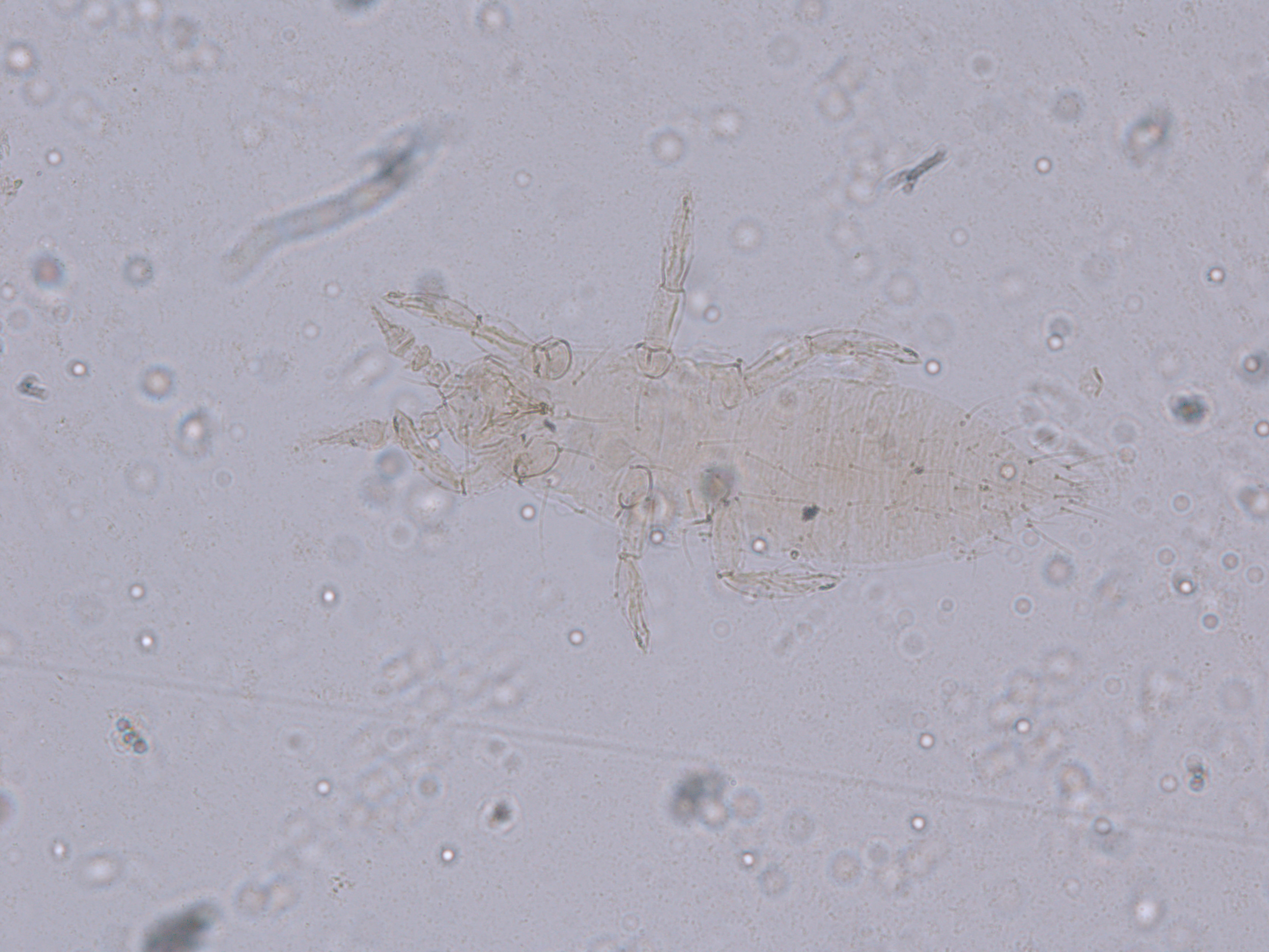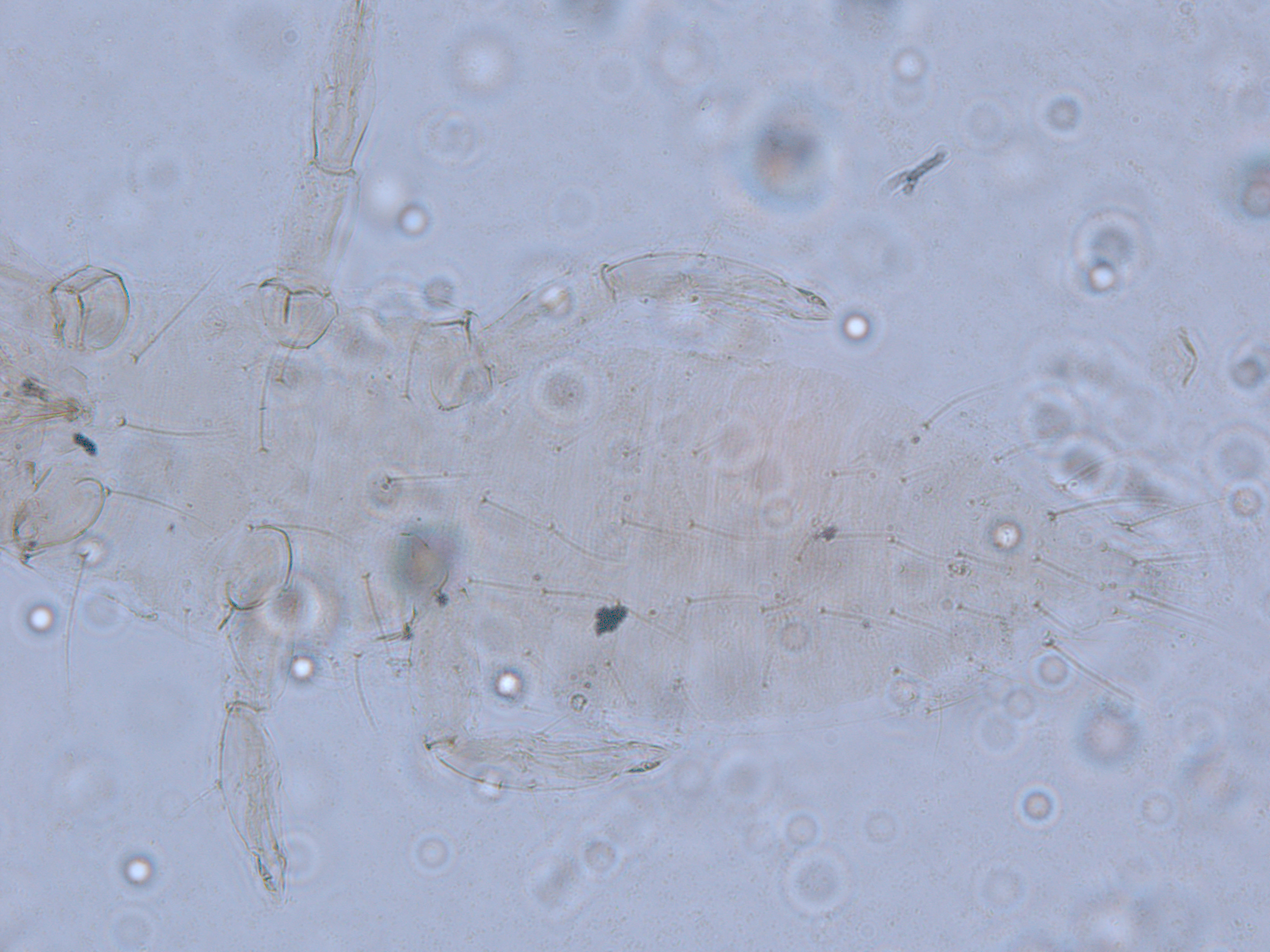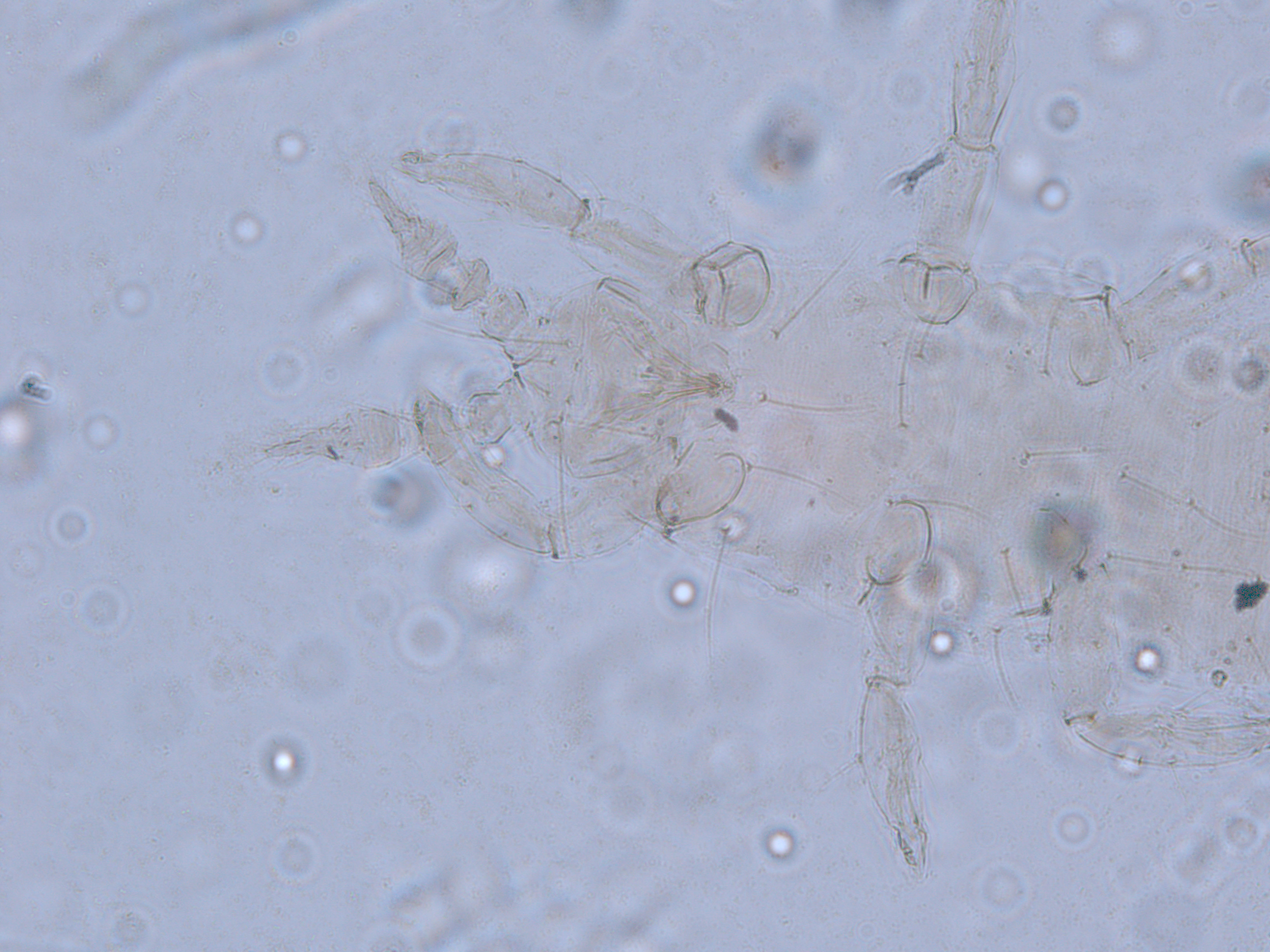 描述:二龄若虫:体乳黄色,复眼红色,触角节I浅白色,II-VII浅灰色;口锥端部橙黄色;头短于前胸;单眼缺;头背光滑;复眼间鬃1对,后鬃1对;触角7节,各基部数节的刚毛较短,端部2节的刚毛较长,节I-II光滑,节III约等长于IV,边缘具覆瓦状缺刻,端部有2轮微毛,节IV最粗,纺锤状,有5轮微毛,外端有1粗的,内下有1细长的简单感觉锥,节V-VI外侧各有1较细长感觉锥。头腹面约8根短刚毛;头腹面、胸部和腹部背板和腹板密布极微颗粒,但腹部节IX-X颗粒较稀疏;腹部节背板前中部具6对短鬃,在节IX-X的相对长些;各节腹板后缘有短鬃6对;各足刚毛比胸部和腹部背板刚毛长;所有刚毛端部尖细。