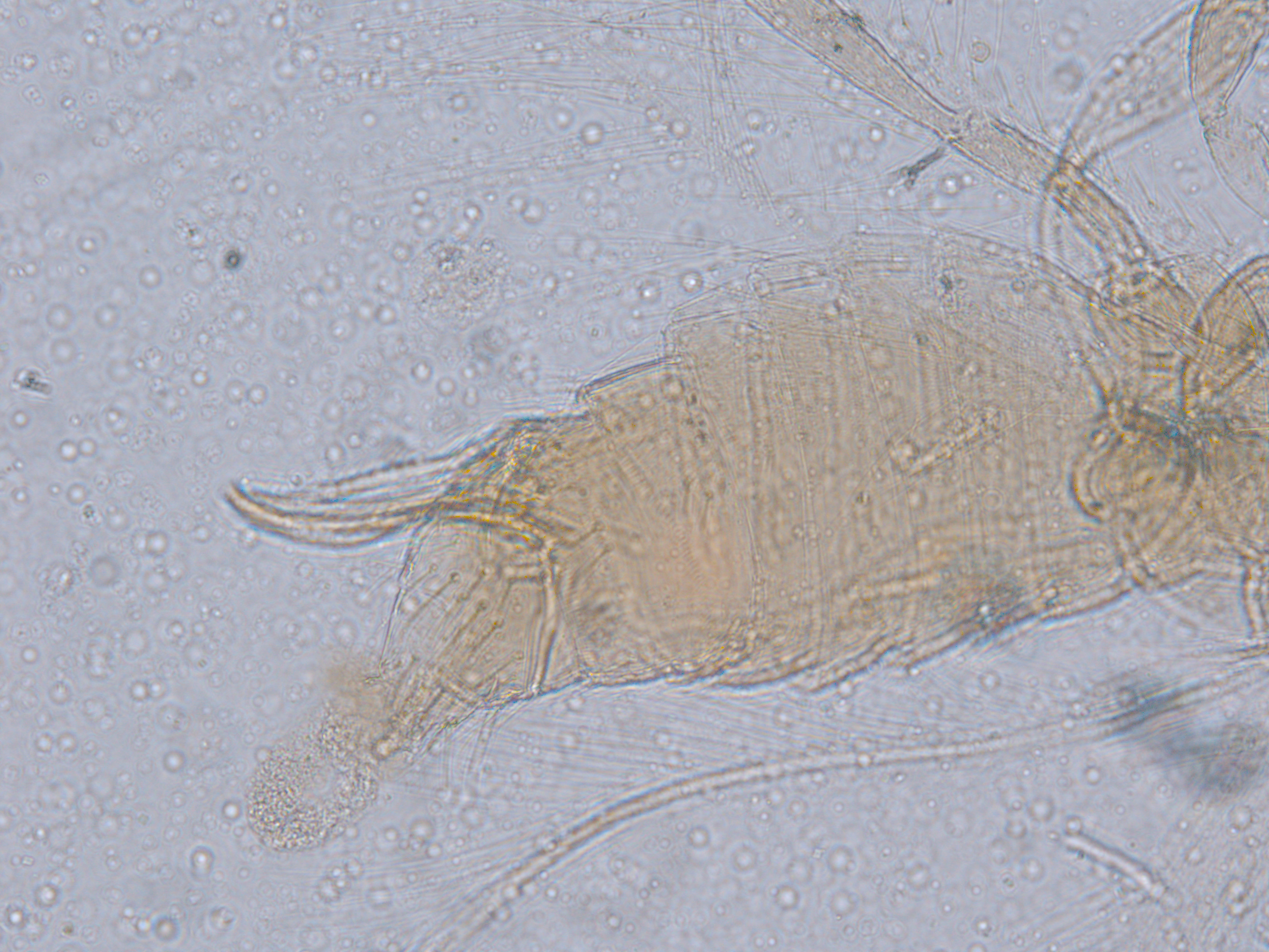 描述:雌虫:体浅黄色,复眼黑红,触角节IV-VI端部和VII-VIII浅灰色;口锥端部、各足跗节端部及产卵器较深。头略短于前胸,前单眼前外侧、单眼间及头后部有交错横线纹;复眼大占据头长的2/3;单眼呈扁三角形排列,位于复眼间略后部;前单眼鬃2对,其1对位于近复眼前内缘,另1对在前单眼前外侧;单眼间鬃位于前、后单眼中途内缘连线上;单眼和复眼后鬃约6对;触角8节,节III略短于IV和VI,节III背和IV腹面有短的叉状感觉锥,节V和VI外端、VI内侧各有简单感觉锥1个;各节近端背面和侧面有较长刚毛,节II-VI有密横排微毛;幕骨小。前胸背板密布横交错线纹于背板,但侧部有3个小的,后中部两侧有一大而横的及一小的无纹区;无长鬃;中胸背板前缘光滑,前部横纹略向前弯,后部两侧侧横线纹各自向中后延伸;前部细孔移位至两侧;前外侧对鬃不长于后中对鬃和后缘对鬃,后中对鬃位于中部,后缘对鬃向前移,接近后中对鬃;后胸背板中部纵网纹清楚,其前和两侧的纵网纹轻而模糊,网纹两侧密布纵弯线纹;前缘对鬃与前中对鬃的长度相似,均在前缘上;前翅前缘鬃22根,前脉鬃6+3,后脉鬃2根,翅瓣前缘端半部鬃4根,后基部有鬃1根,后端缘有长鬃2根;各足各节刚毛相当长但无粗刺。腹部节I-VIII背板两侧密布微毛,中部无毛区较宽,无线纹,约为有毛区宽度的一半;节VII和VIII背板后缘梳完整;细孔距微毛区较劲,中对鬃在其内后方;节IX后缘之前有6对鬃呈弧形排列;节X后部有鬃4对;股节背板和腹板前缘线几乎不可见,腹板节II-VII两侧微毛区宽度总和不及光滑区宽度;节II-VII腹板有细横纹;节II后缘鬃2对,接近后缘,节III-VIII后缘3对鬃较长,远离后缘至前中部,无附属鬃。