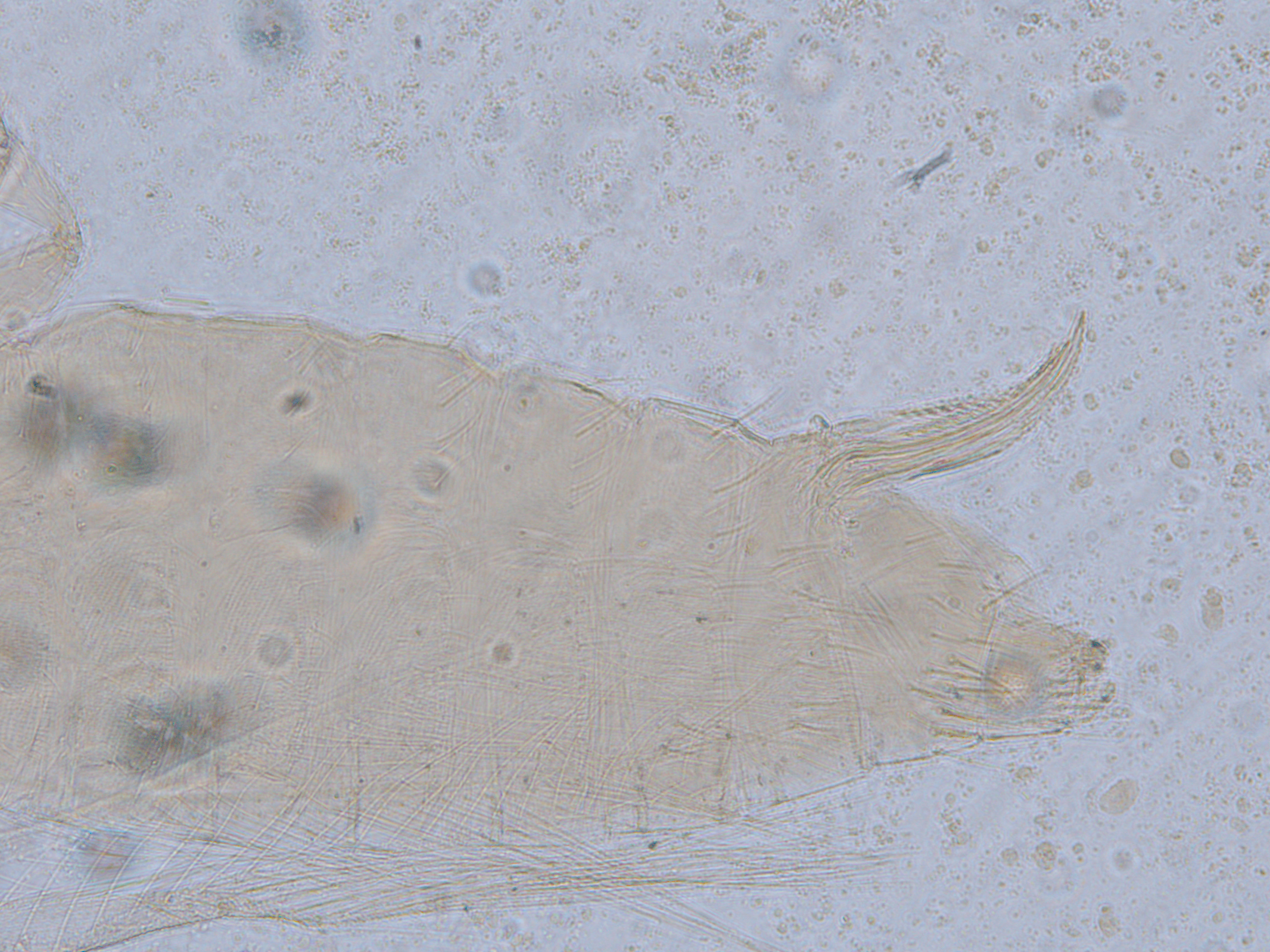 描述:雌虫:体浅黄色,复眼黑红,触角节IV-VI端部和VII-VIII浅灰色;口锥端部、各足跗节端部及产卵器较深。头略短于前胸,前单眼前外侧、单眼间及头后部有交错横线纹;复眼大占据头长的2/3;单眼呈扁三角形排列,位于复眼间略后部;前单眼鬃2对,其1对位于近复眼前内缘,另1对在前单眼前外侧;单眼间鬃位于前、后单眼中途内缘连线上;单眼和复眼后鬃约6对;触角8节,节III略短于IV和VI,节III背和IV腹面有短的叉状感觉锥,节V和VI外端、VI内侧各有简单感觉锥1个;各节近端背面和侧面有较长刚毛,节II-VI有密横排微毛;幕骨小。前胸背板密布横交错线纹于背板,但侧部有3个小的,后中部两侧有一大而横的及一小的无纹区;无长鬃;中胸背板前缘光滑,前部横纹略向前弯,后部两侧侧横线纹各自向中后延伸;前部细孔移位至两侧;前外侧对鬃不长于后中对鬃和后缘对鬃,后中对鬃位于中部,后缘对鬃向前移,接近后中对鬃;后胸背板中部纵网纹清楚,其前和两侧的纵网纹轻而模糊,网纹两侧密布纵弯线纹;前缘对鬃与前中对鬃的长度相似,均在前缘上;前翅前缘鬃22根,前脉鬃6+3,后脉鬃2根,翅瓣前缘端半部鬃4根,后基部有鬃1根,后端缘有长鬃2根;各足各节刚毛相当长但无粗刺。腹部节I-VIII背板两侧密布微毛,中部无毛区较宽,无线纹,约为有毛区宽度的一半;节VII和VIII背板后缘梳完整;细孔距微毛区较劲,中对鬃在其内后方;节IX后缘之前有6对鬃呈弧形排列;节X后部有鬃4对;股节背板和腹板前缘线几乎不可见,腹板节II-VII两侧微毛区宽度总和不及光滑区宽度;节II-VII腹板有细横纹;节II后缘鬃2对,接近后缘,节III-VIII后缘3对鬃较长,远离后缘至前中部,无附属鬃。
