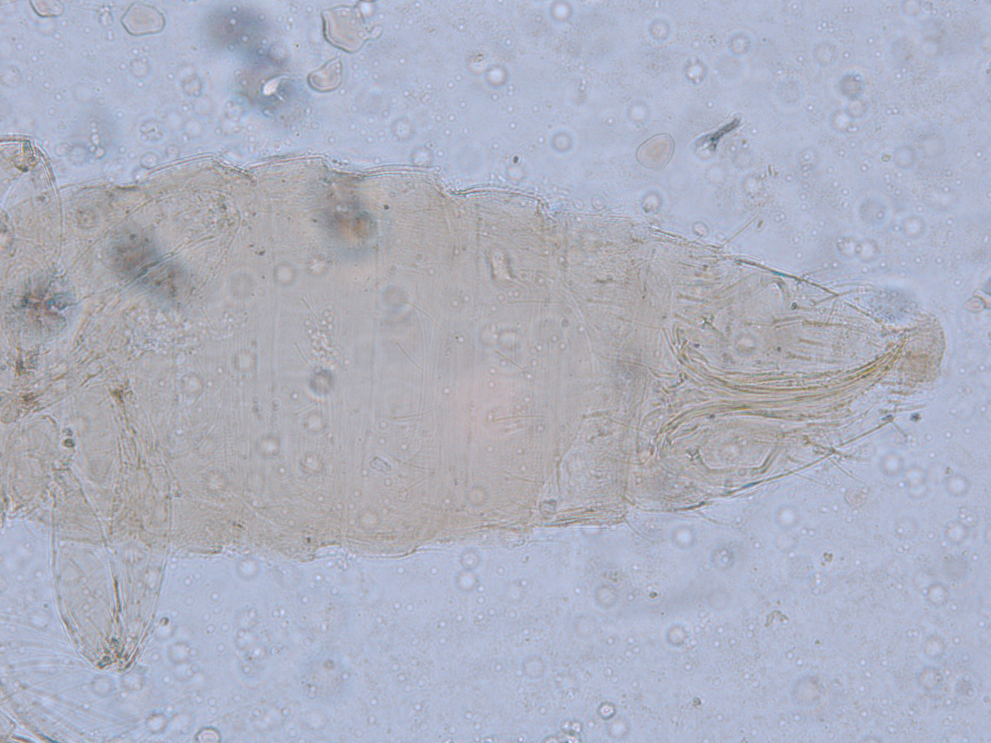 描述:雌虫:体浅黄色,复眼黑红,触角节IV-VI端部和VII-VIII浅灰色;口锥端部、各足跗节端部及产卵器较深。头略短于前胸,前单眼前外侧、单眼间及头后部有交错横线纹;复眼大占据头长的2/3;单眼呈扁三角形排列,位于复眼间略后部;前单眼鬃2对,其1对位于近复眼前内缘,另1对在前单眼前外侧;单眼间鬃位于前、后单眼中途内缘连线上;单眼和复眼后鬃约6对;触角8节,节III略短于IV和VI,节III背和IV腹面有短的叉状感觉锥,节V和VI外端、VI内侧各有简单感觉锥1个;各节近端背面和侧面有较长刚毛,节II-VI有密横排微毛;幕骨小。前胸背板密布横交错线纹于背板,但侧部有3个小的,后中部两侧有一大而横的及一小的无纹区;无长鬃;中胸背板前缘光滑,前部横纹略向前弯,后部两侧侧横线纹各自向中后延伸;前部细孔移位至两侧;前外侧对鬃不长于后中对鬃和后缘对鬃,后中对鬃位于中部,后缘对鬃向前移,接近后中对鬃;后胸背板中部纵网纹清楚,其前和两侧的纵网纹轻而模糊,网纹两侧密布纵弯线纹;前缘对鬃与前中对鬃的长度相似,均在前缘上;前翅前缘鬃22根,前脉鬃6+3,后脉鬃2根,翅瓣前缘端半部鬃4根,后基部有鬃1根,后端缘有长鬃2根;各足各节刚毛相当长但无粗刺。腹部节I-VIII背板两侧密布微毛,中部无毛区较宽,无线纹,约为有毛区宽度的一半;节VII和VIII背板后缘梳完整;细孔距微毛区较劲,中对鬃在其内后方;节IX后缘之前有6对鬃呈弧形排列;节X后部有鬃4对;股节背板和腹板前缘线几乎不可见,腹板节II-VII两侧微毛区宽度总和不及光滑区宽度;节II-VII腹板有细横纹;节II后缘鬃2对,接近后缘,节III-VIII后缘3对鬃较长,远离后缘至前中部,无附属鬃。