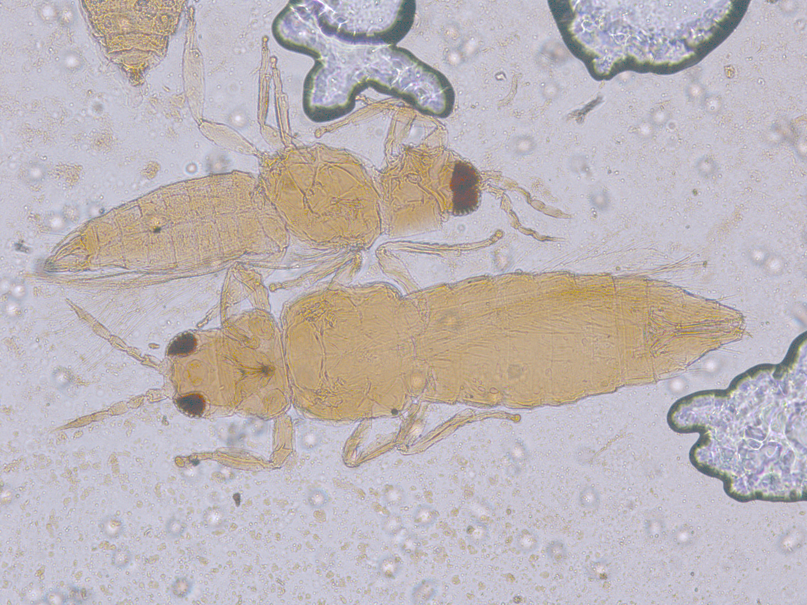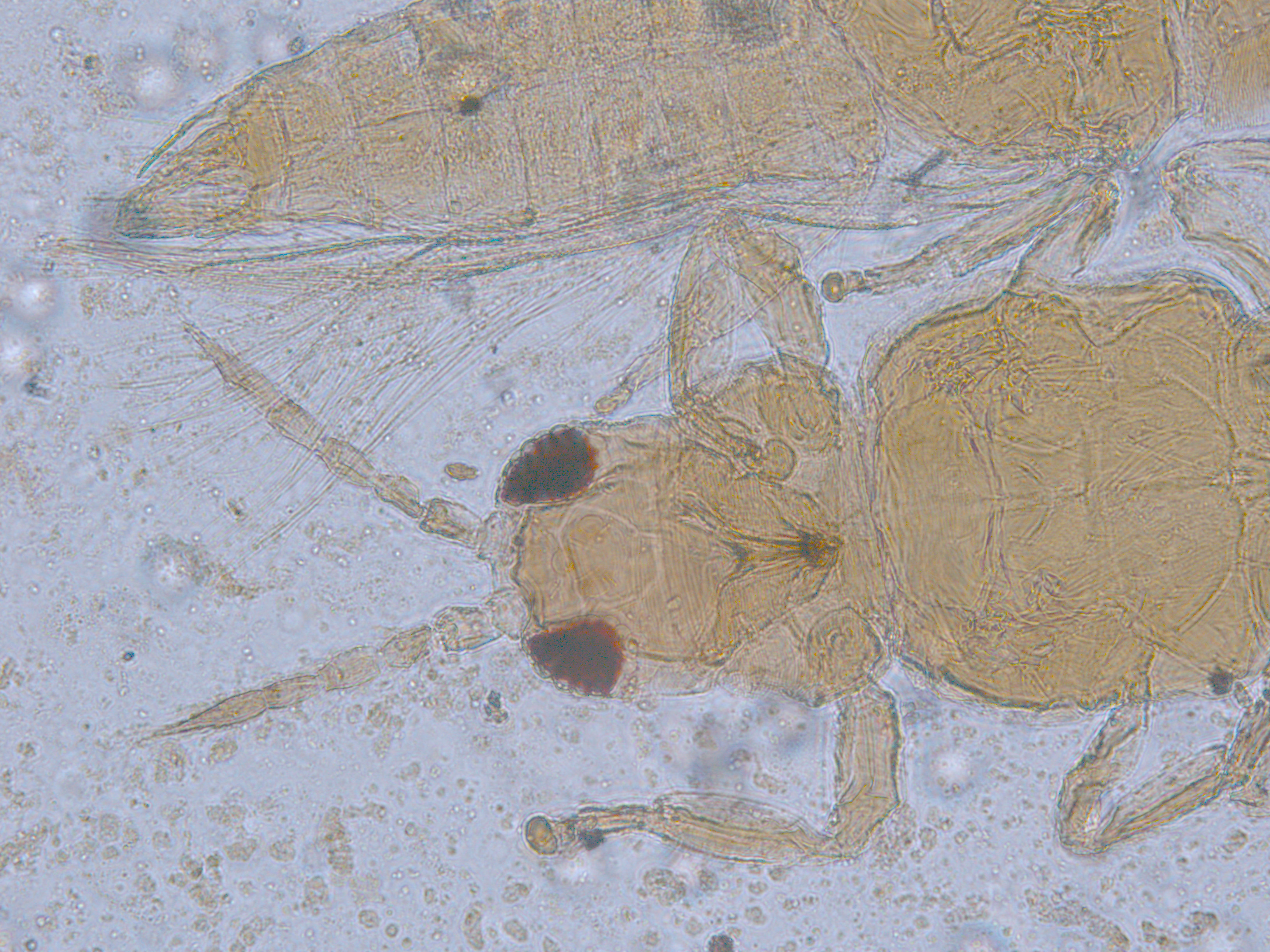 描述:雌虫:体浅黄色,复眼黑红,触角节IV-VI端部和VII-VIII浅灰色;口锥端部、各足跗节端部及产卵器较深。头略短于前胸,前单眼前外侧、单眼间及头后部有交错横线纹;复眼大占据头长的2/3;单眼呈扁三角形排列,位于复眼间略后部;前单眼鬃2对,其1对位于近复眼前内缘,另1对在前单眼前外侧;单眼间鬃位于前、后单眼中途内缘连线上;单眼和复眼后鬃约6对;触角8节,节III略短于IV和VI,节III背和IV腹面有短的叉状感觉锥,节V和VI外端、VI内侧各有简单感觉锥1个;各节近端背面和侧面有较长刚毛,节II-VI有密横排微毛;幕骨小。前胸背板密布横交错线纹于背板,但侧部有3个小的,后中部两侧有一大而横的及一小的无纹区;无长鬃;中胸背板前缘光滑,前部横纹略向前弯,后部两侧侧横线纹各自向中后延伸;前部细孔移位至两侧;前外侧对鬃不长于后中对鬃和后缘对鬃,后中对鬃位于中部,后缘对鬃向前移,接近后中对鬃;后胸背板中部纵网纹清楚,其前和两侧的纵网纹轻而模糊,网纹两侧密布纵弯线纹;前缘对鬃与前中对鬃的长度相似,均在前缘上;前翅前缘鬃22根,前脉鬃6+3,后脉鬃2根,翅瓣前缘端半部鬃4根,后基部有鬃1根,后端缘有长鬃2根;各足各节刚毛相当长但无粗刺。腹部节I-VIII背板两侧密布微毛,中部无毛区较宽,无线纹,约为有毛区宽度的一半;节VII和VIII背板后缘梳完整;细孔距微毛区较劲,中对鬃在其内后方;节IX后缘之前有6对鬃呈弧形排列;节X后部有鬃4对;股节背板和腹板前缘线几乎不可见,腹板节II-VII两侧微毛区宽度总和不及光滑区宽度;节II-VII腹板有细横纹;节II后缘鬃2对,接近后缘,节III-VIII后缘3对鬃较长,远离后缘至前中部,无附属鬃。