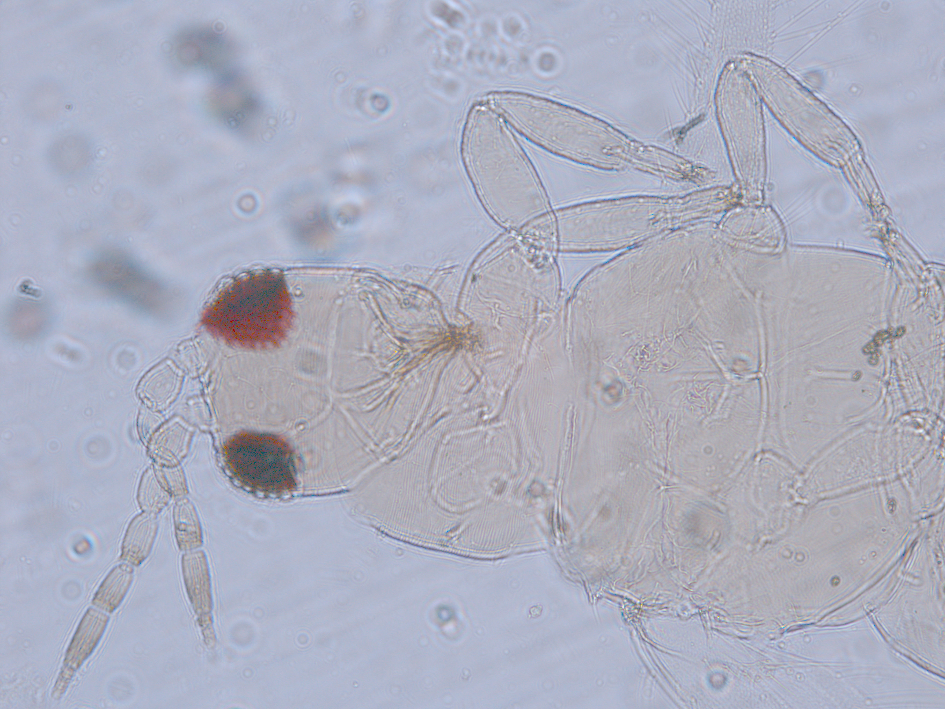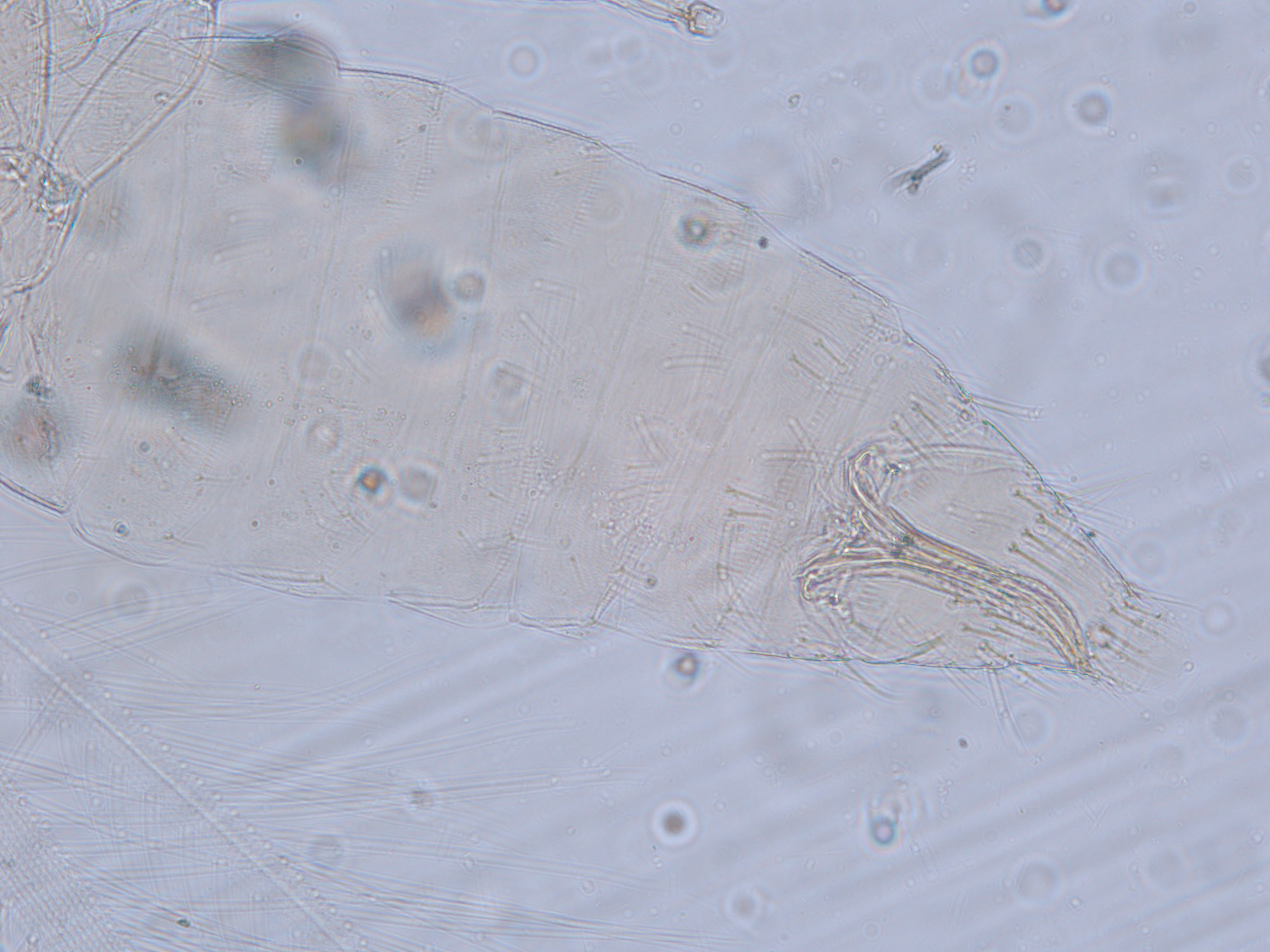 描述:雌虫:体浅黄色,复眼黑红,触角节IV-VI端部和VII-VIII浅灰色;口锥端部、各足跗节端部及产卵器较深。头略短于前胸,前单眼前外侧、单眼间及头后部有交错横线纹;复眼大占据头长的2/3;单眼呈扁三角形排列,位于复眼间略后部;前单眼鬃2对,其1对位于近复眼前内缘,另1对在前单眼前外侧;单眼间鬃位于前、后单眼中途内缘连线上;单眼和复眼后鬃约6对;触角8节,节III略短于IV和VI,节III背和IV腹面有短的叉状感觉锥,节V和VI外端、VI内侧各有简单感觉锥1个;各节近端背面和侧面有较长刚毛,节II-VI有密横排微毛;幕骨小。前胸背板密布横交错线纹于背板,但侧部有3个小的,后中部两侧有一大而横的及一小的无纹区;无长鬃;中胸背板前缘光滑,前部横纹略向前弯,后部两侧侧横线纹各自向中后延伸;前部细孔移位至两侧;前外侧对鬃不长于后中对鬃和后缘对鬃,后中对鬃位于中部,后缘对鬃向前移,接近后中对鬃;后胸背板中部纵网纹清楚,其前和两侧的纵网纹轻而模糊,网纹两侧密布纵弯线纹;前缘对鬃与前中对鬃的长度相似,均在前缘上;前翅前缘鬃22根,前脉鬃6+3,后脉鬃2根,翅瓣前缘端半部鬃4根,后基部有鬃1根,后端缘有长鬃2根;各足各节刚毛相当长但无粗刺。腹部节I-VIII背板两侧密布微毛,中部无毛区较宽,无线纹,约为有毛区宽度的一半;节VII和VIII背板后缘梳完整;细孔距微毛区较劲,中对鬃在其内后方;节IX后缘之前有6对鬃呈弧形排列;节X后部有鬃4对;股节背板和腹板前缘线几乎不可见,腹板节II-VII两侧微毛区宽度总和不及光滑区宽度;节II-VII腹板有细横纹;节II后缘鬃2对,接近后缘,节III-VIII后缘3对鬃较长,远离后缘至前中部,无附属鬃。