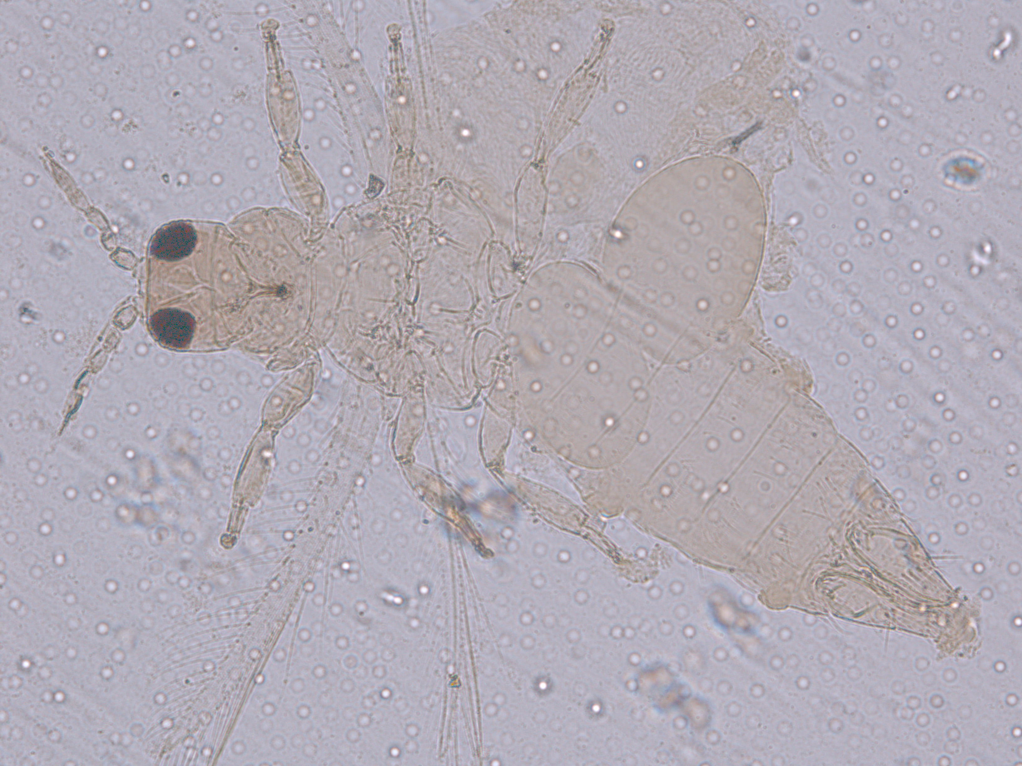 描述:雌虫:体浅黄色,复眼黑红,触角节IV-VI端部和VII-VIII浅灰色;口锥端部、各足跗节端部及产卵器较深。头略短于前胸,前单眼前外侧、单眼间及头后部有交错横线纹;复眼大占据头长的2/3;单眼呈扁三角形排列,位于复眼间略后部;前单眼鬃2对,其1对位于近复眼前内缘,另1对在前单眼前外侧;单眼间鬃位于前、后单眼中途内缘连线上;单眼和复眼后鬃约6对;触角8节,节III略短于IV和VI,节III背和IV腹面有短的叉状感觉锥,节V和VI外端、VI内侧各有简单感觉锥1个;各节近端背面和侧面有较长刚毛,节II-VI有密横排微毛;幕骨小。前胸背板密布横交错线纹于背板,但侧部有3个小的,后中部两侧有一大而横的及一小的无纹区;无长鬃;中胸背板前缘光滑,前部横纹略向前弯,后部两侧侧横线纹各自向中后延伸;前部细孔移位至两侧;前外侧对鬃不长于后中对鬃和后缘对鬃,后中对鬃位于中部,后缘对鬃向前移,接近后中对鬃;后胸背板中部纵网纹清楚,其前和两侧的纵网纹轻而模糊,网纹两侧密布纵弯线纹;前缘对鬃与前中对鬃的长度相似,均在前缘上;前翅前缘鬃22根,前脉鬃6+3,后脉鬃2根,翅瓣前缘端半部鬃4根,后基部有鬃1根,后端缘有长鬃2根;各足各节刚毛相当长但无粗刺。腹部节I-VIII背板两侧密布微毛,中部无毛区较宽,无线纹,约为有毛区宽度的一半;节VII和VIII背板后缘梳完整;细孔距微毛区较劲,中对鬃在其内后方;节IX后缘之前有6对鬃呈弧形排列;节X后部有鬃4对;股节背板和腹板前缘线几乎不可见,腹板节II-VII两侧微毛区宽度总和不及光滑区宽度;节II-VII腹板有细横纹;节II后缘鬃2对,接近后缘,节III-VIII后缘3对鬃较长,远离后缘至前中部,无附属鬃。