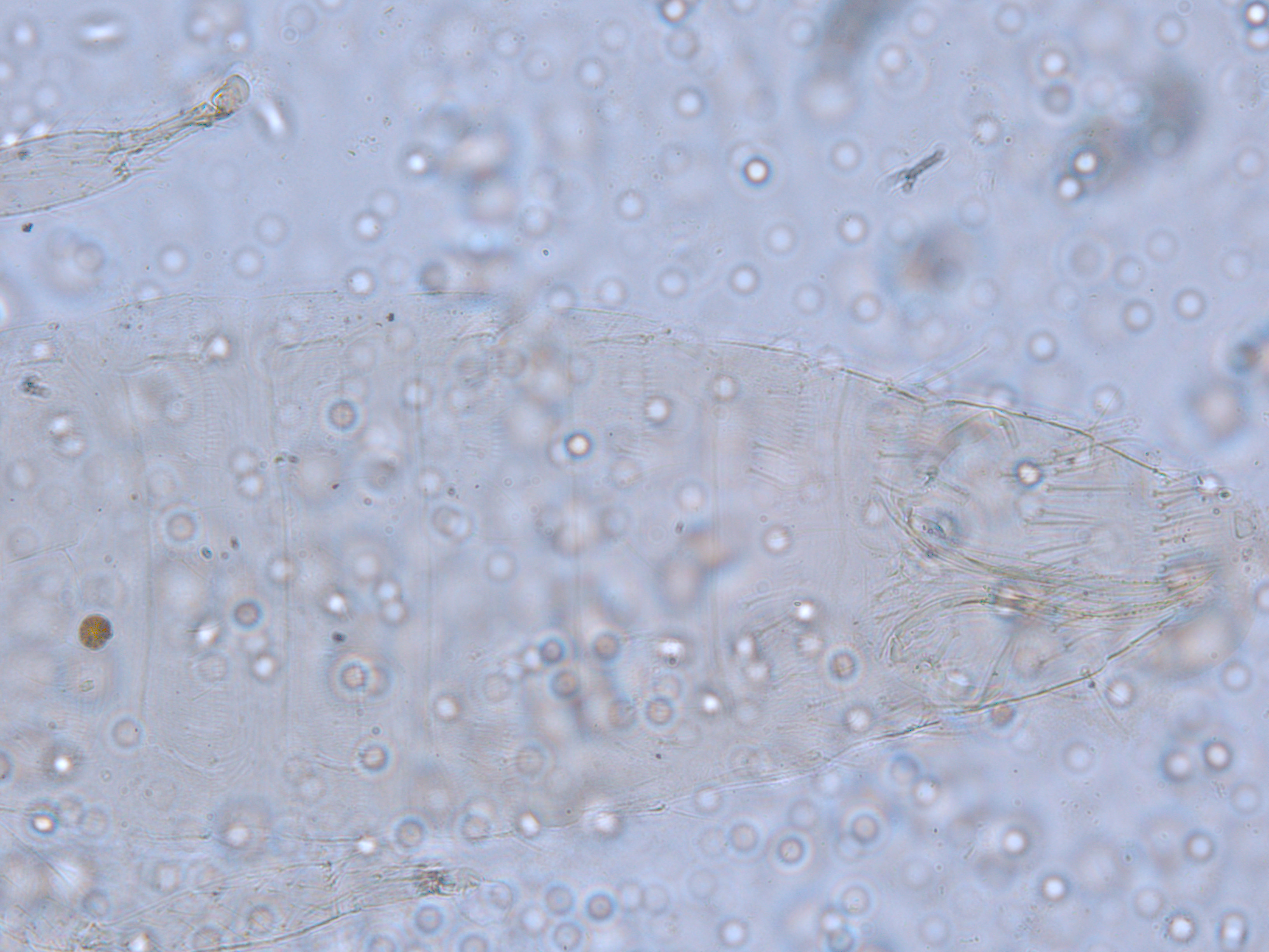 描述:雌虫:体浅黄色,复眼黑红,触角节IV-VI端部和VII-VIII浅灰色;口锥端部、各足跗节端部及产卵器较深。头略短于前胸,前单眼前外侧、单眼间及头后部有交错横线纹;复眼大占据头长的2/3;单眼呈扁三角形排列,位于复眼间略后部;前单眼鬃2对,其1对位于近复眼前内缘,另1对在前单眼前外侧;单眼间鬃位于前、后单眼中途内缘连线上;单眼和复眼后鬃约6对;触角8节,节III略短于IV和VI,节III背和IV腹面有短的叉状感觉锥,节V和VI外端、VI内侧各有简单感觉锥1个;各节近端背面和侧面有较长刚毛,节II-VI有密横排微毛;幕骨小。前胸背板密布横交错线纹于背板,但侧部有3个小的,后中部两侧有一大而横的及一小的无纹区;无长鬃;中胸背板前缘光滑,前部横纹略向前弯,后部两侧侧横线纹各自向中后延伸;前部细孔移位至两侧;前外侧对鬃不长于后中对鬃和后缘对鬃,后中对鬃位于中部,后缘对鬃向前移,接近后中对鬃;后胸背板中部纵网纹清楚,其前和两侧的纵网纹轻而模糊,网纹两侧密布纵弯线纹;前缘对鬃与前中对鬃的长度相似,均在前缘上;前翅前缘鬃22根,前脉鬃6+3,后脉鬃2根,翅瓣前缘端半部鬃4根,后基部有鬃1根,后端缘有长鬃2根;各足各节刚毛相当长但无粗刺。腹部节I-VIII背板两侧密布微毛,中部无毛区较宽,无线纹,约为有毛区宽度的一半;节VII和VIII背板后缘梳完整;细孔距微毛区较劲,中对鬃在其内后方;节IX后缘之前有6对鬃呈弧形排列;节X后部有鬃4对;股节背板和腹板前缘线几乎不可见,腹板节II-VII两侧微毛区宽度总和不及光滑区宽度;节II-VII腹板有细横纹;节II后缘鬃2对,接近后缘,节III-VIII后缘3对鬃较长,远离后缘至前中部,无附属鬃。