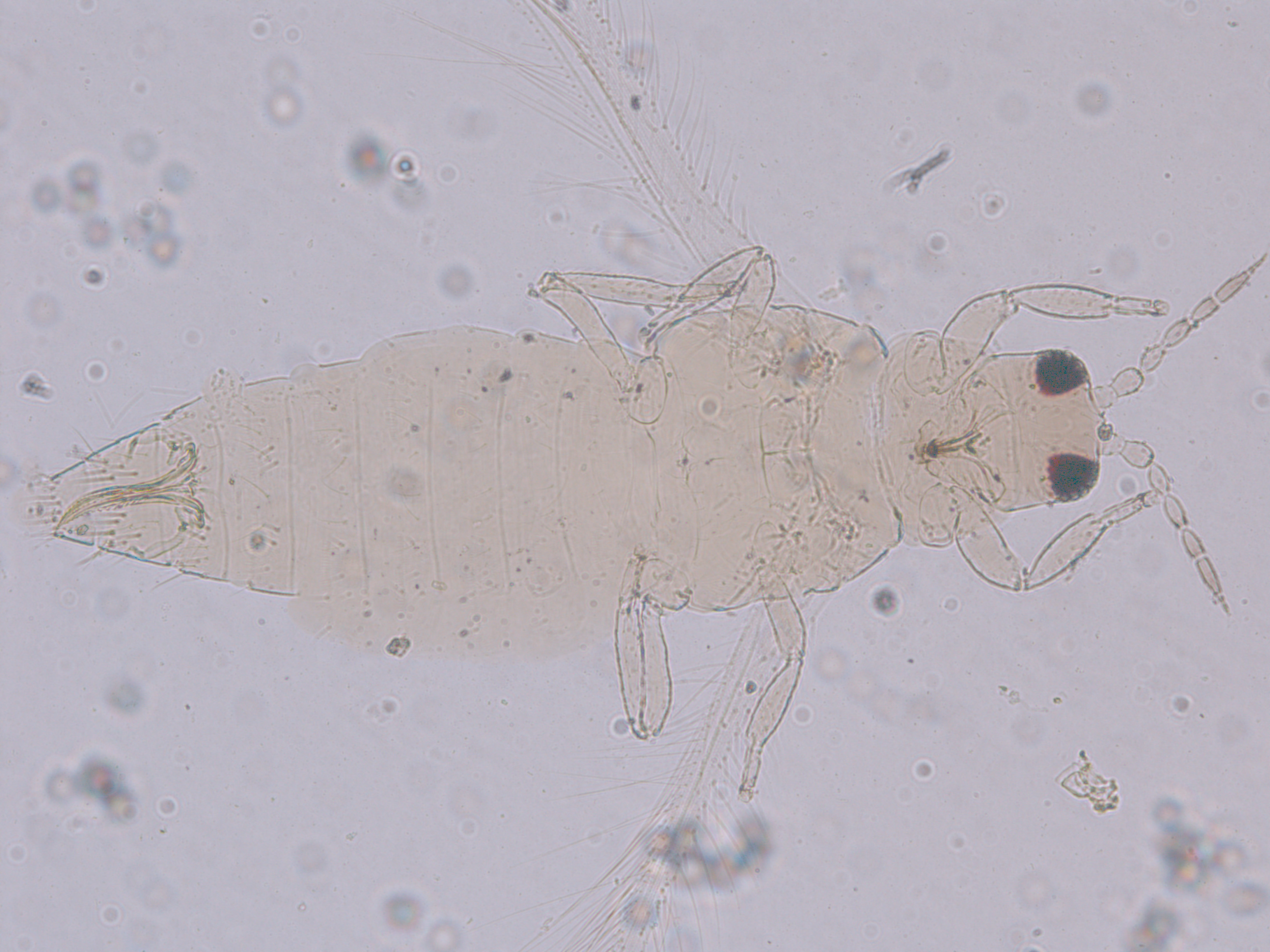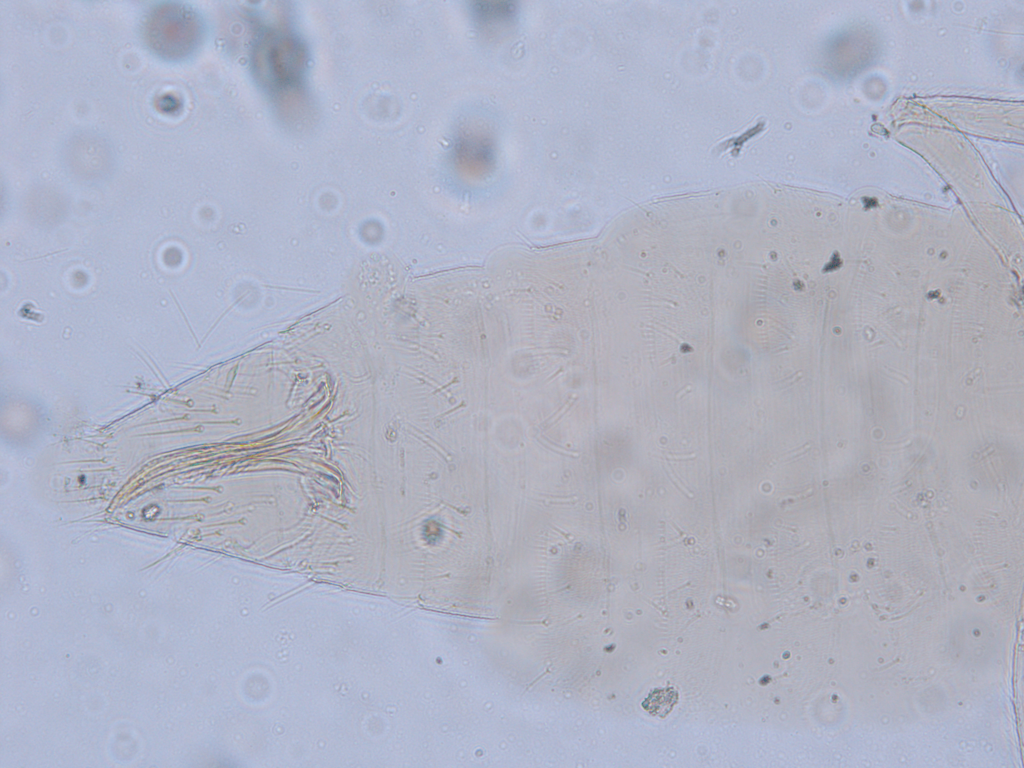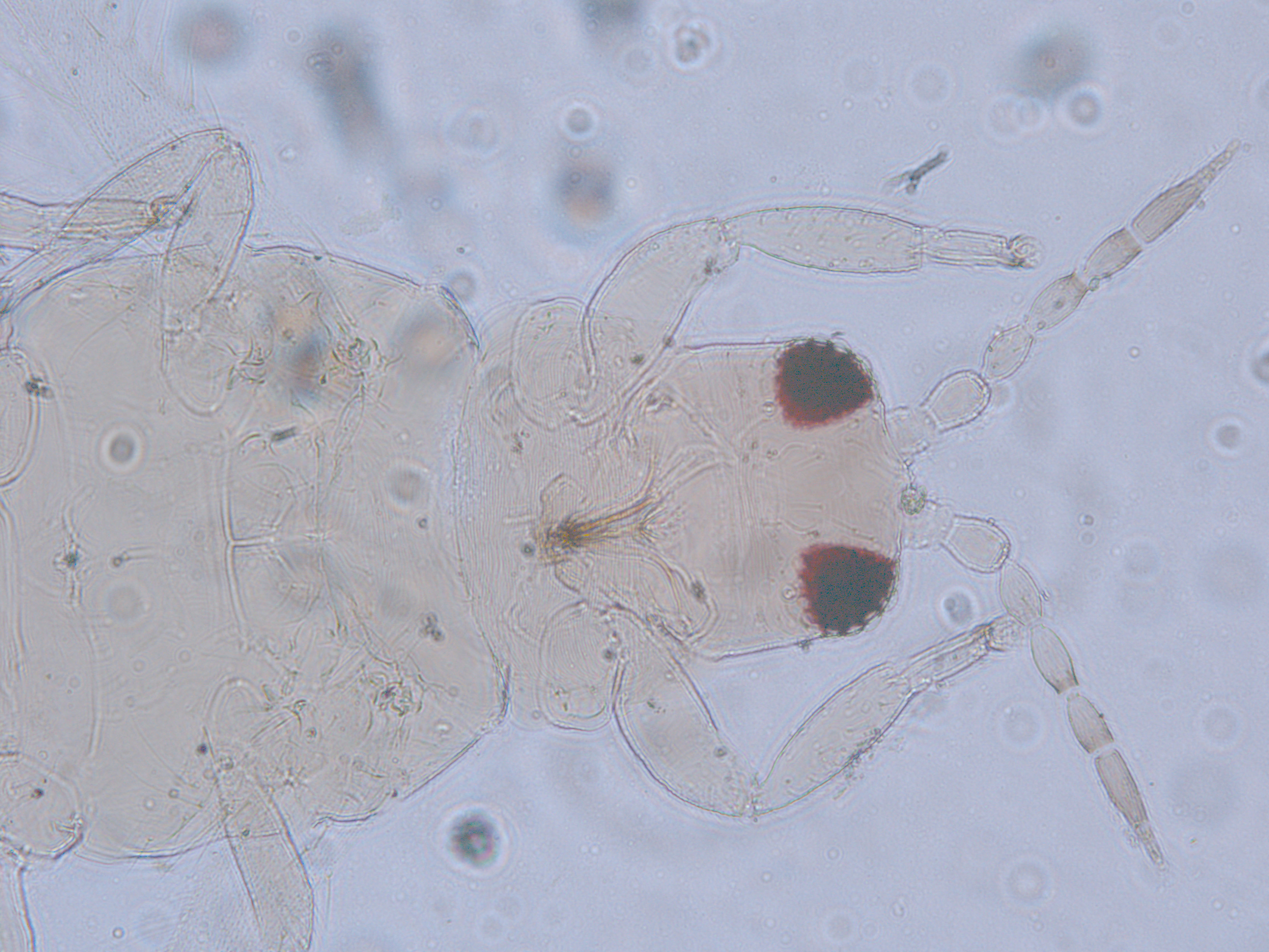 描述:雌虫:体浅黄色,复眼黑红,触角节IV-VI端部和VII-VIII浅灰色;口锥端部、各足跗节端部及产卵器较深。头略短于前胸,前单眼前外侧、单眼间及头后部有交错横线纹;复眼大占据头长的2/3;单眼呈扁三角形排列,位于复眼间略后部;前单眼鬃2对,其1对位于近复眼前内缘,另1对在前单眼前外侧;单眼间鬃位于前、后单眼中途内缘连线上;单眼和复眼后鬃约6对;触角8节,节III略短于IV和VI,节III背和IV腹面有短的叉状感觉锥,节V和VI外端、VI内侧各有简单感觉锥1个;各节近端背面和侧面有较长刚毛,节II-VI有密横排微毛;幕骨小。前胸背板密布横交错线纹于背板,但侧部有3个小的,后中部两侧有一大而横的及一小的无纹区;无长鬃;中胸背板前缘光滑,前部横纹略向前弯,后部两侧侧横线纹各自向中后延伸;前部细孔移位至两侧;前外侧对鬃不长于后中对鬃和后缘对鬃,后中对鬃位于中部,后缘对鬃向前移,接近后中对鬃;后胸背板中部纵网纹清楚,其前和两侧的纵网纹轻而模糊,网纹两侧密布纵弯线纹;前缘对鬃与前中对鬃的长度相似,均在前缘上;前翅前缘鬃22根,前脉鬃6+3,后脉鬃2根,翅瓣前缘端半部鬃4根,后基部有鬃1根,后端缘有长鬃2根;各足各节刚毛相当长但无粗刺。腹部节I-VIII背板两侧密布微毛,中部无毛区较宽,无线纹,约为有毛区宽度的一半;节VII和VIII背板后缘梳完整;细孔距微毛区较劲,中对鬃在其内后方;节IX后缘之前有6对鬃呈弧形排列;节X后部有鬃4对;股节背板和腹板前缘线几乎不可见,腹板节II-VII两侧微毛区宽度总和不及光滑区宽度;节II-VII腹板有细横纹;节II后缘鬃2对,接近后缘,节III-VIII后缘3对鬃较长,远离后缘至前中部,无附属鬃。