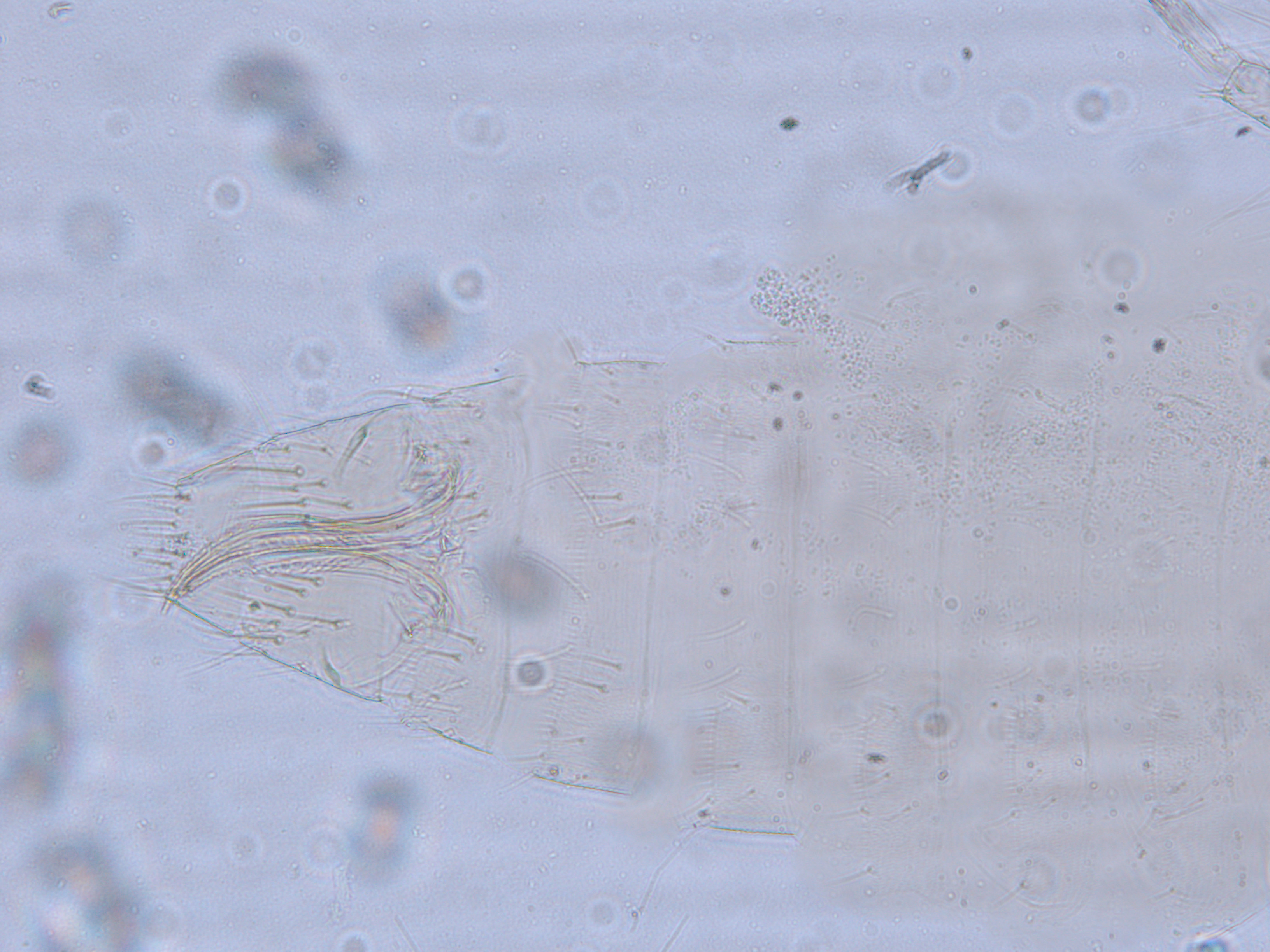 描述:雌虫:体浅黄色,复眼黑红,触角节IV-VI端部和VII-VIII浅灰色;口锥端部、各足跗节端部及产卵器较深。头略短于前胸,前单眼前外侧、单眼间及头后部有交错横线纹;复眼大占据头长的2/3;单眼呈扁三角形排列,位于复眼间略后部;前单眼鬃2对,其1对位于近复眼前内缘,另1对在前单眼前外侧;单眼间鬃位于前、后单眼中途内缘连线上;单眼和复眼后鬃约6对;触角8节,节III略短于IV和VI,节III背和IV腹面有短的叉状感觉锥,节V和VI外端、VI内侧各有简单感觉锥1个;各节近端背面和侧面有较长刚毛,节II-VI有密横排微毛;幕骨小。前胸背板密布横交错线纹于背板,但侧部有3个小的,后中部两侧有一大而横的及一小的无纹区;无长鬃;中胸背板前缘光滑,前部横纹略向前弯,后部两侧侧横线纹各自向中后延伸;前部细孔移位至两侧;前外侧对鬃不长于后中对鬃和后缘对鬃,后中对鬃位于中部,后缘对鬃向前移,接近后中对鬃;后胸背板中部纵网纹清楚,其前和两侧的纵网纹轻而模糊,网纹两侧密布纵弯线纹;前缘对鬃与前中对鬃的长度相似,均在前缘上;前翅前缘鬃22根,前脉鬃6+3,后脉鬃2根,翅瓣前缘端半部鬃4根,后基部有鬃1根,后端缘有长鬃2根;各足各节刚毛相当长但无粗刺。腹部节I-VIII背板两侧密布微毛,中部无毛区较宽,无线纹,约为有毛区宽度的一半;节VII和VIII背板后缘梳完整;细孔距微毛区较劲,中对鬃在其内后方;节IX后缘之前有6对鬃呈弧形排列;节X后部有鬃4对;股节背板和腹板前缘线几乎不可见,腹板节II-VII两侧微毛区宽度总和不及光滑区宽度;节II-VII腹板有细横纹;节II后缘鬃2对,接近后缘,节III-VIII后缘3对鬃较长,远离后缘至前中部,无附属鬃。