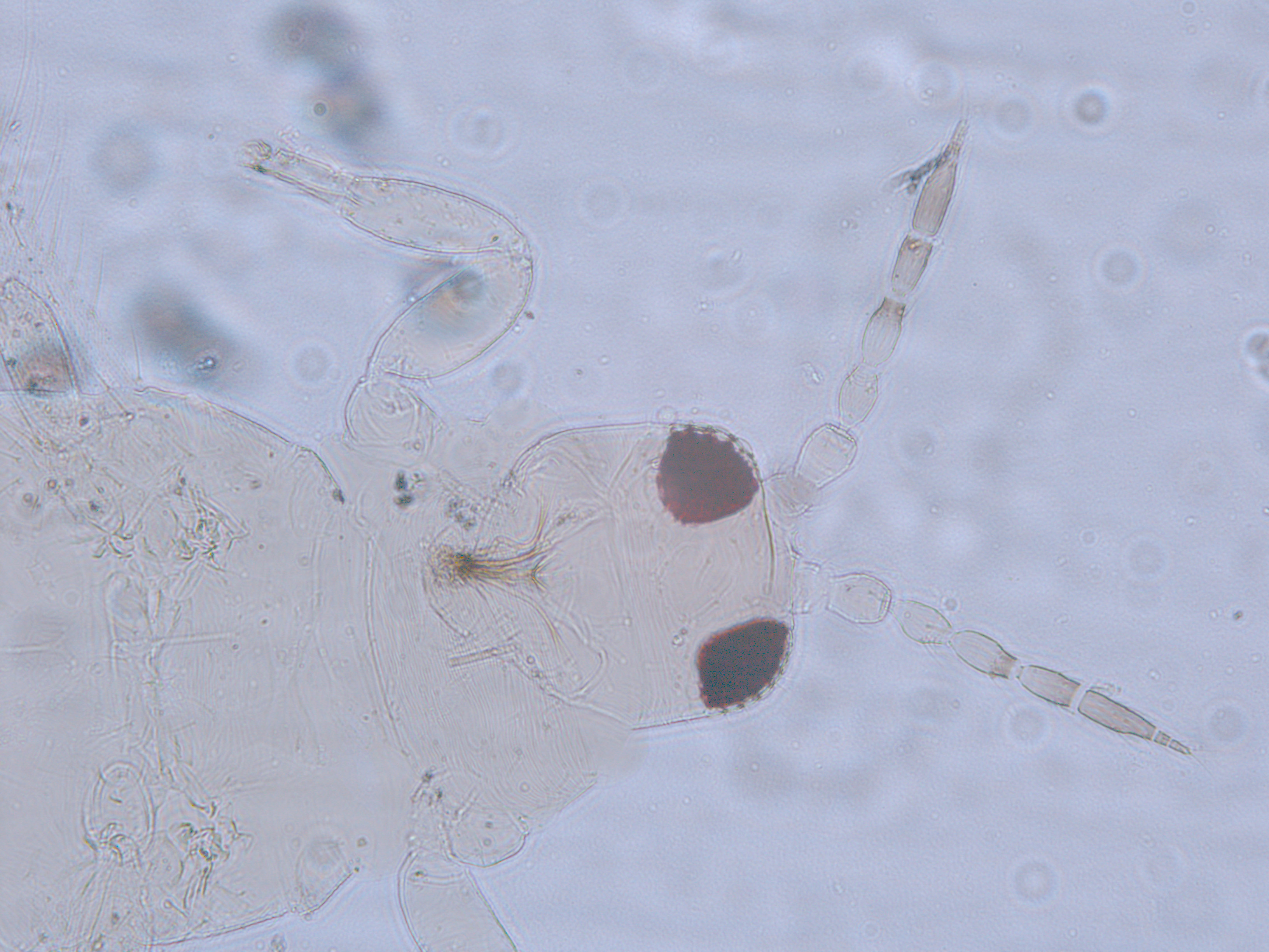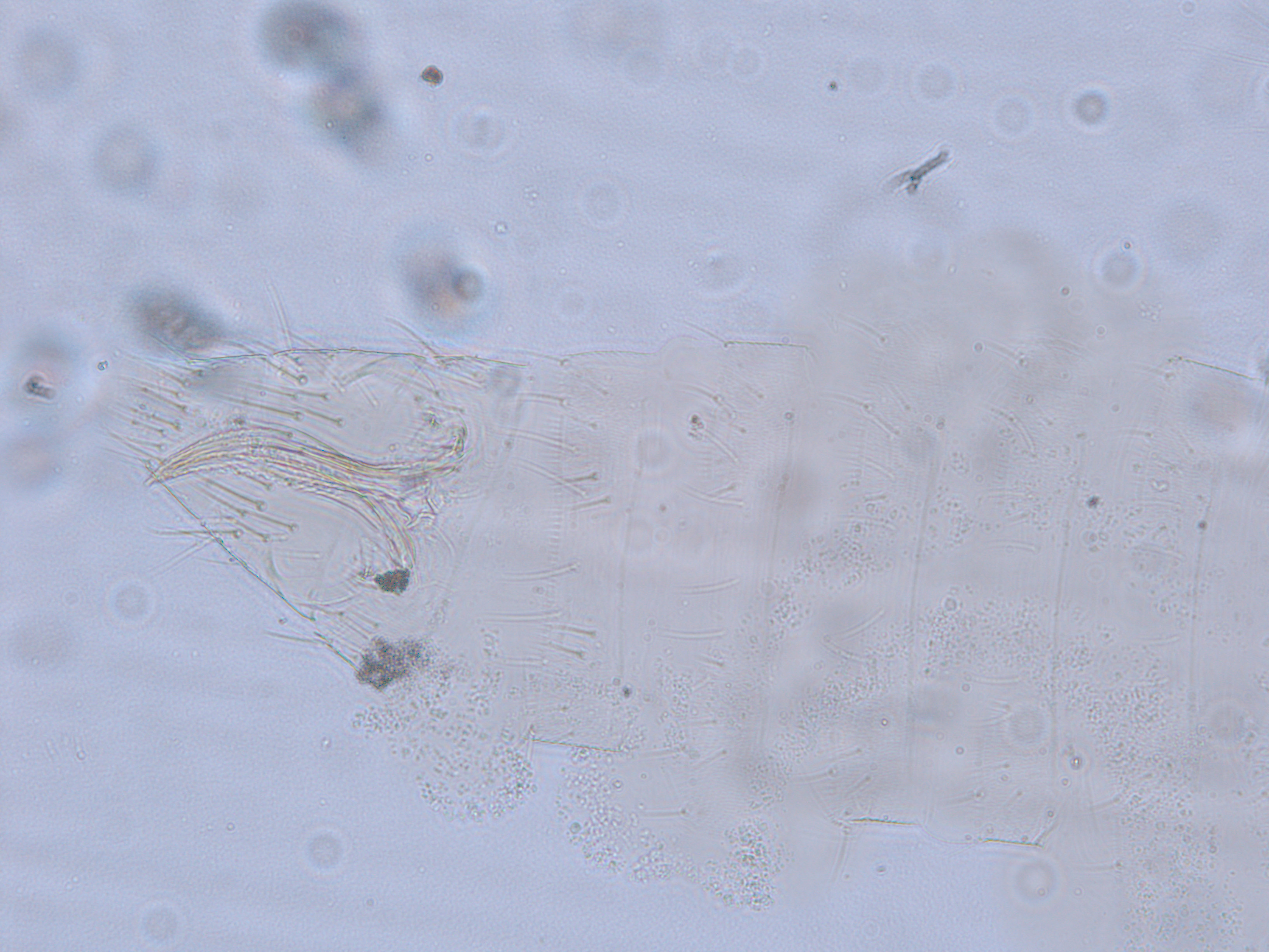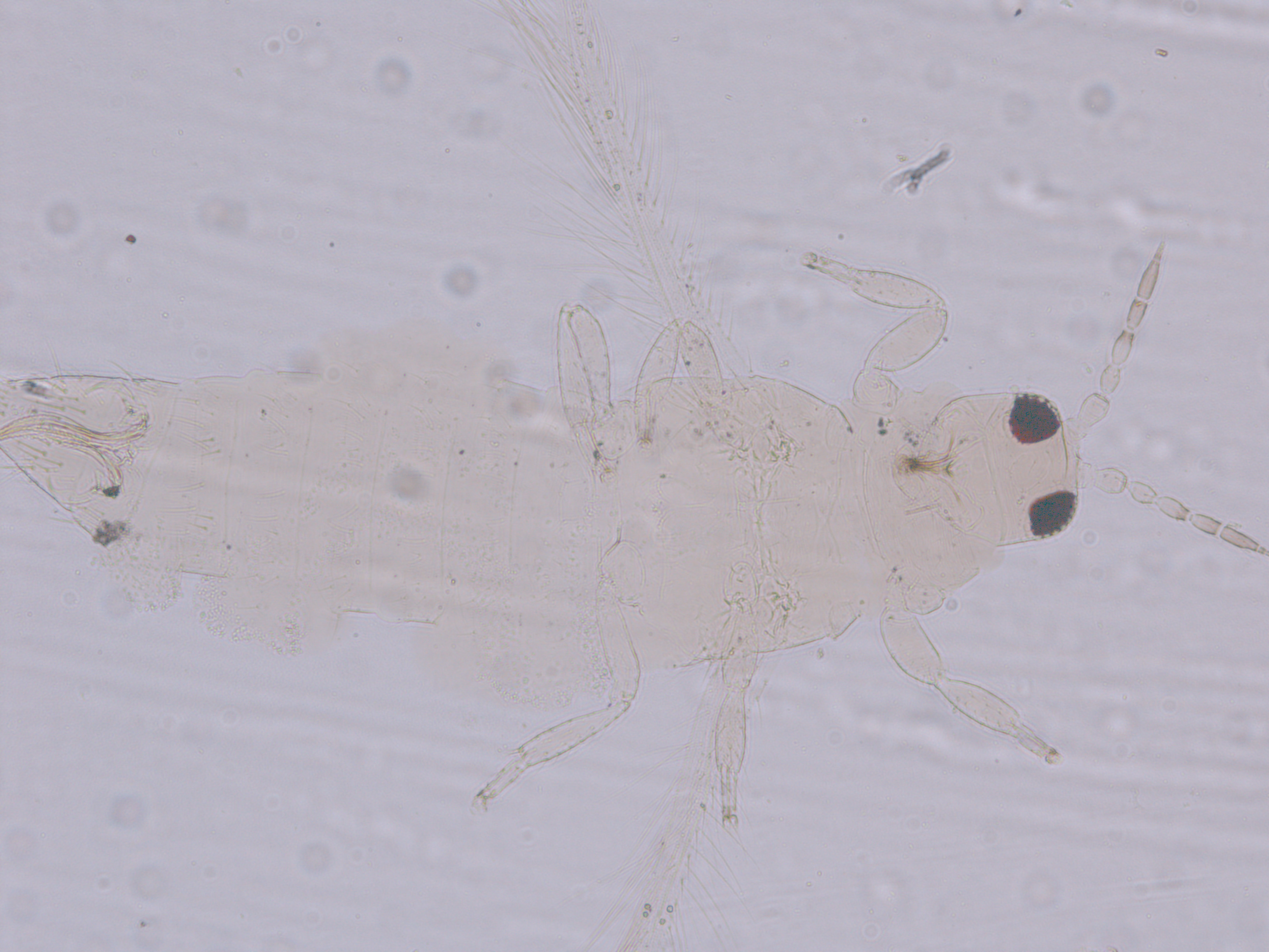 描述:雌虫:体浅黄色,复眼黑红,触角节IV-VI端部和VII-VIII浅灰色;口锥端部、各足跗节端部及产卵器较深。头略短于前胸,前单眼前外侧、单眼间及头后部有交错横线纹;复眼大占据头长的2/3;单眼呈扁三角形排列,位于复眼间略后部;前单眼鬃2对,其1对位于近复眼前内缘,另1对在前单眼前外侧;单眼间鬃位于前、后单眼中途内缘连线上;单眼和复眼后鬃约6对;触角8节,节III略短于IV和VI,节III背和IV腹面有短的叉状感觉锥,节V和VI外端、VI内侧各有简单感觉锥1个;各节近端背面和侧面有较长刚毛,节II-VI有密横排微毛;幕骨小。前胸背板密布横交错线纹于背板,但侧部有3个小的,后中部两侧有一大而横的及一小的无纹区;无长鬃;中胸背板前缘光滑,前部横纹略向前弯,后部两侧侧横线纹各自向中后延伸;前部细孔移位至两侧;前外侧对鬃不长于后中对鬃和后缘对鬃,后中对鬃位于中部,后缘对鬃向前移,接近后中对鬃;后胸背板中部纵网纹清楚,其前和两侧的纵网纹轻而模糊,网纹两侧密布纵弯线纹;前缘对鬃与前中对鬃的长度相似,均在前缘上;前翅前缘鬃22根,前脉鬃6+3,后脉鬃2根,翅瓣前缘端半部鬃4根,后基部有鬃1根,后端缘有长鬃2根;各足各节刚毛相当长但无粗刺。腹部节I-VIII背板两侧密布微毛,中部无毛区较宽,无线纹,约为有毛区宽度的一半;节VII和VIII背板后缘梳完整;细孔距微毛区较劲,中对鬃在其内后方;节IX后缘之前有6对鬃呈弧形排列;节X后部有鬃4对;股节背板和腹板前缘线几乎不可见,腹板节II-VII两侧微毛区宽度总和不及光滑区宽度;节II-VII腹板有细横纹;节II后缘鬃2对,接近后缘,节III-VIII后缘3对鬃较长,远离后缘至前中部,无附属鬃。