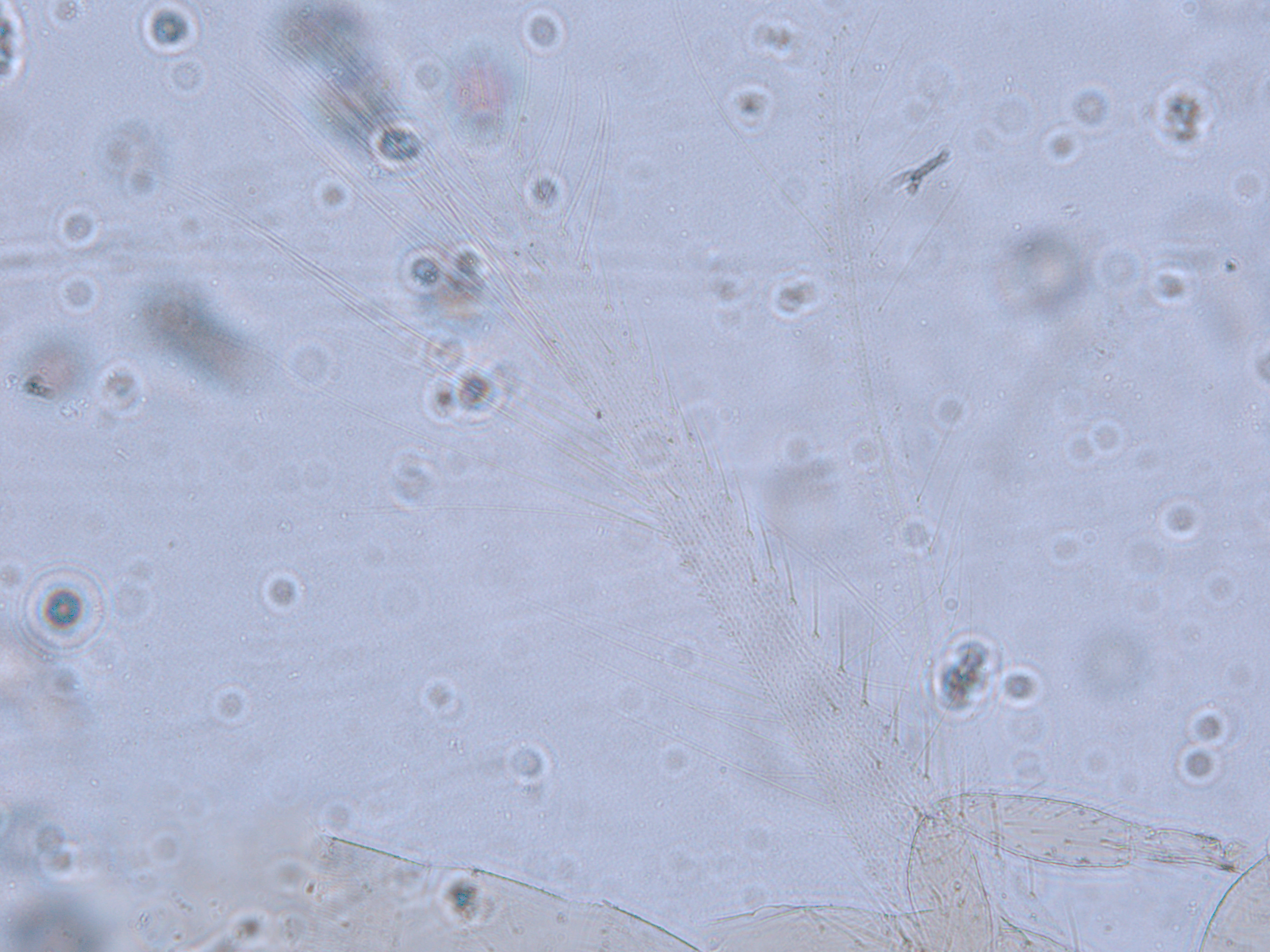 描述:雌虫:体浅黄色,复眼黑红,触角节IV-VI端部和VII-VIII浅灰色;口锥端部、各足跗节端部及产卵器较深。头略短于前胸,前单眼前外侧、单眼间及头后部有交错横线纹;复眼大占据头长的2/3;单眼呈扁三角形排列,位于复眼间略后部;前单眼鬃2对,其1对位于近复眼前内缘,另1对在前单眼前外侧;单眼间鬃位于前、后单眼中途内缘连线上;单眼和复眼后鬃约6对;触角8节,节III略短于IV和VI,节III背和IV腹面有短的叉状感觉锥,节V和VI外端、VI内侧各有简单感觉锥1个;各节近端背面和侧面有较长刚毛,节II-VI有密横排微毛;幕骨小。前胸背板密布横交错线纹于背板,但侧部有3个小的,后中部两侧有一大而横的及一小的无纹区;无长鬃;中胸背板前缘光滑,前部横纹略向前弯,后部两侧侧横线纹各自向中后延伸;前部细孔移位至两侧;前外侧对鬃不长于后中对鬃和后缘对鬃,后中对鬃位于中部,后缘对鬃向前移,接近后中对鬃;后胸背板中部纵网纹清楚,其前和两侧的纵网纹轻而模糊,网纹两侧密布纵弯线纹;前缘对鬃与前中对鬃的长度相似,均在前缘上;前翅前缘鬃22根,前脉鬃6+3,后脉鬃2根,翅瓣前缘端半部鬃4根,后基部有鬃1根,后端缘有长鬃2根;各足各节刚毛相当长但无粗刺。腹部节I-VIII背板两侧密布微毛,中部无毛区较宽,无线纹,约为有毛区宽度的一半;节VII和VIII背板后缘梳完整;细孔距微毛区较劲,中对鬃在其内后方;节IX后缘之前有6对鬃呈弧形排列;节X后部有鬃4对;股节背板和腹板前缘线几乎不可见,腹板节II-VII两侧微毛区宽度总和不及光滑区宽度;节II-VII腹板有细横纹;节II后缘鬃2对,接近后缘,节III-VIII后缘3对鬃较长,远离后缘至前中部,无附属鬃。