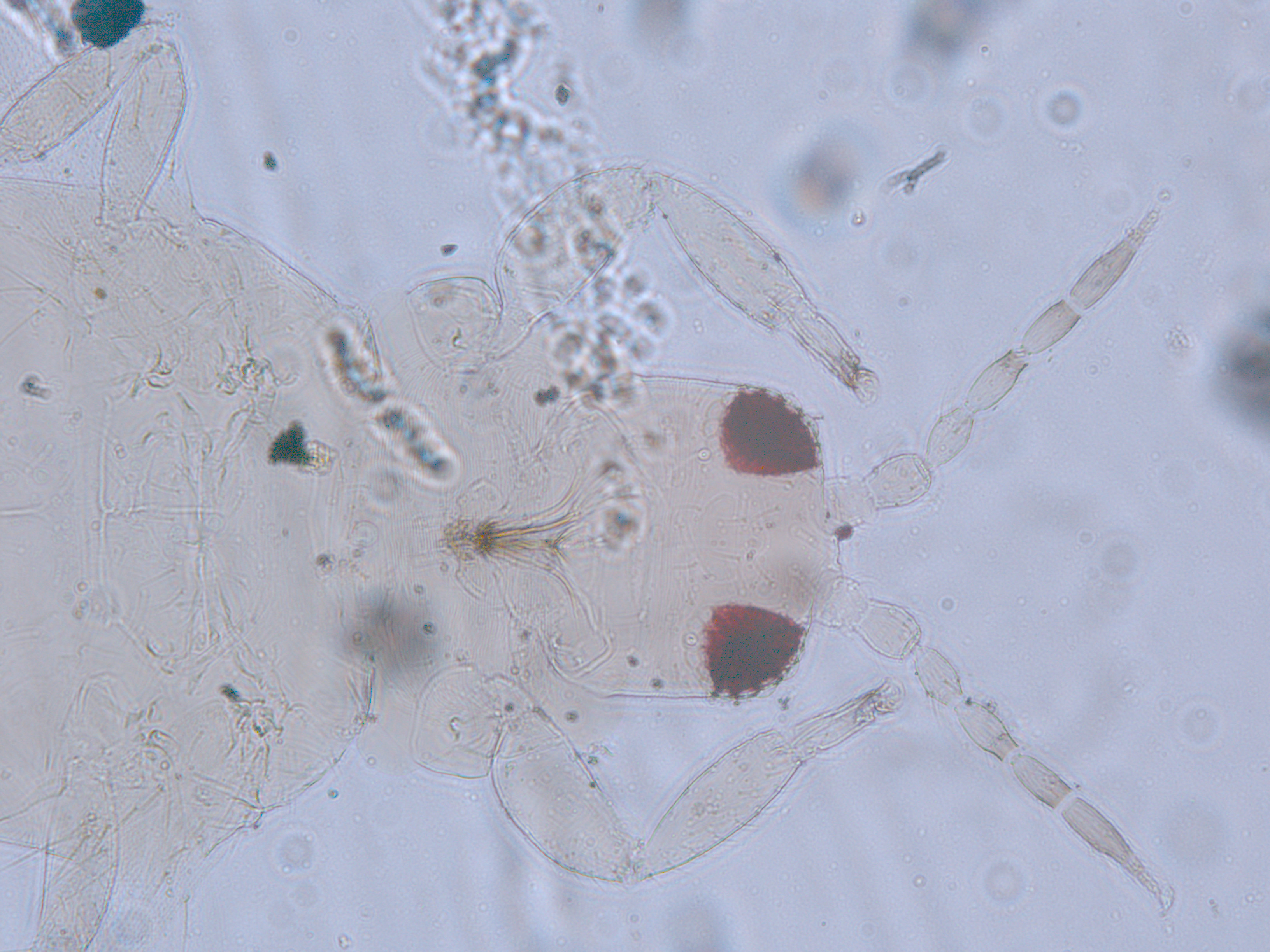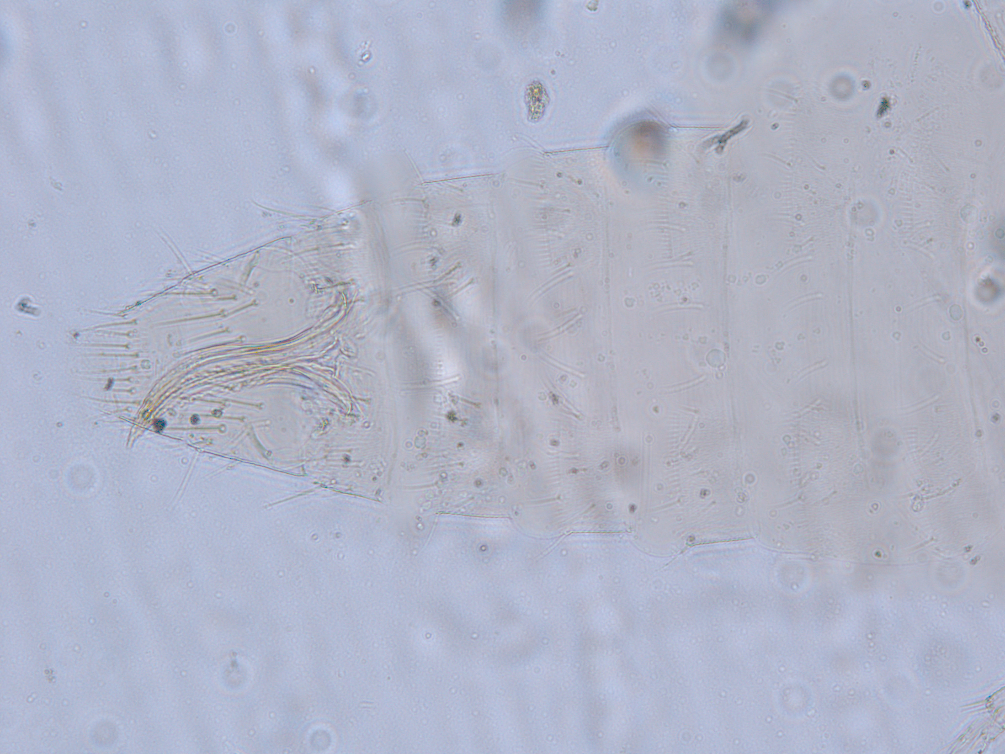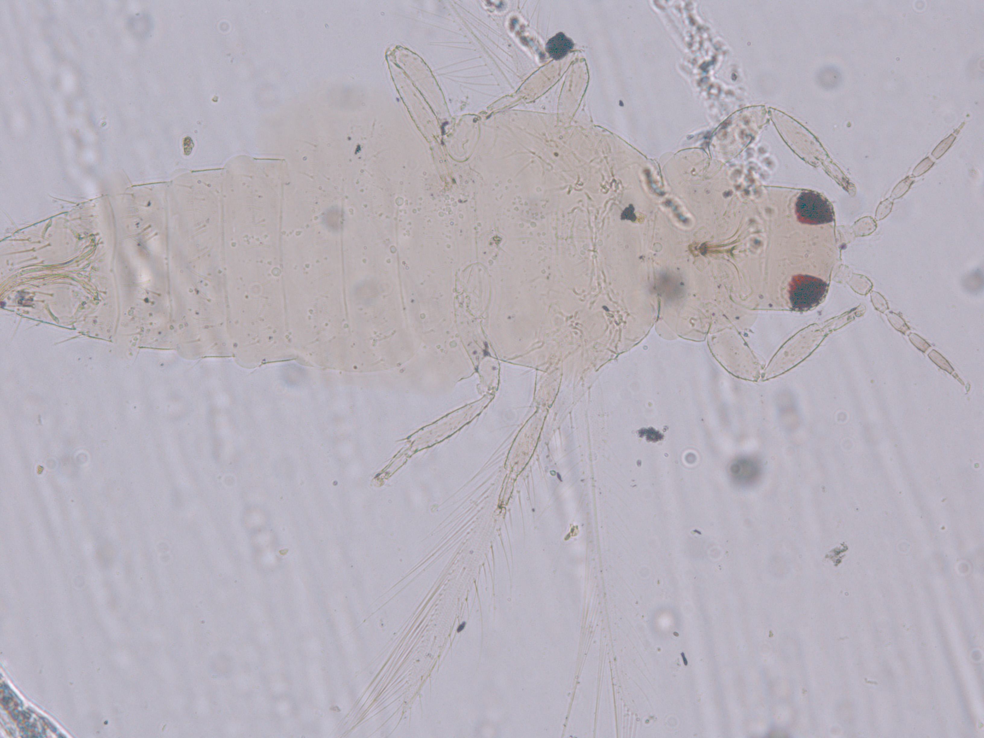 描述:雌虫:体浅黄色,复眼黑红,触角节IV-VI端部和VII-VIII浅灰色;口锥端部、各足跗节端部及产卵器较深。头略短于前胸,前单眼前外侧、单眼间及头后部有交错横线纹;复眼大占据头长的2/3;单眼呈扁三角形排列,位于复眼间略后部;前单眼鬃2对,其1对位于近复眼前内缘,另1对在前单眼前外侧;单眼间鬃位于前、后单眼中途内缘连线上;单眼和复眼后鬃约6对;触角8节,节III略短于IV和VI,节III背和IV腹面有短的叉状感觉锥,节V和VI外端、VI内侧各有简单感觉锥1个;各节近端背面和侧面有较长刚毛,节II-VI有密横排微毛;幕骨小。前胸背板密布横交错线纹于背板,但侧部有3个小的,后中部两侧有一大而横的及一小的无纹区;无长鬃;中胸背板前缘光滑,前部横纹略向前弯,后部两侧侧横线纹各自向中后延伸;前部细孔移位至两侧;前外侧对鬃不长于后中对鬃和后缘对鬃,后中对鬃位于中部,后缘对鬃向前移,接近后中对鬃;后胸背板中部纵网纹清楚,其前和两侧的纵网纹轻而模糊,网纹两侧密布纵弯线纹;前缘对鬃与前中对鬃的长度相似,均在前缘上;前翅前缘鬃22根,前脉鬃6+3,后脉鬃2根,翅瓣前缘端半部鬃4根,后基部有鬃1根,后端缘有长鬃2根;各足各节刚毛相当长但无粗刺。腹部节I-VIII背板两侧密布微毛,中部无毛区较宽,无线纹,约为有毛区宽度的一半;节VII和VIII背板后缘梳完整;细孔距微毛区较劲,中对鬃在其内后方;节IX后缘之前有6对鬃呈弧形排列;节X后部有鬃4对;股节背板和腹板前缘线几乎不可见,腹板节II-VII两侧微毛区宽度总和不及光滑区宽度;节II-VII腹板有细横纹;节II后缘鬃2对,接近后缘,节III-VIII后缘3对鬃较长,远离后缘至前中部,无附属鬃。