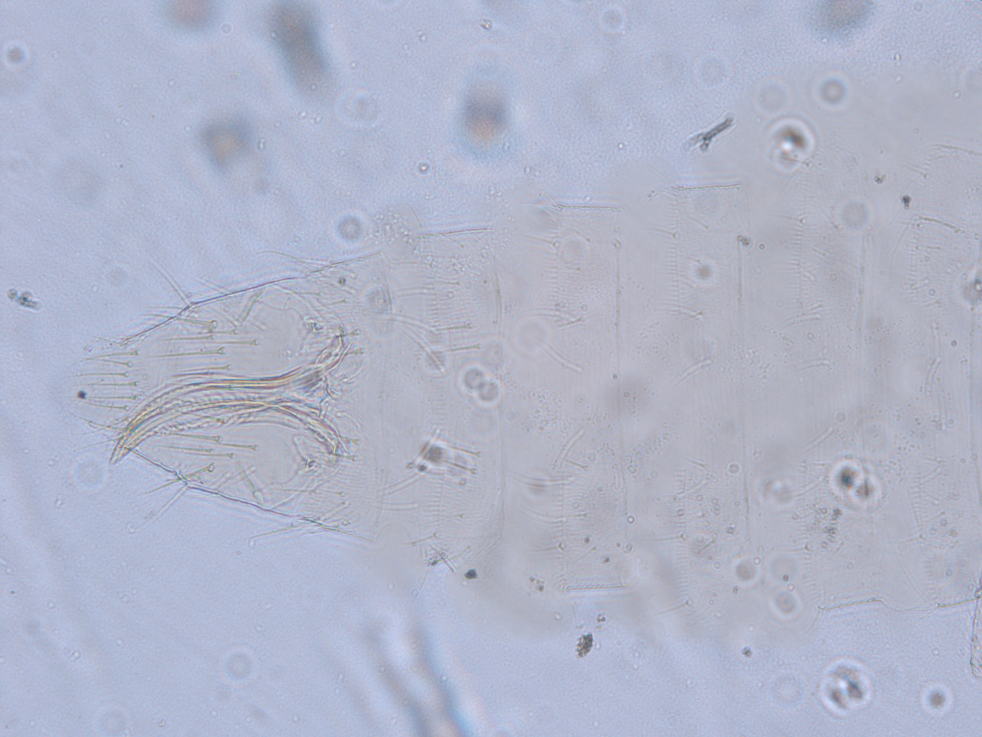 描述:雌虫:体浅黄色,复眼黑红,触角节IV-VI端部和VII-VIII浅灰色;口锥端部、各足跗节端部及产卵器较深。头略短于前胸,前单眼前外侧、单眼间及头后部有交错横线纹;复眼大占据头长的2/3;单眼呈扁三角形排列,位于复眼间略后部;前单眼鬃2对,其1对位于近复眼前内缘,另1对在前单眼前外侧;单眼间鬃位于前、后单眼中途内缘连线上;单眼和复眼后鬃约6对;触角8节,节III略短于IV和VI,节III背和IV腹面有短的叉状感觉锥,节V和VI外端、VI内侧各有简单感觉锥1个;各节近端背面和侧面有较长刚毛,节II-VI有密横排微毛;幕骨小。前胸背板密布横交错线纹于背板,但侧部有3个小的,后中部两侧有一大而横的及一小的无纹区;无长鬃;中胸背板前缘光滑,前部横纹略向前弯,后部两侧侧横线纹各自向中后延伸;前部细孔移位至两侧;前外侧对鬃不长于后中对鬃和后缘对鬃,后中对鬃位于中部,后缘对鬃向前移,接近后中对鬃;后胸背板中部纵网纹清楚,其前和两侧的纵网纹轻而模糊,网纹两侧密布纵弯线纹;前缘对鬃与前中对鬃的长度相似,均在前缘上;前翅前缘鬃22根,前脉鬃6+3,后脉鬃2根,翅瓣前缘端半部鬃4根,后基部有鬃1根,后端缘有长鬃2根;各足各节刚毛相当长但无粗刺。腹部节I-VIII背板两侧密布微毛,中部无毛区较宽,无线纹,约为有毛区宽度的一半;节VII和VIII背板后缘梳完整;细孔距微毛区较劲,中对鬃在其内后方;节IX后缘之前有6对鬃呈弧形排列;节X后部有鬃4对;股节背板和腹板前缘线几乎不可见,腹板节II-VII两侧微毛区宽度总和不及光滑区宽度;节II-VII腹板有细横纹;节II后缘鬃2对,接近后缘,节III-VIII后缘3对鬃较长,远离后缘至前中部,无附属鬃。
