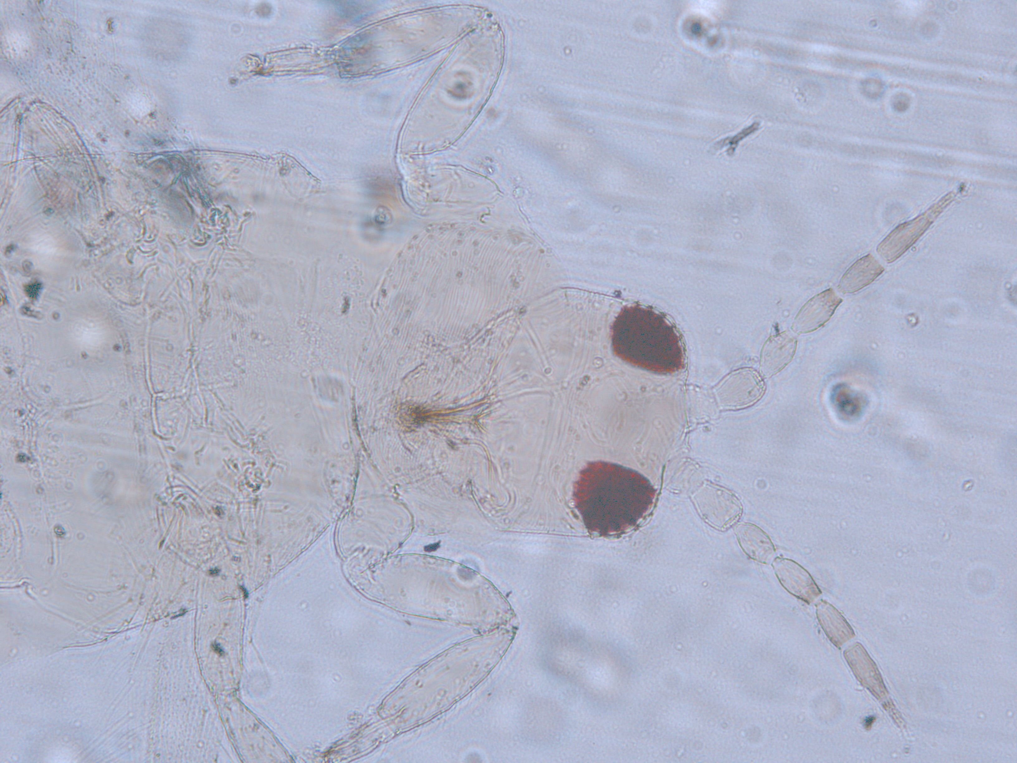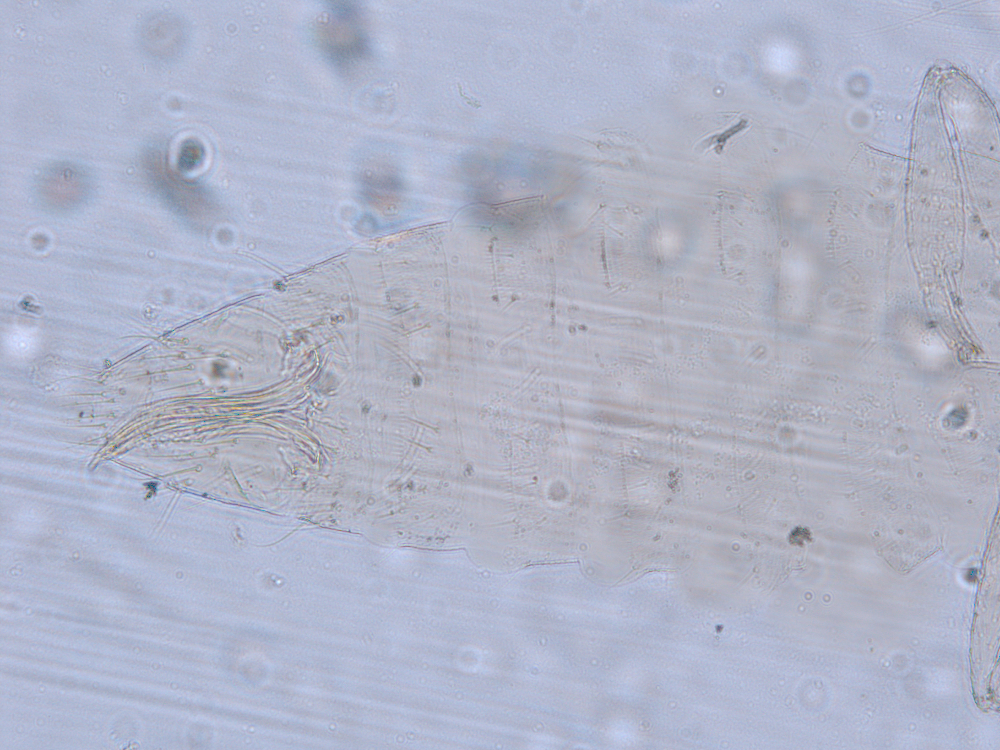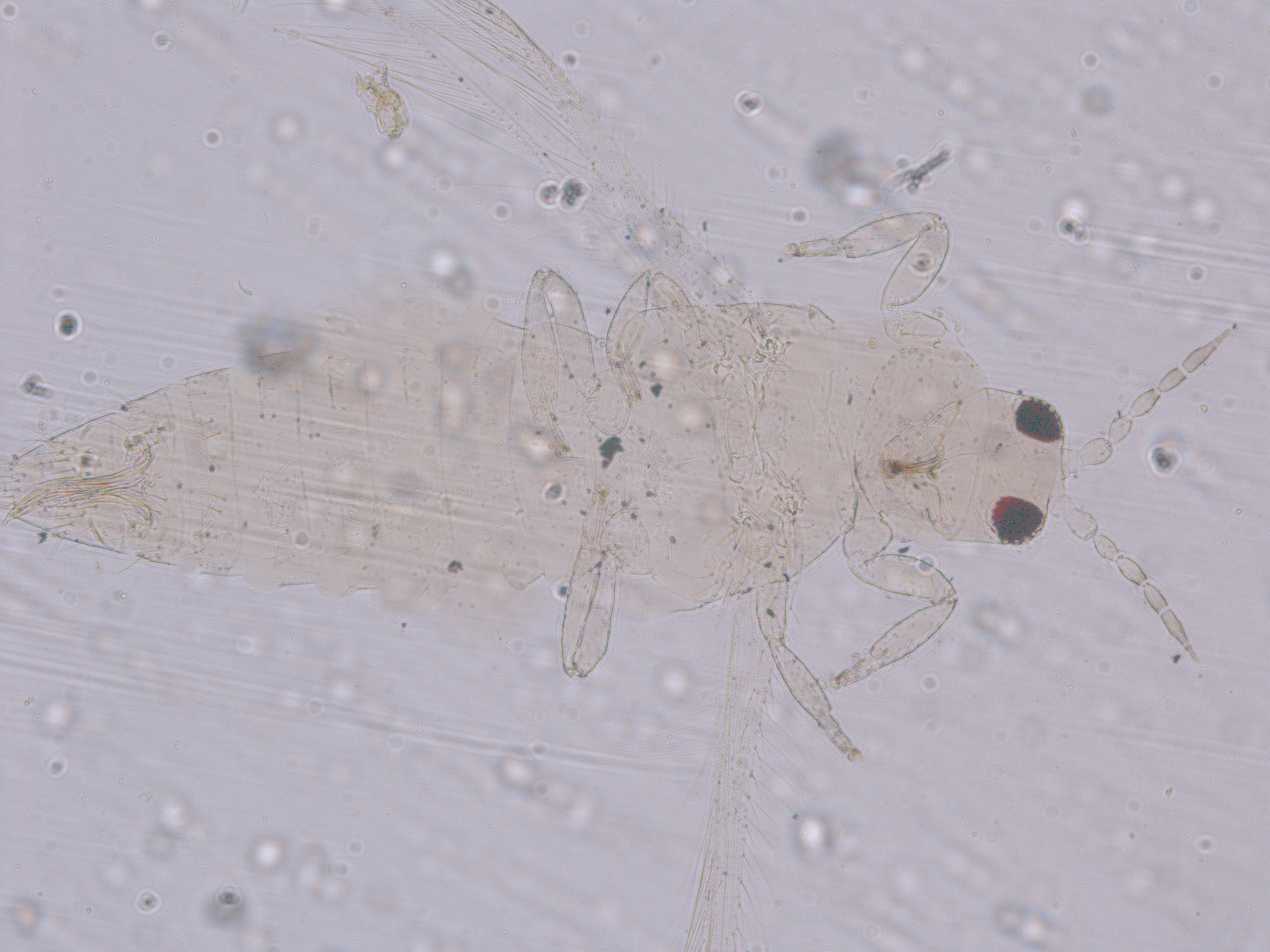 描述:雌虫:体浅黄色,复眼黑红,触角节IV-VI端部和VII-VIII浅灰色;口锥端部、各足跗节端部及产卵器较深。头略短于前胸,前单眼前外侧、单眼间及头后部有交错横线纹;复眼大占据头长的2/3;单眼呈扁三角形排列,位于复眼间略后部;前单眼鬃2对,其1对位于近复眼前内缘,另1对在前单眼前外侧;单眼间鬃位于前、后单眼中途内缘连线上;单眼和复眼后鬃约6对;触角8节,节III略短于IV和VI,节III背和IV腹面有短的叉状感觉锥,节V和VI外端、VI内侧各有简单感觉锥1个;各节近端背面和侧面有较长刚毛,节II-VI有密横排微毛;幕骨小。前胸背板密布横交错线纹于背板,但侧部有3个小的,后中部两侧有一大而横的及一小的无纹区;无长鬃;中胸背板前缘光滑,前部横纹略向前弯,后部两侧侧横线纹各自向中后延伸;前部细孔移位至两侧;前外侧对鬃不长于后中对鬃和后缘对鬃,后中对鬃位于中部,后缘对鬃向前移,接近后中对鬃;后胸背板中部纵网纹清楚,其前和两侧的纵网纹轻而模糊,网纹两侧密布纵弯线纹;前缘对鬃与前中对鬃的长度相似,均在前缘上;前翅前缘鬃22根,前脉鬃6+3,后脉鬃2根,翅瓣前缘端半部鬃4根,后基部有鬃1根,后端缘有长鬃2根;各足各节刚毛相当长但无粗刺。腹部节I-VIII背板两侧密布微毛,中部无毛区较宽,无线纹,约为有毛区宽度的一半;节VII和VIII背板后缘梳完整;细孔距微毛区较劲,中对鬃在其内后方;节IX后缘之前有6对鬃呈弧形排列;节X后部有鬃4对;股节背板和腹板前缘线几乎不可见,腹板节II-VII两侧微毛区宽度总和不及光滑区宽度;节II-VII腹板有细横纹;节II后缘鬃2对,接近后缘,节III-VIII后缘3对鬃较长,远离后缘至前中部,无附属鬃。
