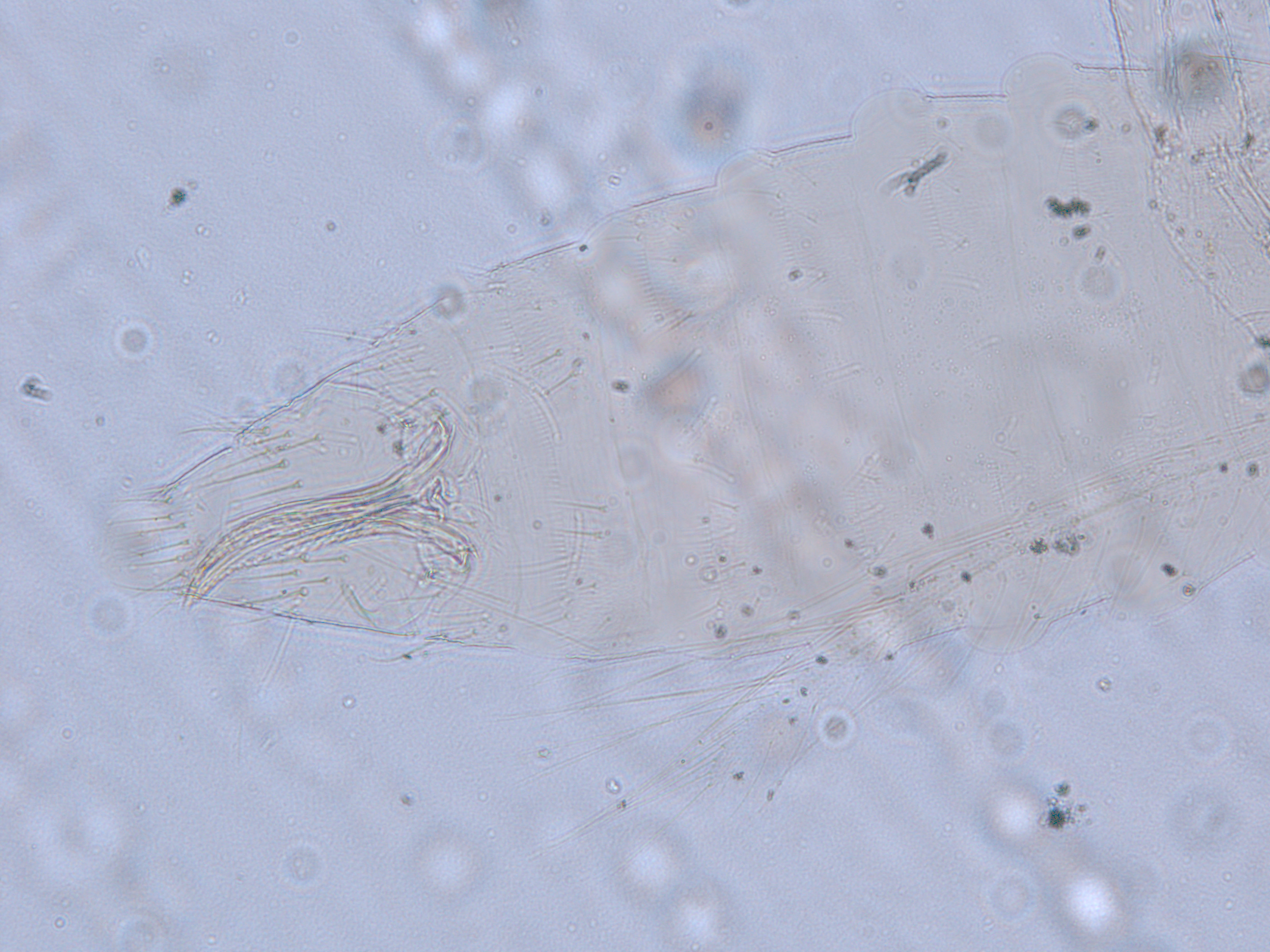 描述:雌虫:体浅黄色,复眼黑红,触角节IV-VI端部和VII-VIII浅灰色;口锥端部、各足跗节端部及产卵器较深。头略短于前胸,前单眼前外侧、单眼间及头后部有交错横线纹;复眼大占据头长的2/3;单眼呈扁三角形排列,位于复眼间略后部;前单眼鬃2对,其1对位于近复眼前内缘,另1对在前单眼前外侧;单眼间鬃位于前、后单眼中途内缘连线上;单眼和复眼后鬃约6对;触角8节,节III略短于IV和VI,节III背和IV腹面有短的叉状感觉锥,节V和VI外端、VI内侧各有简单感觉锥1个;各节近端背面和侧面有较长刚毛,节II-VI有密横排微毛;幕骨小。前胸背板密布横交错线纹于背板,但侧部有3个小的,后中部两侧有一大而横的及一小的无纹区;无长鬃;中胸背板前缘光滑,前部横纹略向前弯,后部两侧侧横线纹各自向中后延伸;前部细孔移位至两侧;前外侧对鬃不长于后中对鬃和后缘对鬃,后中对鬃位于中部,后缘对鬃向前移,接近后中对鬃;后胸背板中部纵网纹清楚,其前和两侧的纵网纹轻而模糊,网纹两侧密布纵弯线纹;前缘对鬃与前中对鬃的长度相似,均在前缘上;前翅前缘鬃22根,前脉鬃6+3,后脉鬃2根,翅瓣前缘端半部鬃4根,后基部有鬃1根,后端缘有长鬃2根;各足各节刚毛相当长但无粗刺。腹部节I-VIII背板两侧密布微毛,中部无毛区较宽,无线纹,约为有毛区宽度的一半;节VII和VIII背板后缘梳完整;细孔距微毛区较劲,中对鬃在其内后方;节IX后缘之前有6对鬃呈弧形排列;节X后部有鬃4对;股节背板和腹板前缘线几乎不可见,腹板节II-VII两侧微毛区宽度总和不及光滑区宽度;节II-VII腹板有细横纹;节II后缘鬃2对,接近后缘,节III-VIII后缘3对鬃较长,远离后缘至前中部,无附属鬃。