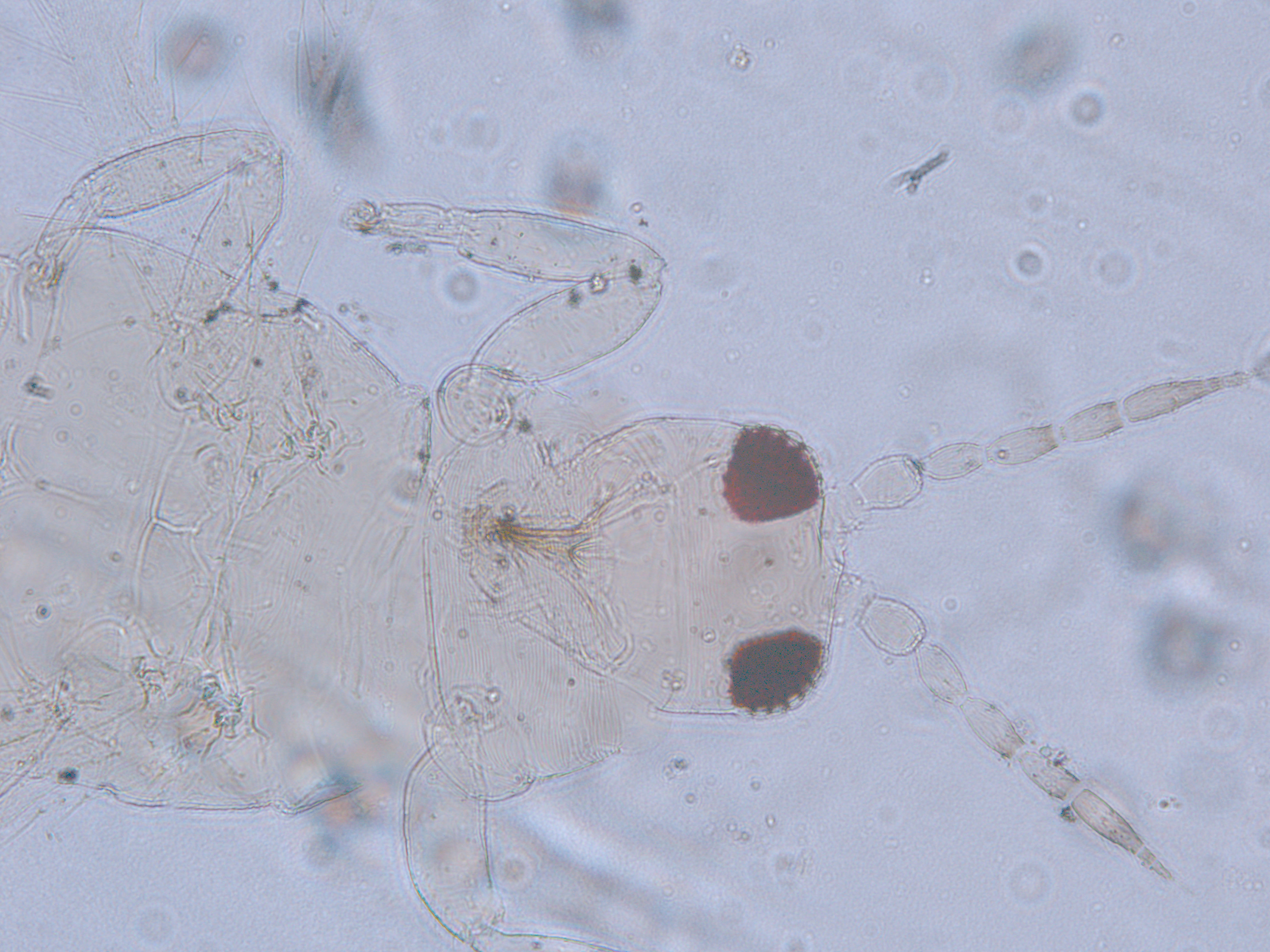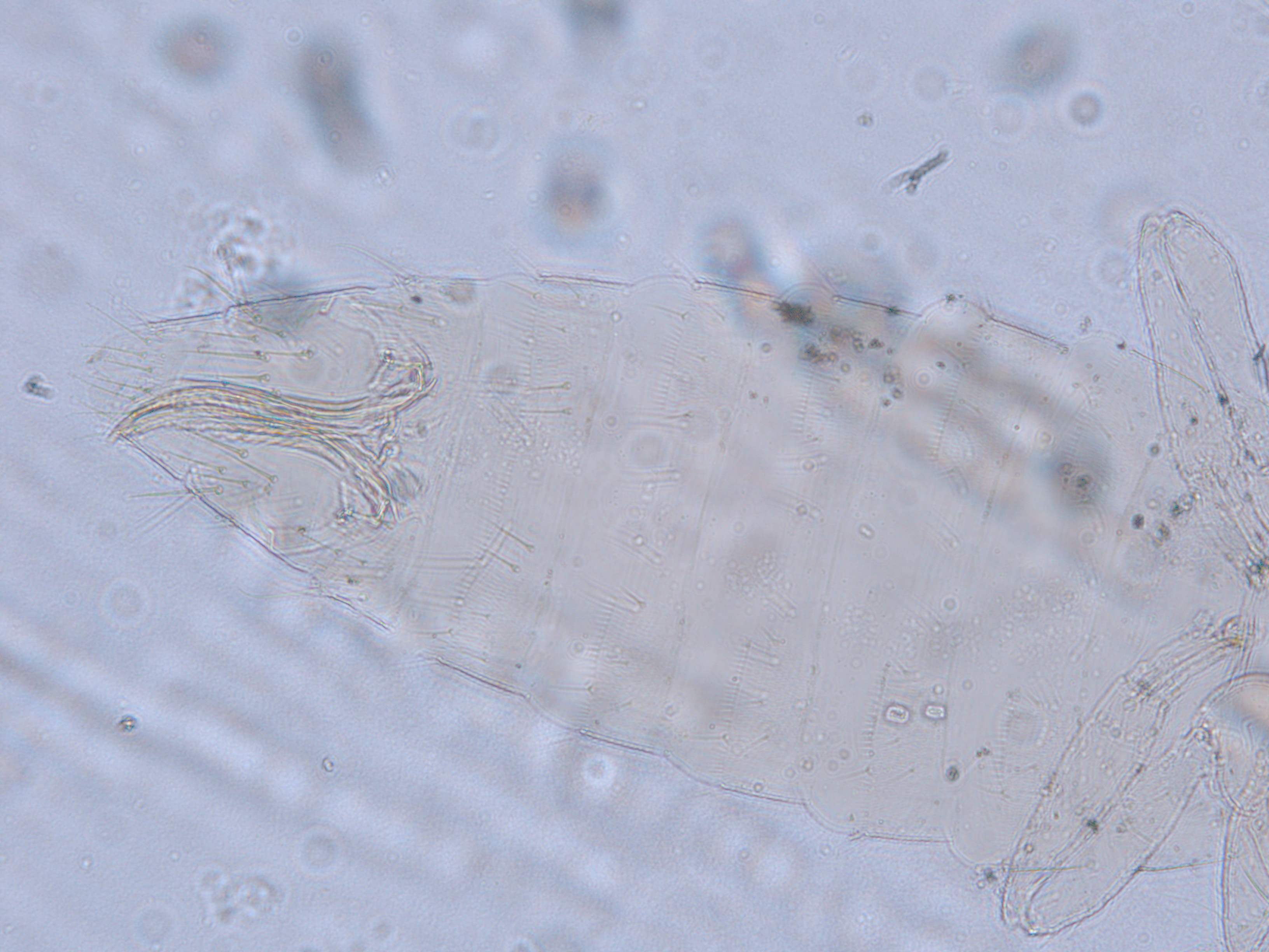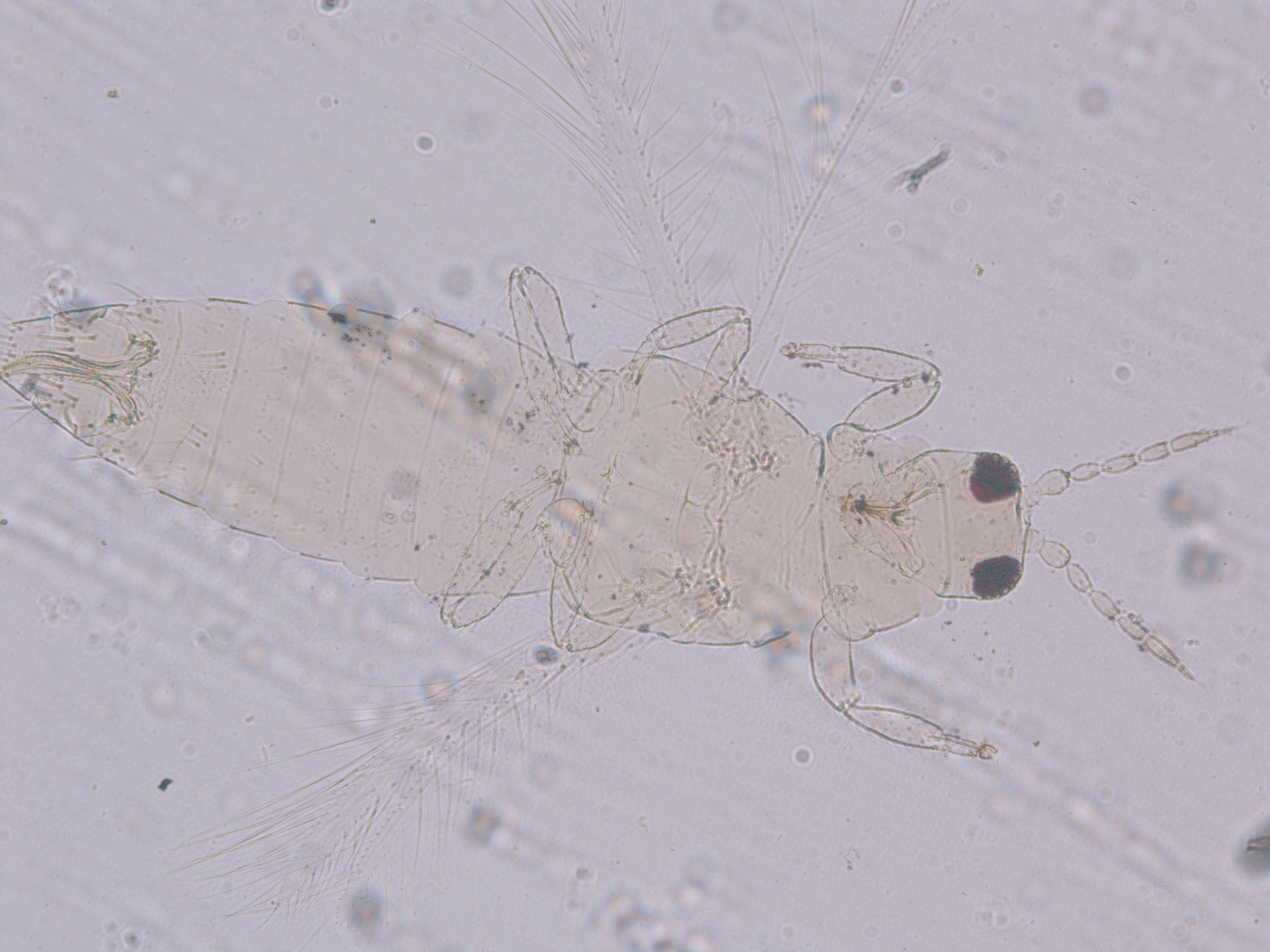 描述:雌虫:体浅黄色,复眼黑红,触角节IV-VI端部和VII-VIII浅灰色;口锥端部、各足跗节端部及产卵器较深。头略短于前胸,前单眼前外侧、单眼间及头后部有交错横线纹;复眼大占据头长的2/3;单眼呈扁三角形排列,位于复眼间略后部;前单眼鬃2对,其1对位于近复眼前内缘,另1对在前单眼前外侧;单眼间鬃位于前、后单眼中途内缘连线上;单眼和复眼后鬃约6对;触角8节,节III略短于IV和VI,节III背和IV腹面有短的叉状感觉锥,节V和VI外端、VI内侧各有简单感觉锥1个;各节近端背面和侧面有较长刚毛,节II-VI有密横排微毛;幕骨小。前胸背板密布横交错线纹于背板,但侧部有3个小的,后中部两侧有一大而横的及一小的无纹区;无长鬃;中胸背板前缘光滑,前部横纹略向前弯,后部两侧侧横线纹各自向中后延伸;前部细孔移位至两侧;前外侧对鬃不长于后中对鬃和后缘对鬃,后中对鬃位于中部,后缘对鬃向前移,接近后中对鬃;后胸背板中部纵网纹清楚,其前和两侧的纵网纹轻而模糊,网纹两侧密布纵弯线纹;前缘对鬃与前中对鬃的长度相似,均在前缘上;前翅前缘鬃22根,前脉鬃6+3,后脉鬃2根,翅瓣前缘端半部鬃4根,后基部有鬃1根,后端缘有长鬃2根;各足各节刚毛相当长但无粗刺。腹部节I-VIII背板两侧密布微毛,中部无毛区较宽,无线纹,约为有毛区宽度的一半;节VII和VIII背板后缘梳完整;细孔距微毛区较劲,中对鬃在其内后方;节IX后缘之前有6对鬃呈弧形排列;节X后部有鬃4对;股节背板和腹板前缘线几乎不可见,腹板节II-VII两侧微毛区宽度总和不及光滑区宽度;节II-VII腹板有细横纹;节II后缘鬃2对,接近后缘,节III-VIII后缘3对鬃较长,远离后缘至前中部,无附属鬃。
