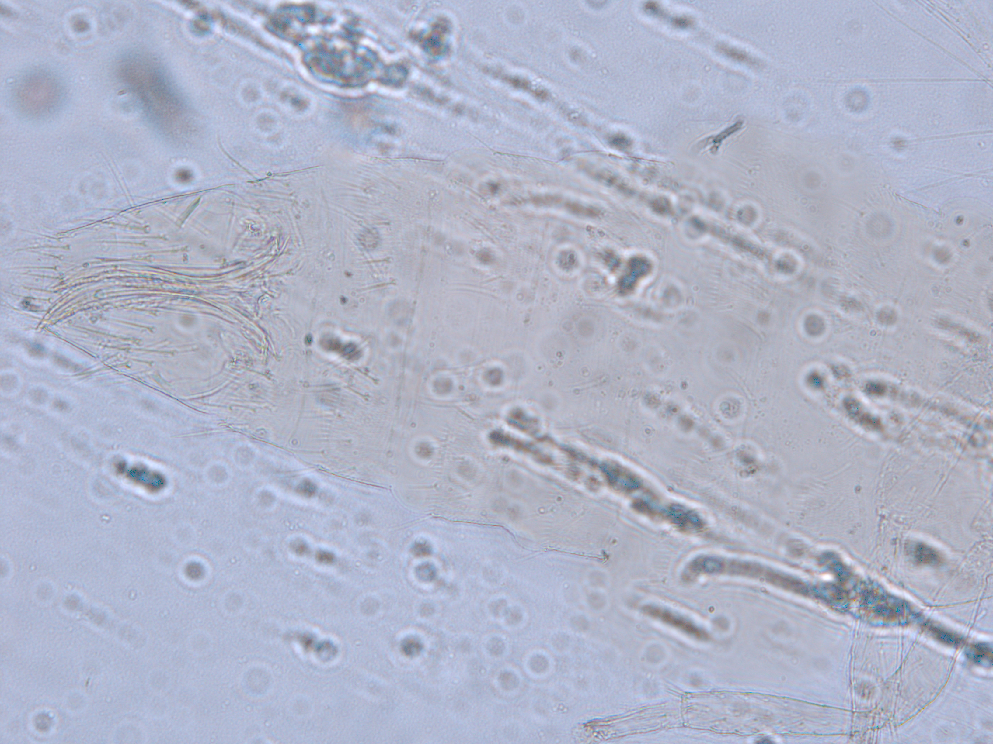 描述:雌虫:体浅黄色,复眼黑红,触角节IV-VI端部和VII-VIII浅灰色;口锥端部、各足跗节端部及产卵器较深。头略短于前胸,前单眼前外侧、单眼间及头后部有交错横线纹;复眼大占据头长的2/3;单眼呈扁三角形排列,位于复眼间略后部;前单眼鬃2对,其1对位于近复眼前内缘,另1对在前单眼前外侧;单眼间鬃位于前、后单眼中途内缘连线上;单眼和复眼后鬃约6对;触角8节,节III略短于IV和VI,节III背和IV腹面有短的叉状感觉锥,节V和VI外端、VI内侧各有简单感觉锥1个;各节近端背面和侧面有较长刚毛,节II-VI有密横排微毛;幕骨小。前胸背板密布横交错线纹于背板,但侧部有3个小的,后中部两侧有一大而横的及一小的无纹区;无长鬃;中胸背板前缘光滑,前部横纹略向前弯,后部两侧侧横线纹各自向中后延伸;前部细孔移位至两侧;前外侧对鬃不长于后中对鬃和后缘对鬃,后中对鬃位于中部,后缘对鬃向前移,接近后中对鬃;后胸背板中部纵网纹清楚,其前和两侧的纵网纹轻而模糊,网纹两侧密布纵弯线纹;前缘对鬃与前中对鬃的长度相似,均在前缘上;前翅前缘鬃22根,前脉鬃6+3,后脉鬃2根,翅瓣前缘端半部鬃4根,后基部有鬃1根,后端缘有长鬃2根;各足各节刚毛相当长但无粗刺。腹部节I-VIII背板两侧密布微毛,中部无毛区较宽,无线纹,约为有毛区宽度的一半;节VII和VIII背板后缘梳完整;细孔距微毛区较劲,中对鬃在其内后方;节IX后缘之前有6对鬃呈弧形排列;节X后部有鬃4对;股节背板和腹板前缘线几乎不可见,腹板节II-VII两侧微毛区宽度总和不及光滑区宽度;节II-VII腹板有细横纹;节II后缘鬃2对,接近后缘,节III-VIII后缘3对鬃较长,远离后缘至前中部,无附属鬃。