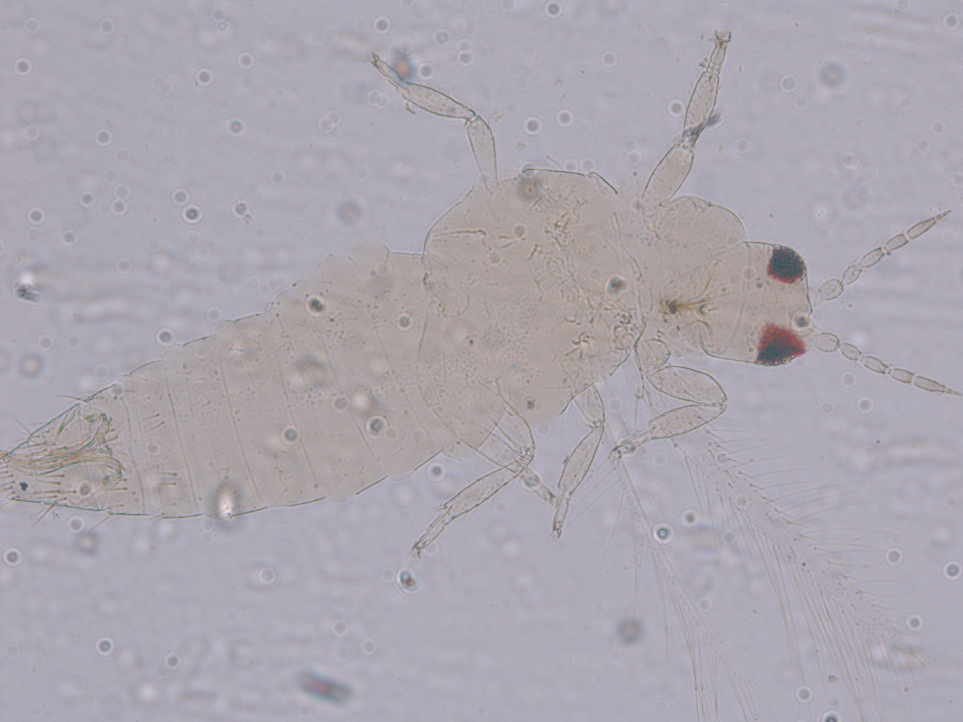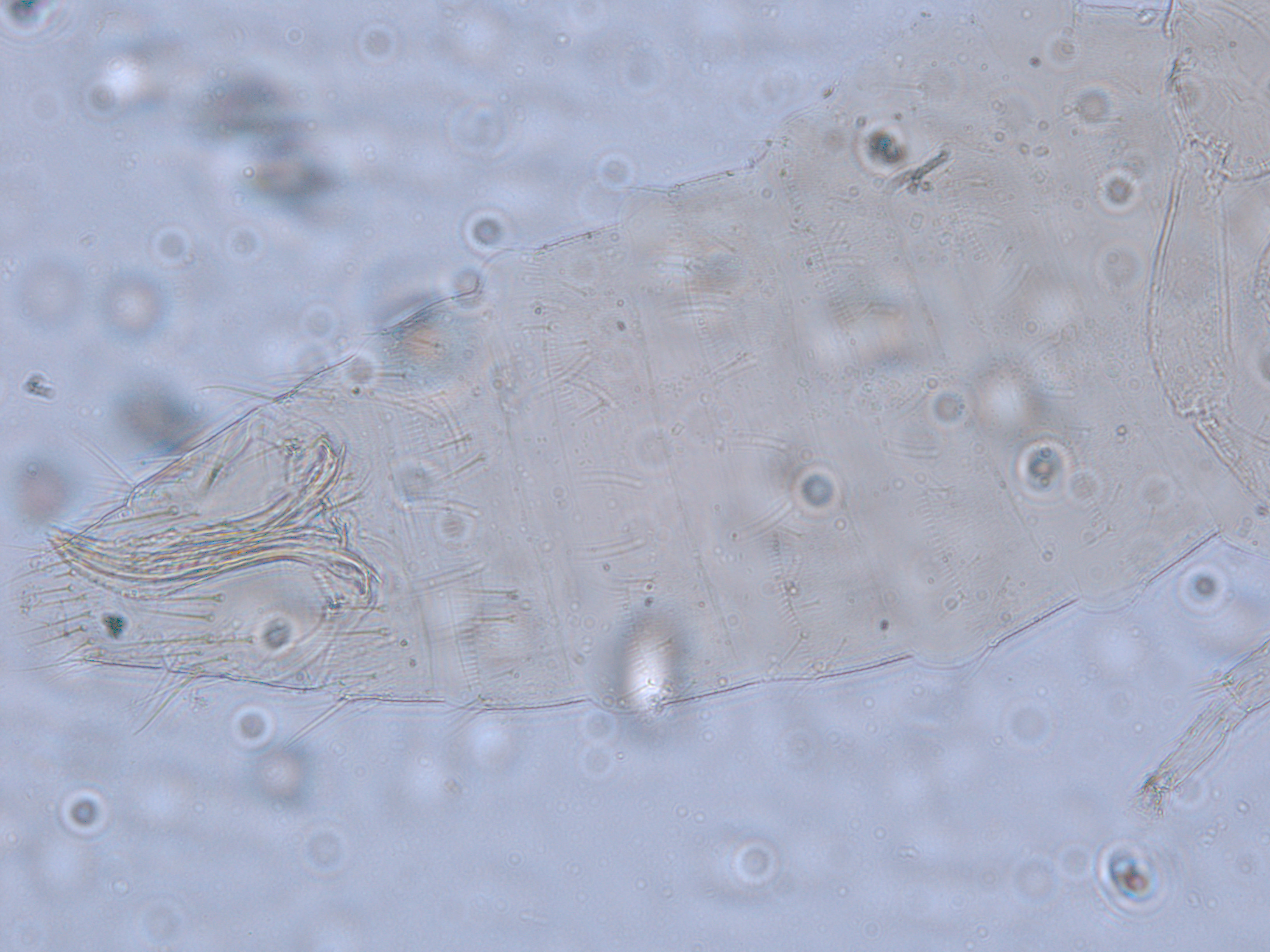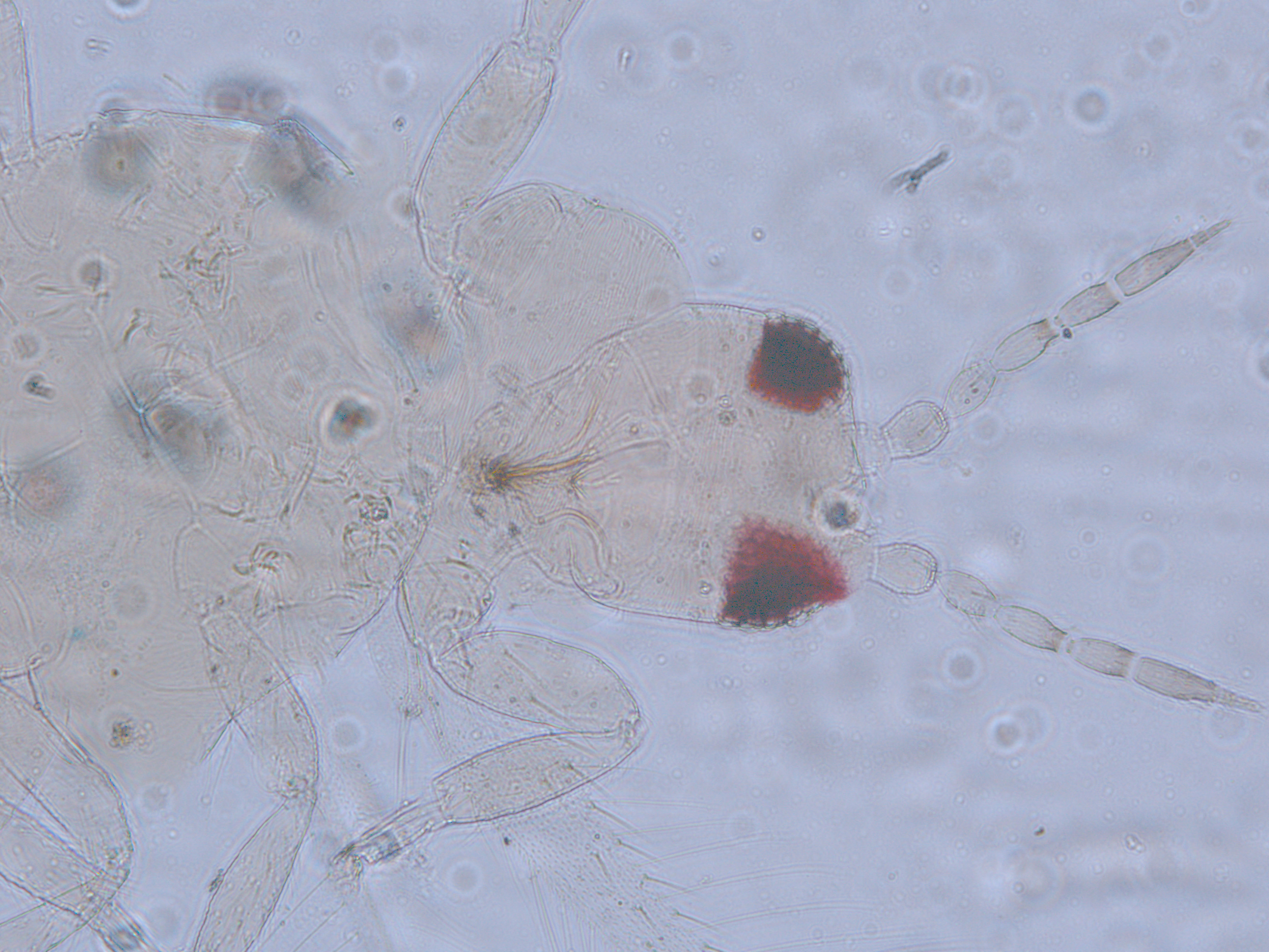 描述:雌虫:体浅黄色,复眼黑红,触角节IV-VI端部和VII-VIII浅灰色;口锥端部、各足跗节端部及产卵器较深。头略短于前胸,前单眼前外侧、单眼间及头后部有交错横线纹;复眼大占据头长的2/3;单眼呈扁三角形排列,位于复眼间略后部;前单眼鬃2对,其1对位于近复眼前内缘,另1对在前单眼前外侧;单眼间鬃位于前、后单眼中途内缘连线上;单眼和复眼后鬃约6对;触角8节,节III略短于IV和VI,节III背和IV腹面有短的叉状感觉锥,节V和VI外端、VI内侧各有简单感觉锥1个;各节近端背面和侧面有较长刚毛,节II-VI有密横排微毛;幕骨小。前胸背板密布横交错线纹于背板,但侧部有3个小的,后中部两侧有一大而横的及一小的无纹区;无长鬃;中胸背板前缘光滑,前部横纹略向前弯,后部两侧侧横线纹各自向中后延伸;前部细孔移位至两侧;前外侧对鬃不长于后中对鬃和后缘对鬃,后中对鬃位于中部,后缘对鬃向前移,接近后中对鬃;后胸背板中部纵网纹清楚,其前和两侧的纵网纹轻而模糊,网纹两侧密布纵弯线纹;前缘对鬃与前中对鬃的长度相似,均在前缘上;前翅前缘鬃22根,前脉鬃6+3,后脉鬃2根,翅瓣前缘端半部鬃4根,后基部有鬃1根,后端缘有长鬃2根;各足各节刚毛相当长但无粗刺。腹部节I-VIII背板两侧密布微毛,中部无毛区较宽,无线纹,约为有毛区宽度的一半;节VII和VIII背板后缘梳完整;细孔距微毛区较劲,中对鬃在其内后方;节IX后缘之前有6对鬃呈弧形排列;节X后部有鬃4对;股节背板和腹板前缘线几乎不可见,腹板节II-VII两侧微毛区宽度总和不及光滑区宽度;节II-VII腹板有细横纹;节II后缘鬃2对,接近后缘,节III-VIII后缘3对鬃较长,远离后缘至前中部,无附属鬃。