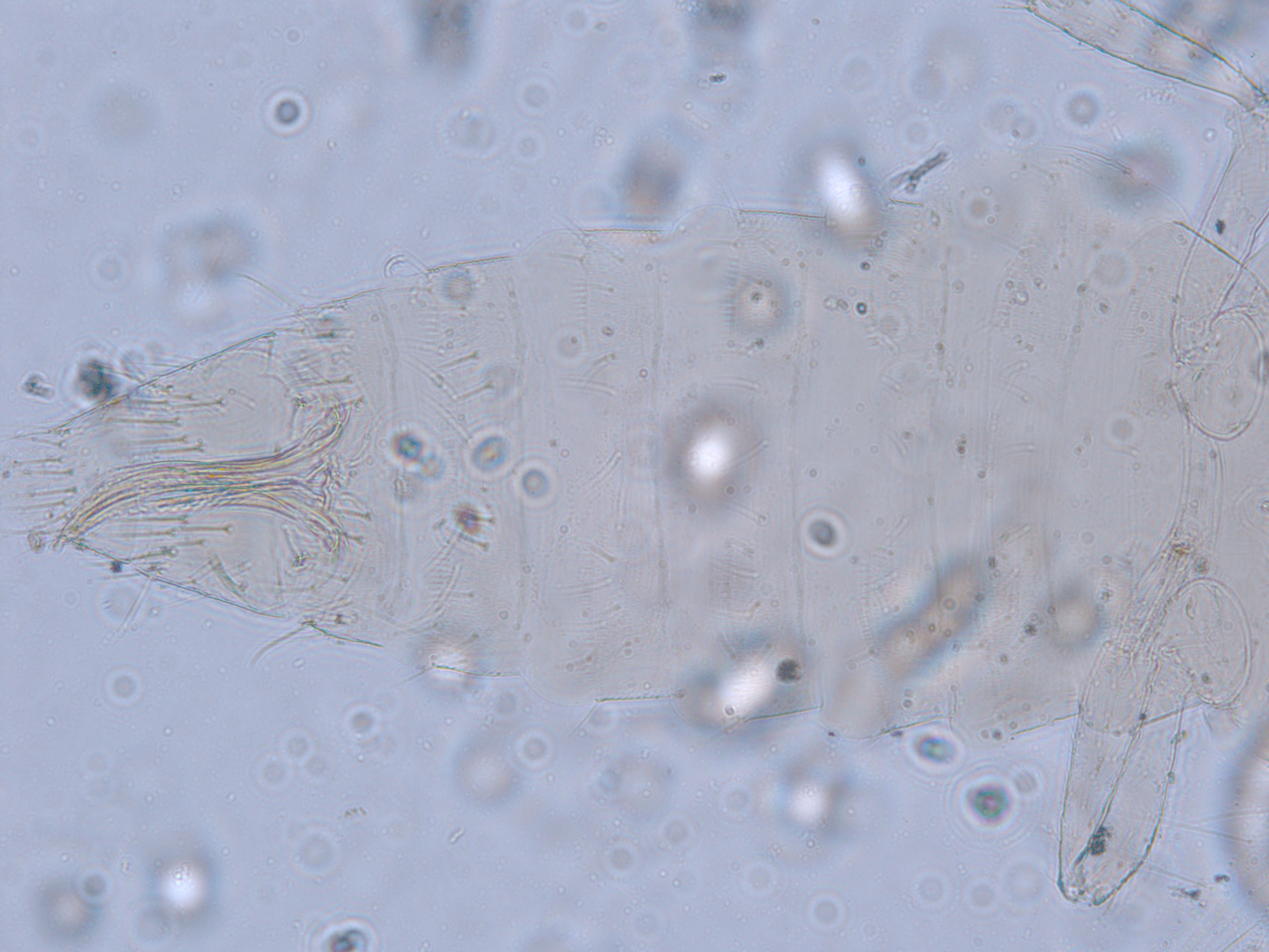 描述:雌虫:体浅黄色,复眼黑红,触角节IV-VI端部和VII-VIII浅灰色;口锥端部、各足跗节端部及产卵器较深。头略短于前胸,前单眼前外侧、单眼间及头后部有交错横线纹;复眼大占据头长的2/3;单眼呈扁三角形排列,位于复眼间略后部;前单眼鬃2对,其1对位于近复眼前内缘,另1对在前单眼前外侧;单眼间鬃位于前、后单眼中途内缘连线上;单眼和复眼后鬃约6对;触角8节,节III略短于IV和VI,节III背和IV腹面有短的叉状感觉锥,节V和VI外端、VI内侧各有简单感觉锥1个;各节近端背面和侧面有较长刚毛,节II-VI有密横排微毛;幕骨小。前胸背板密布横交错线纹于背板,但侧部有3个小的,后中部两侧有一大而横的及一小的无纹区;无长鬃;中胸背板前缘光滑,前部横纹略向前弯,后部两侧侧横线纹各自向中后延伸;前部细孔移位至两侧;前外侧对鬃不长于后中对鬃和后缘对鬃,后中对鬃位于中部,后缘对鬃向前移,接近后中对鬃;后胸背板中部纵网纹清楚,其前和两侧的纵网纹轻而模糊,网纹两侧密布纵弯线纹;前缘对鬃与前中对鬃的长度相似,均在前缘上;前翅前缘鬃22根,前脉鬃6+3,后脉鬃2根,翅瓣前缘端半部鬃4根,后基部有鬃1根,后端缘有长鬃2根;各足各节刚毛相当长但无粗刺。腹部节I-VIII背板两侧密布微毛,中部无毛区较宽,无线纹,约为有毛区宽度的一半;节VII和VIII背板后缘梳完整;细孔距微毛区较劲,中对鬃在其内后方;节IX后缘之前有6对鬃呈弧形排列;节X后部有鬃4对;股节背板和腹板前缘线几乎不可见,腹板节II-VII两侧微毛区宽度总和不及光滑区宽度;节II-VII腹板有细横纹;节II后缘鬃2对,接近后缘,节III-VIII后缘3对鬃较长,远离后缘至前中部,无附属鬃。