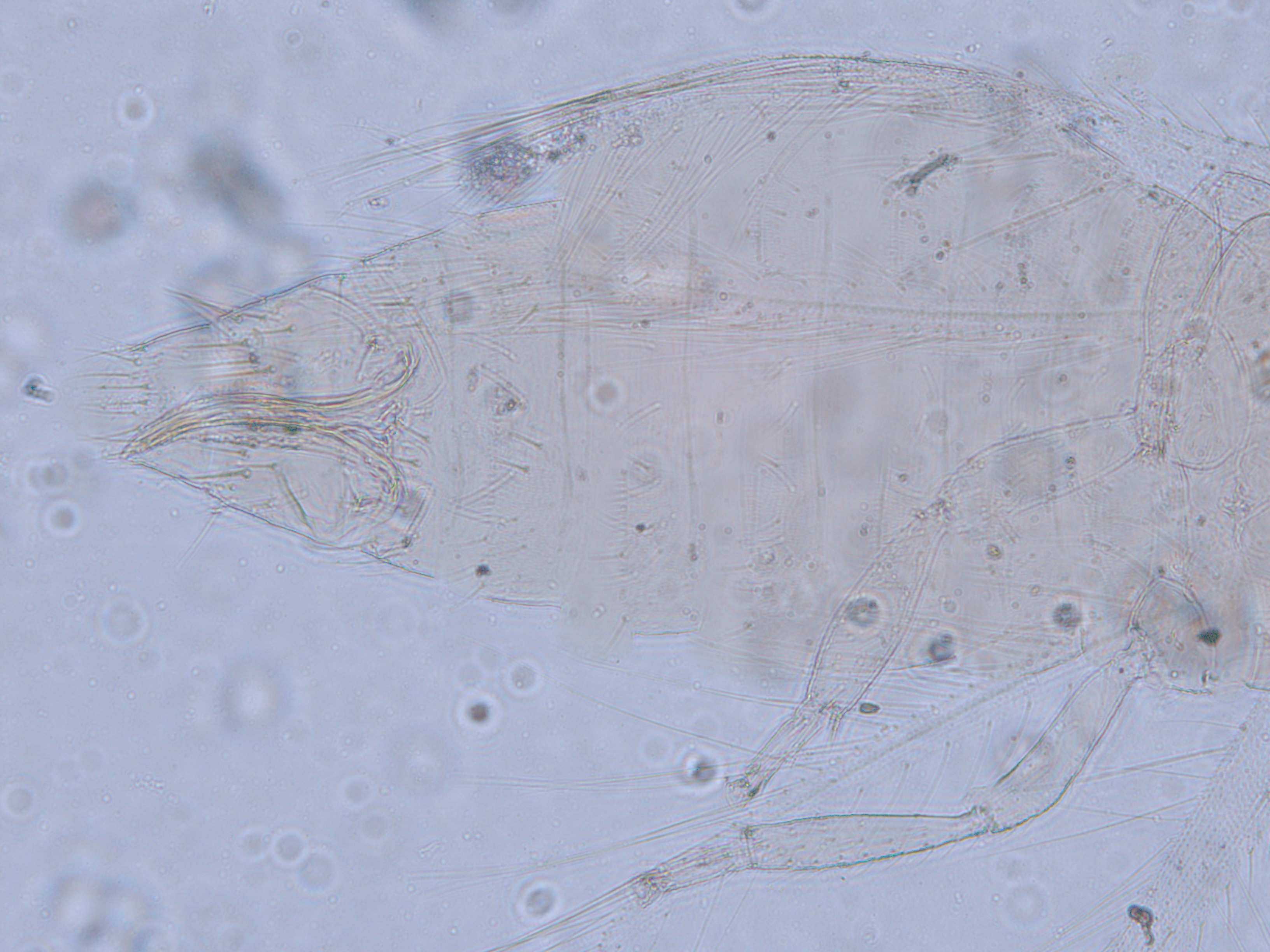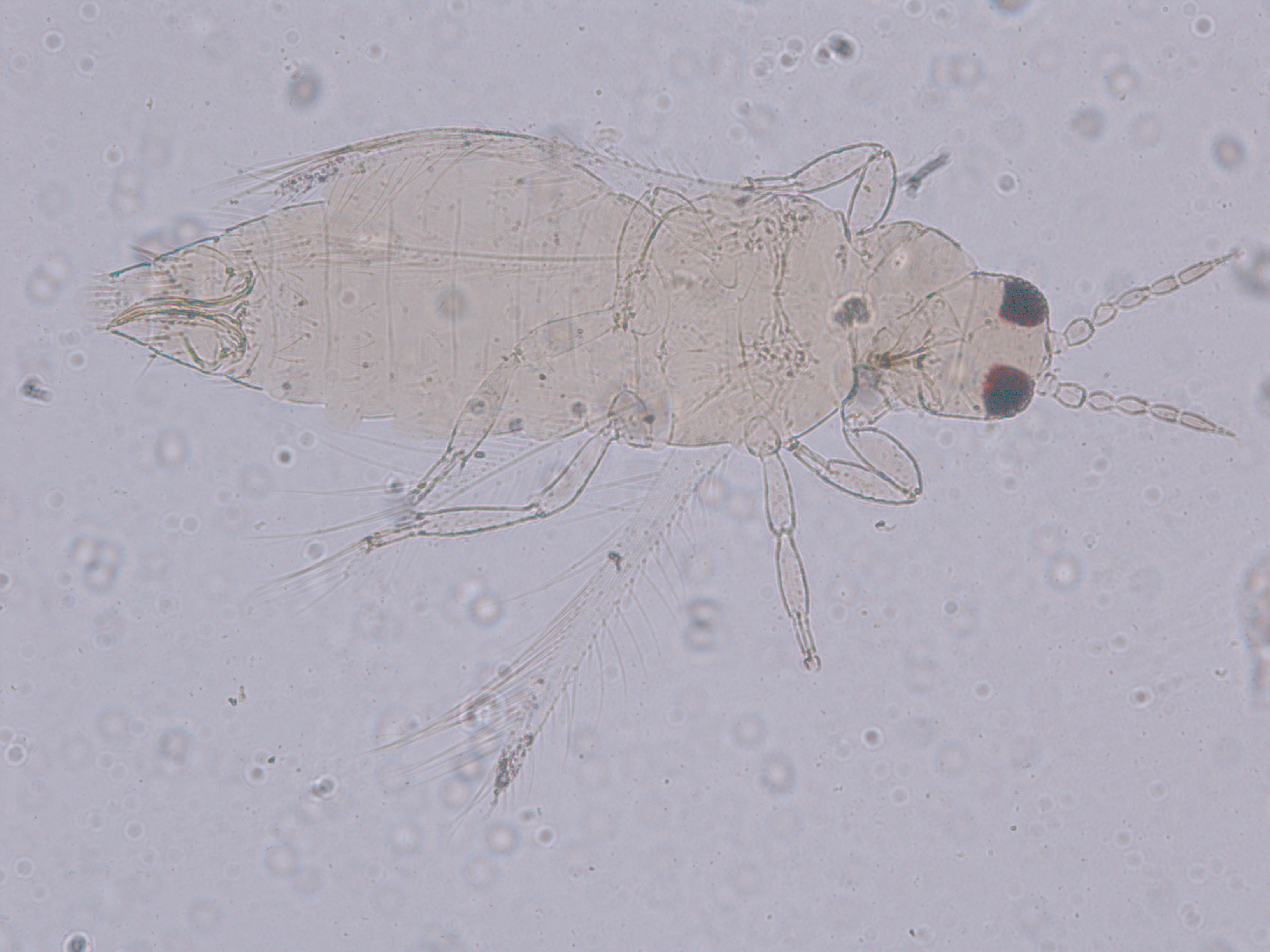 描述:雌虫:体浅黄色,复眼黑红,触角节IV-VI端部和VII-VIII浅灰色;口锥端部、各足跗节端部及产卵器较深。头略短于前胸,前单眼前外侧、单眼间及头后部有交错横线纹;复眼大占据头长的2/3;单眼呈扁三角形排列,位于复眼间略后部;前单眼鬃2对,其1对位于近复眼前内缘,另1对在前单眼前外侧;单眼间鬃位于前、后单眼中途内缘连线上;单眼和复眼后鬃约6对;触角8节,节III略短于IV和VI,节III背和IV腹面有短的叉状感觉锥,节V和VI外端、VI内侧各有简单感觉锥1个;各节近端背面和侧面有较长刚毛,节II-VI有密横排微毛;幕骨小。前胸背板密布横交错线纹于背板,但侧部有3个小的,后中部两侧有一大而横的及一小的无纹区;无长鬃;中胸背板前缘光滑,前部横纹略向前弯,后部两侧侧横线纹各自向中后延伸;前部细孔移位至两侧;前外侧对鬃不长于后中对鬃和后缘对鬃,后中对鬃位于中部,后缘对鬃向前移,接近后中对鬃;后胸背板中部纵网纹清楚,其前和两侧的纵网纹轻而模糊,网纹两侧密布纵弯线纹;前缘对鬃与前中对鬃的长度相似,均在前缘上;前翅前缘鬃22根,前脉鬃6+3,后脉鬃2根,翅瓣前缘端半部鬃4根,后基部有鬃1根,后端缘有长鬃2根;各足各节刚毛相当长但无粗刺。腹部节I-VIII背板两侧密布微毛,中部无毛区较宽,无线纹,约为有毛区宽度的一半;节VII和VIII背板后缘梳完整;细孔距微毛区较劲,中对鬃在其内后方;节IX后缘之前有6对鬃呈弧形排列;节X后部有鬃4对;股节背板和腹板前缘线几乎不可见,腹板节II-VII两侧微毛区宽度总和不及光滑区宽度;节II-VII腹板有细横纹;节II后缘鬃2对,接近后缘,节III-VIII后缘3对鬃较长,远离后缘至前中部,无附属鬃。