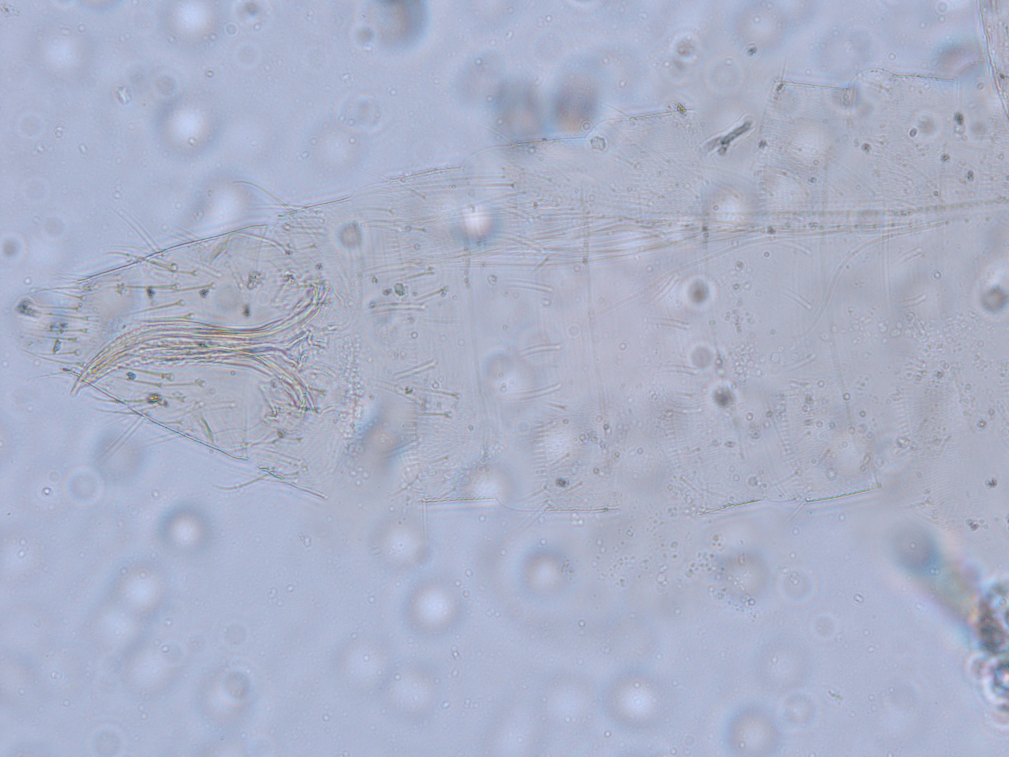 描述:雌虫:体浅黄色,复眼黑红,触角节IV-VI端部和VII-VIII浅灰色;口锥端部、各足跗节端部及产卵器较深。头略短于前胸,前单眼前外侧、单眼间及头后部有交错横线纹;复眼大占据头长的2/3;单眼呈扁三角形排列,位于复眼间略后部;前单眼鬃2对,其1对位于近复眼前内缘,另1对在前单眼前外侧;单眼间鬃位于前、后单眼中途内缘连线上;单眼和复眼后鬃约6对;触角8节,节III略短于IV和VI,节III背和IV腹面有短的叉状感觉锥,节V和VI外端、VI内侧各有简单感觉锥1个;各节近端背面和侧面有较长刚毛,节II-VI有密横排微毛;幕骨小。前胸背板密布横交错线纹于背板,但侧部有3个小的,后中部两侧有一大而横的及一小的无纹区;无长鬃;中胸背板前缘光滑,前部横纹略向前弯,后部两侧侧横线纹各自向中后延伸;前部细孔移位至两侧;前外侧对鬃不长于后中对鬃和后缘对鬃,后中对鬃位于中部,后缘对鬃向前移,接近后中对鬃;后胸背板中部纵网纹清楚,其前和两侧的纵网纹轻而模糊,网纹两侧密布纵弯线纹;前缘对鬃与前中对鬃的长度相似,均在前缘上;前翅前缘鬃22根,前脉鬃6+3,后脉鬃2根,翅瓣前缘端半部鬃4根,后基部有鬃1根,后端缘有长鬃2根;各足各节刚毛相当长但无粗刺。腹部节I-VIII背板两侧密布微毛,中部无毛区较宽,无线纹,约为有毛区宽度的一半;节VII和VIII背板后缘梳完整;细孔距微毛区较劲,中对鬃在其内后方;节IX后缘之前有6对鬃呈弧形排列;节X后部有鬃4对;股节背板和腹板前缘线几乎不可见,腹板节II-VII两侧微毛区宽度总和不及光滑区宽度;节II-VII腹板有细横纹;节II后缘鬃2对,接近后缘,节III-VIII后缘3对鬃较长,远离后缘至前中部,无附属鬃。