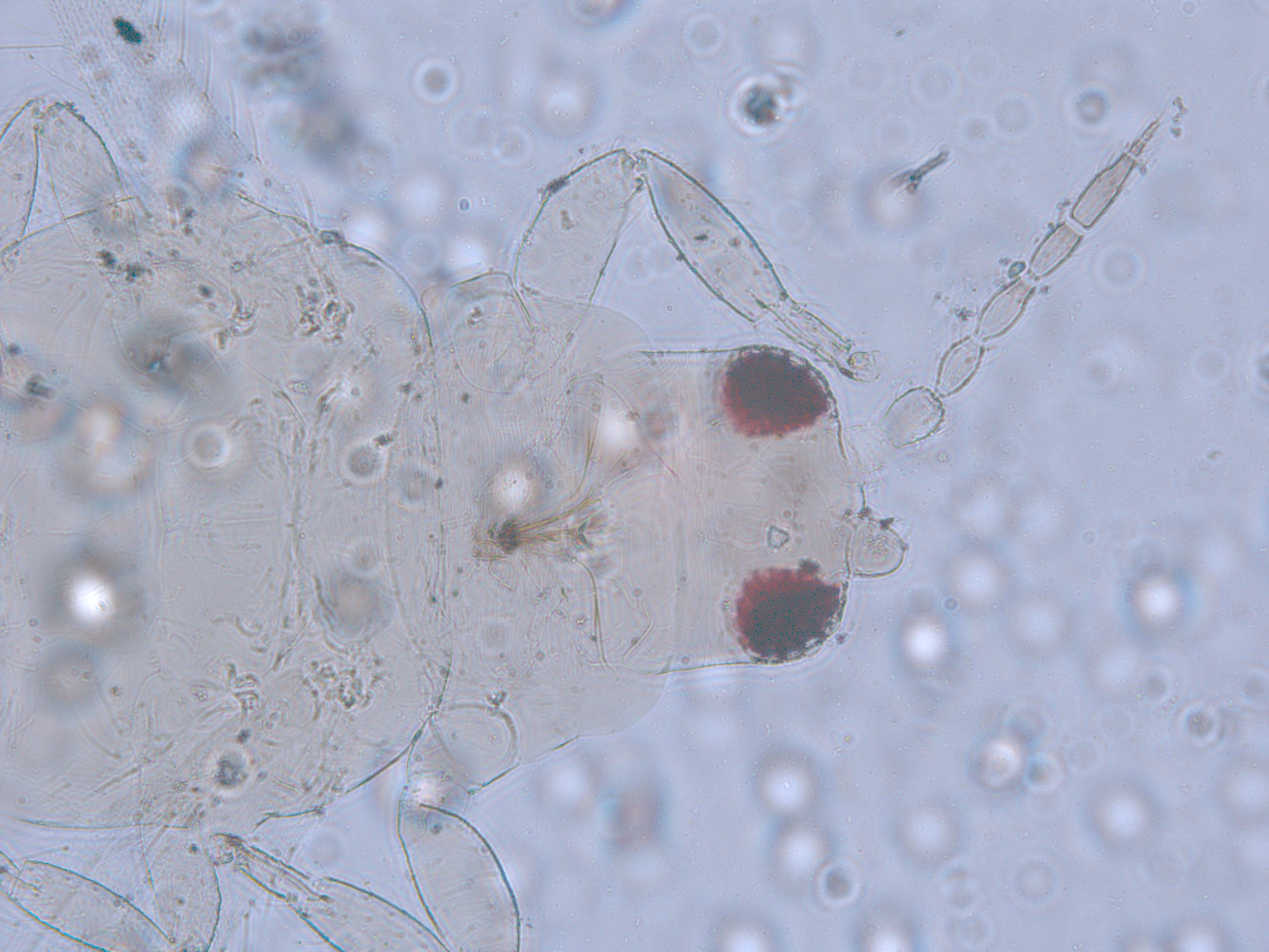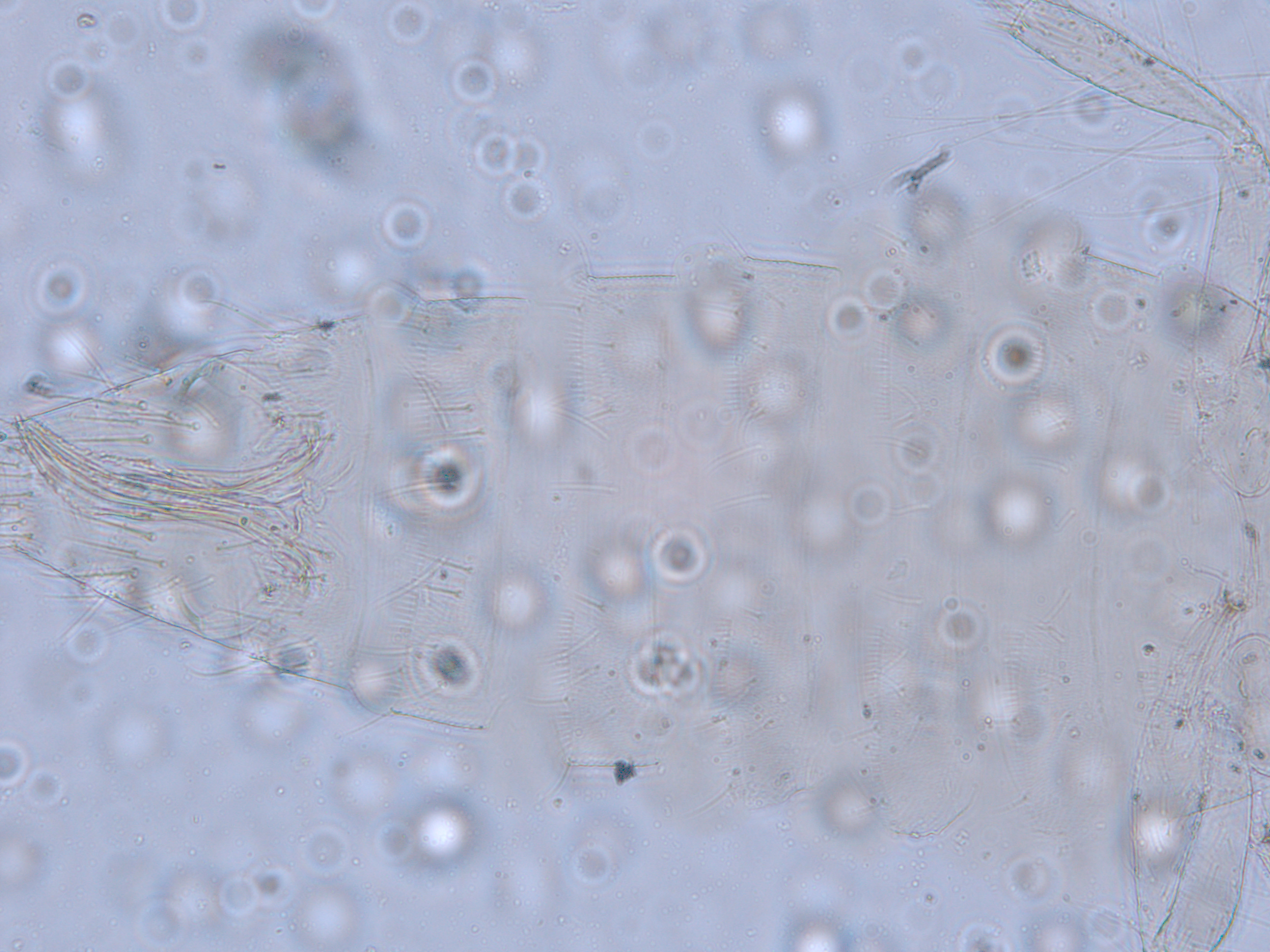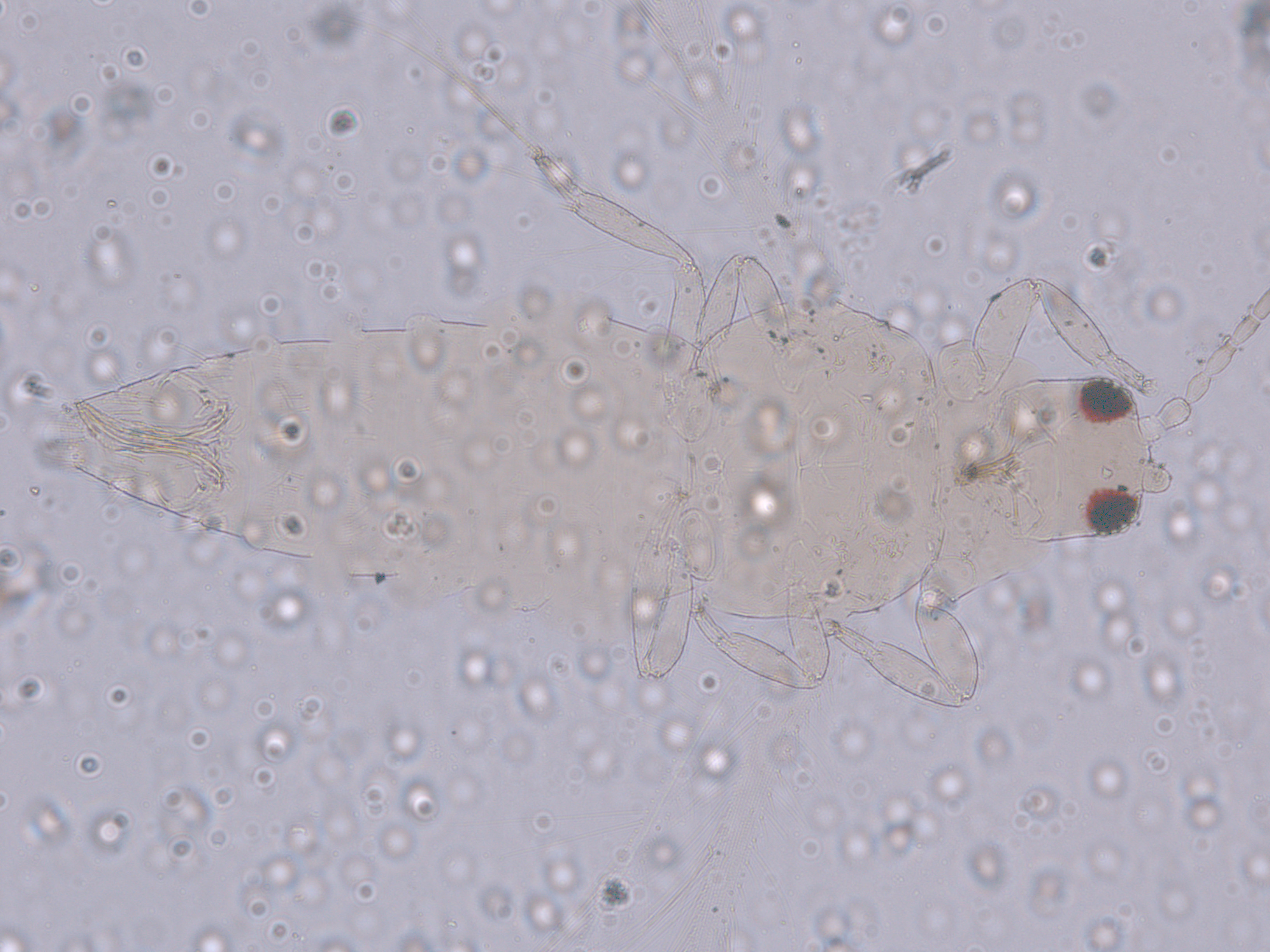 描述:雌虫:体浅黄色,复眼黑红,触角节IV-VI端部和VII-VIII浅灰色;口锥端部、各足跗节端部及产卵器较深。头略短于前胸,前单眼前外侧、单眼间及头后部有交错横线纹;复眼大占据头长的2/3;单眼呈扁三角形排列,位于复眼间略后部;前单眼鬃2对,其1对位于近复眼前内缘,另1对在前单眼前外侧;单眼间鬃位于前、后单眼中途内缘连线上;单眼和复眼后鬃约6对;触角8节,节III略短于IV和VI,节III背和IV腹面有短的叉状感觉锥,节V和VI外端、VI内侧各有简单感觉锥1个;各节近端背面和侧面有较长刚毛,节II-VI有密横排微毛;幕骨小。前胸背板密布横交错线纹于背板,但侧部有3个小的,后中部两侧有一大而横的及一小的无纹区;无长鬃;中胸背板前缘光滑,前部横纹略向前弯,后部两侧侧横线纹各自向中后延伸;前部细孔移位至两侧;前外侧对鬃不长于后中对鬃和后缘对鬃,后中对鬃位于中部,后缘对鬃向前移,接近后中对鬃;后胸背板中部纵网纹清楚,其前和两侧的纵网纹轻而模糊,网纹两侧密布纵弯线纹;前缘对鬃与前中对鬃的长度相似,均在前缘上;前翅前缘鬃22根,前脉鬃6+3,后脉鬃2根,翅瓣前缘端半部鬃4根,后基部有鬃1根,后端缘有长鬃2根;各足各节刚毛相当长但无粗刺。腹部节I-VIII背板两侧密布微毛,中部无毛区较宽,无线纹,约为有毛区宽度的一半;节VII和VIII背板后缘梳完整;细孔距微毛区较劲,中对鬃在其内后方;节IX后缘之前有6对鬃呈弧形排列;节X后部有鬃4对;股节背板和腹板前缘线几乎不可见,腹板节II-VII两侧微毛区宽度总和不及光滑区宽度;节II-VII腹板有细横纹;节II后缘鬃2对,接近后缘,节III-VIII后缘3对鬃较长,远离后缘至前中部,无附属鬃。