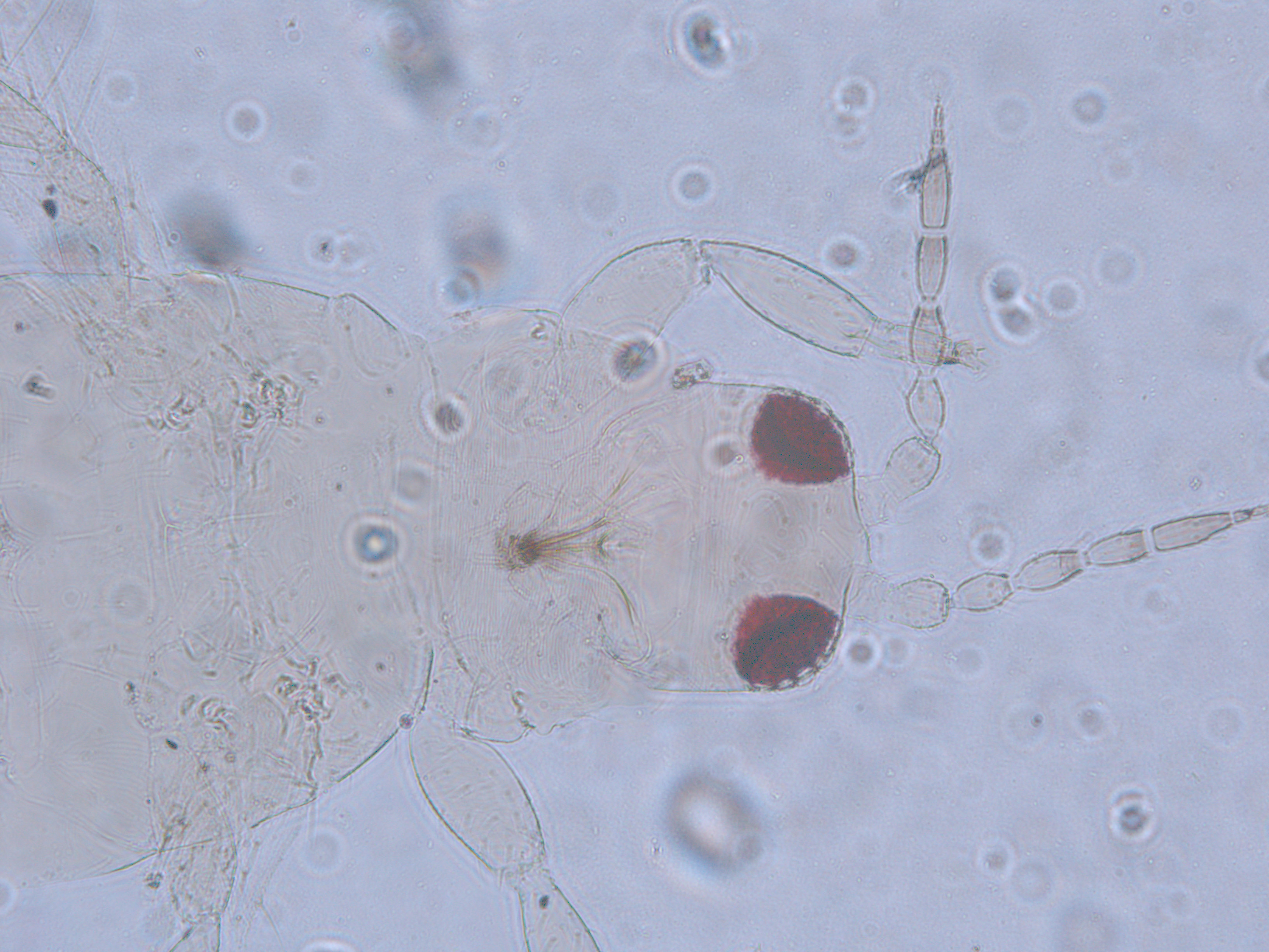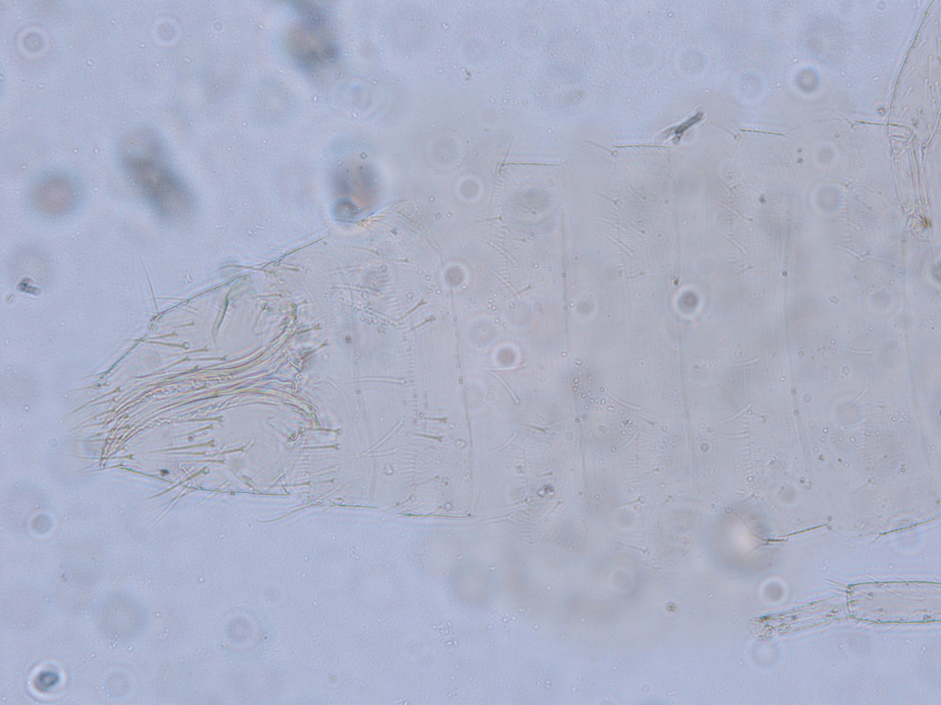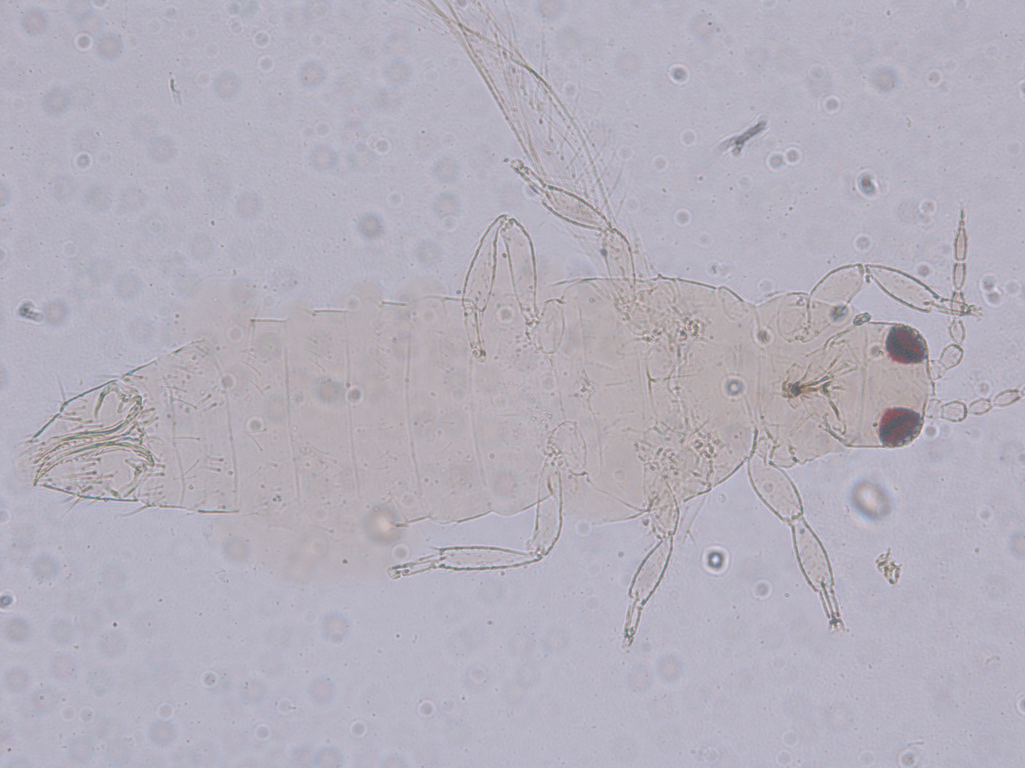 描述:雌虫:体浅黄色,复眼黑红,触角节IV-VI端部和VII-VIII浅灰色;口锥端部、各足跗节端部及产卵器较深。头略短于前胸,前单眼前外侧、单眼间及头后部有交错横线纹;复眼大占据头长的2/3;单眼呈扁三角形排列,位于复眼间略后部;前单眼鬃2对,其1对位于近复眼前内缘,另1对在前单眼前外侧;单眼间鬃位于前、后单眼中途内缘连线上;单眼和复眼后鬃约6对;触角8节,节III略短于IV和VI,节III背和IV腹面有短的叉状感觉锥,节V和VI外端、VI内侧各有简单感觉锥1个;各节近端背面和侧面有较长刚毛,节II-VI有密横排微毛;幕骨小。前胸背板密布横交错线纹于背板,但侧部有3个小的,后中部两侧有一大而横的及一小的无纹区;无长鬃;中胸背板前缘光滑,前部横纹略向前弯,后部两侧侧横线纹各自向中后延伸;前部细孔移位至两侧;前外侧对鬃不长于后中对鬃和后缘对鬃,后中对鬃位于中部,后缘对鬃向前移,接近后中对鬃;后胸背板中部纵网纹清楚,其前和两侧的纵网纹轻而模糊,网纹两侧密布纵弯线纹;前缘对鬃与前中对鬃的长度相似,均在前缘上;前翅前缘鬃22根,前脉鬃6+3,后脉鬃2根,翅瓣前缘端半部鬃4根,后基部有鬃1根,后端缘有长鬃2根;各足各节刚毛相当长但无粗刺。腹部节I-VIII背板两侧密布微毛,中部无毛区较宽,无线纹,约为有毛区宽度的一半;节VII和VIII背板后缘梳完整;细孔距微毛区较劲,中对鬃在其内后方;节IX后缘之前有6对鬃呈弧形排列;节X后部有鬃4对;股节背板和腹板前缘线几乎不可见,腹板节II-VII两侧微毛区宽度总和不及光滑区宽度;节II-VII腹板有细横纹;节II后缘鬃2对,接近后缘,节III-VIII后缘3对鬃较长,远离后缘至前中部,无附属鬃。