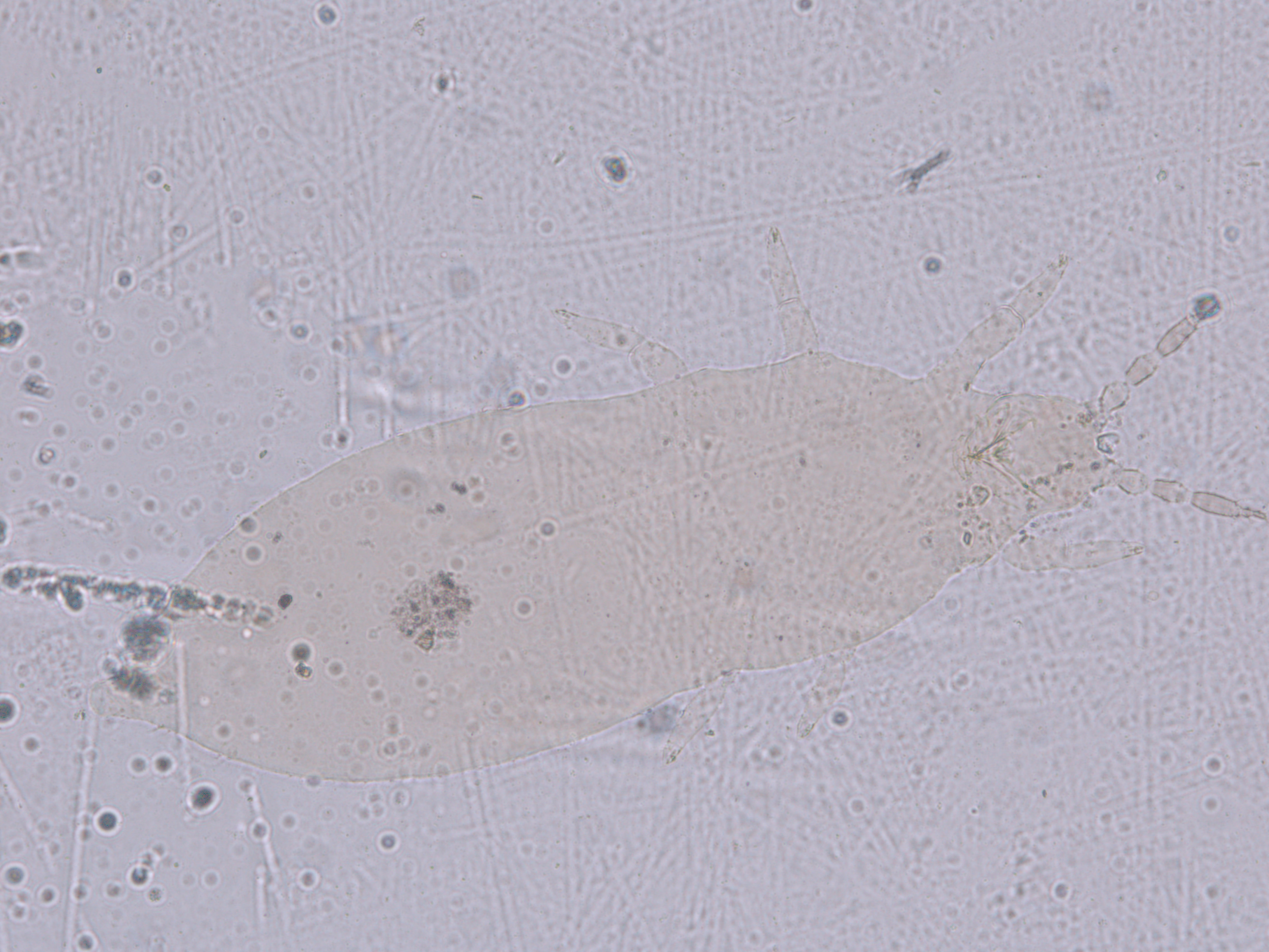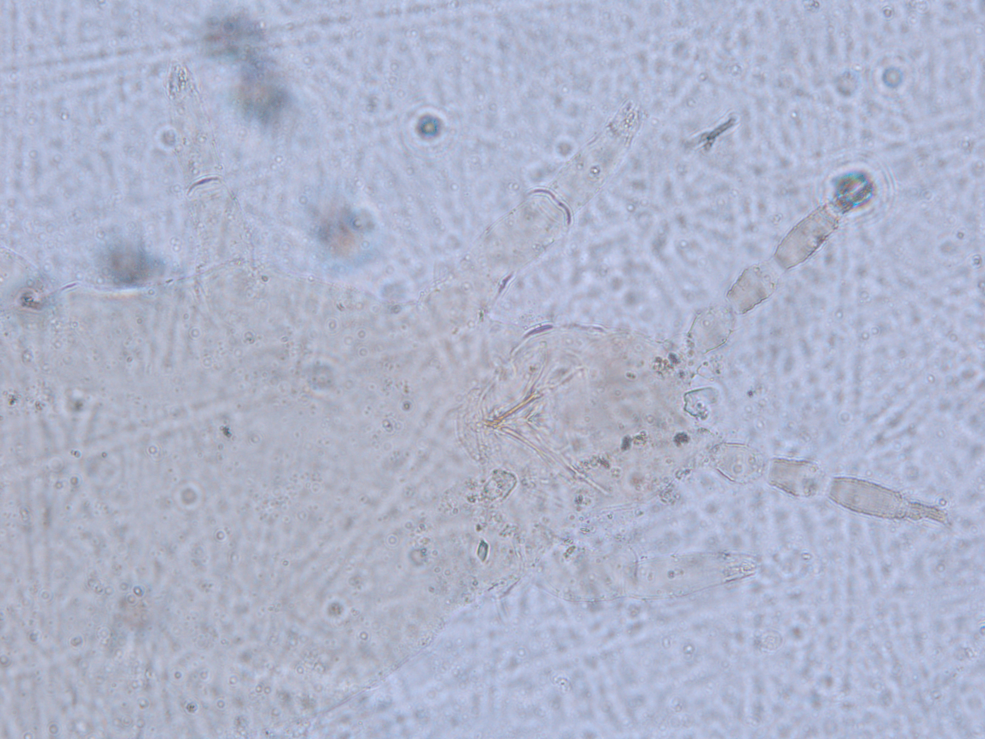 描述:二龄若虫:体乳黄色,复眼红色,触角节I浅白色,II-VII浅灰色;口锥端部橙黄色;头短于前胸;单眼缺;头背光滑;复眼间鬃1对,后鬃1对;触角7节,各基部数节的刚毛较短,端部2节的刚毛较长,节I-II光滑,节III约等长于IV,边缘具覆瓦状缺刻,端部有2轮微毛,节IV最粗,纺锤状,有5轮微毛,外端有1粗的,内下有1细长的简单感觉锥,节V-VI外侧各有1较细长感觉锥。头腹面约8根短刚毛;头腹面、胸部和腹部背板和腹板密布极微颗粒,但腹部节IX-X颗粒较稀疏;腹部节背板前中部具6对短鬃,在节IX-X的相对长些;各节腹板后缘有短鬃6对;各足刚毛比胸部和腹部背板刚毛长;所有刚毛端部尖细。