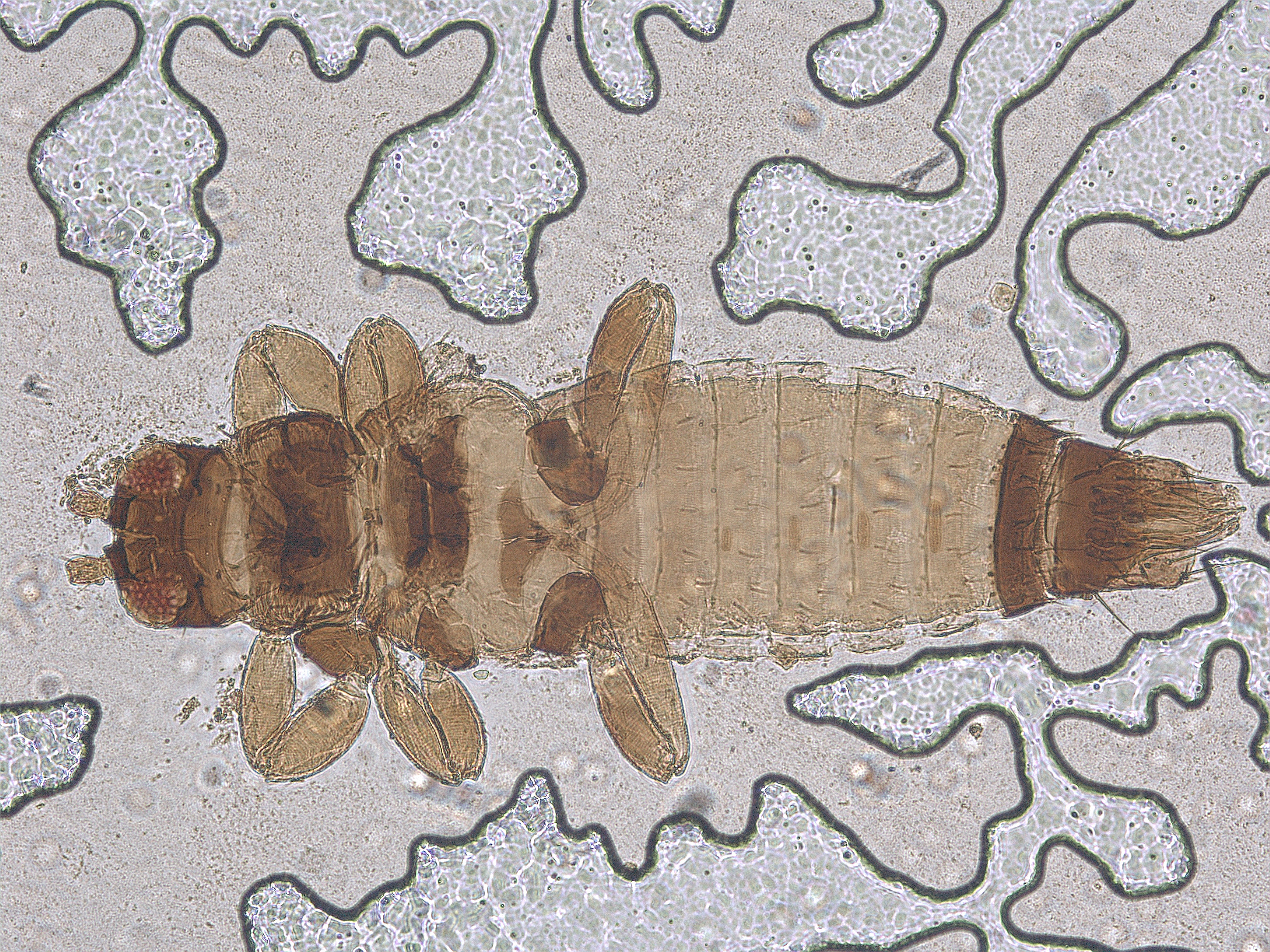 描述:雄虫:短翅型,一般体色和结构相似于雌虫,但体较小,腹部节I-VII黄色,翅短小;腹部节IX背鬃长度近似,前排2对,中排1对,后排4对;腹板节IV-VII有横腺域。