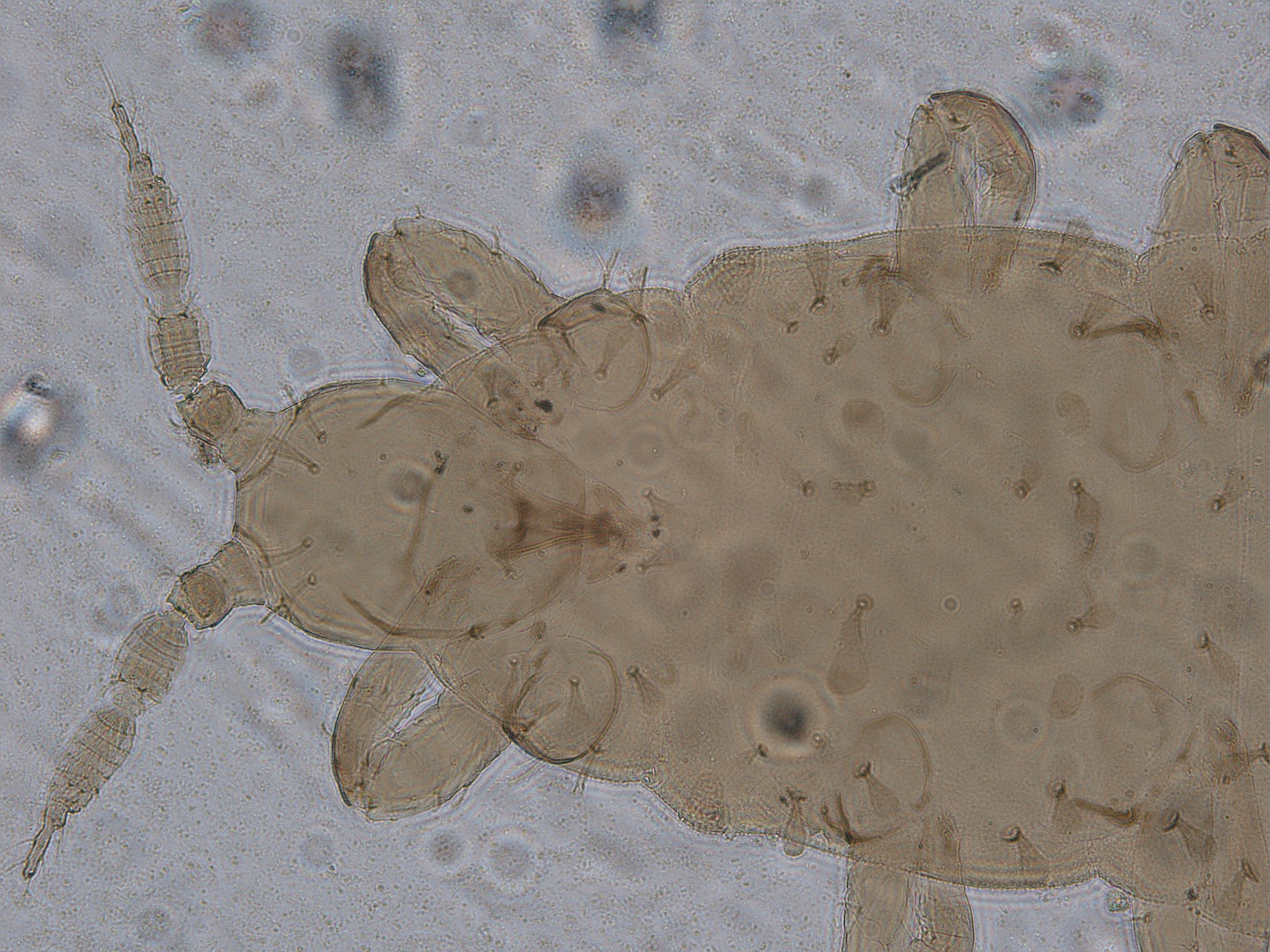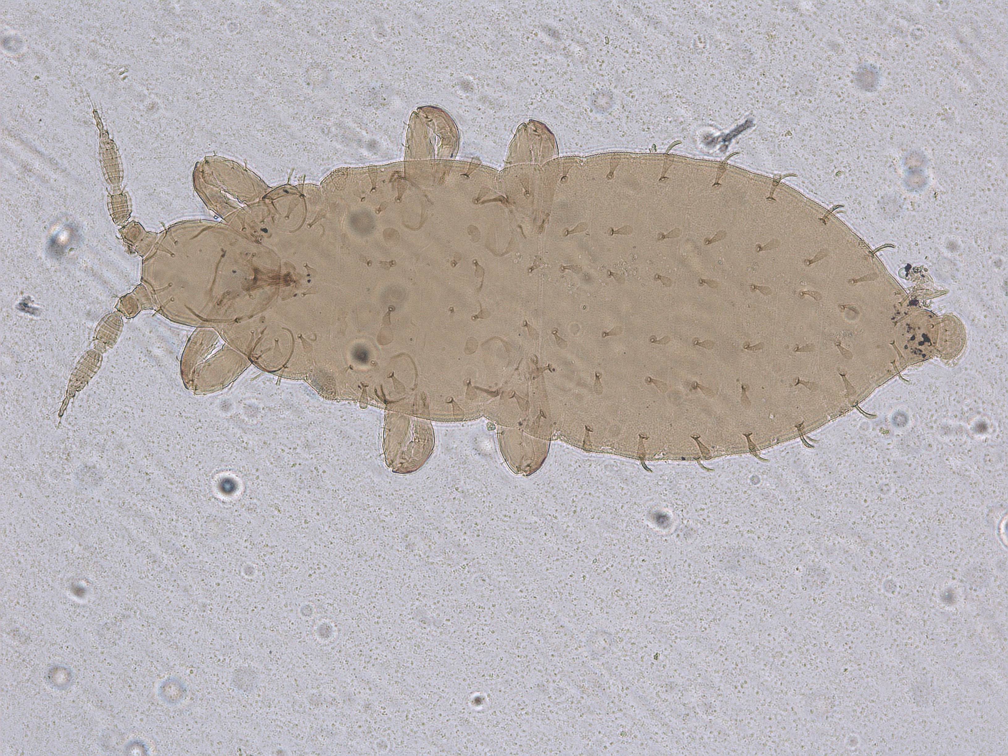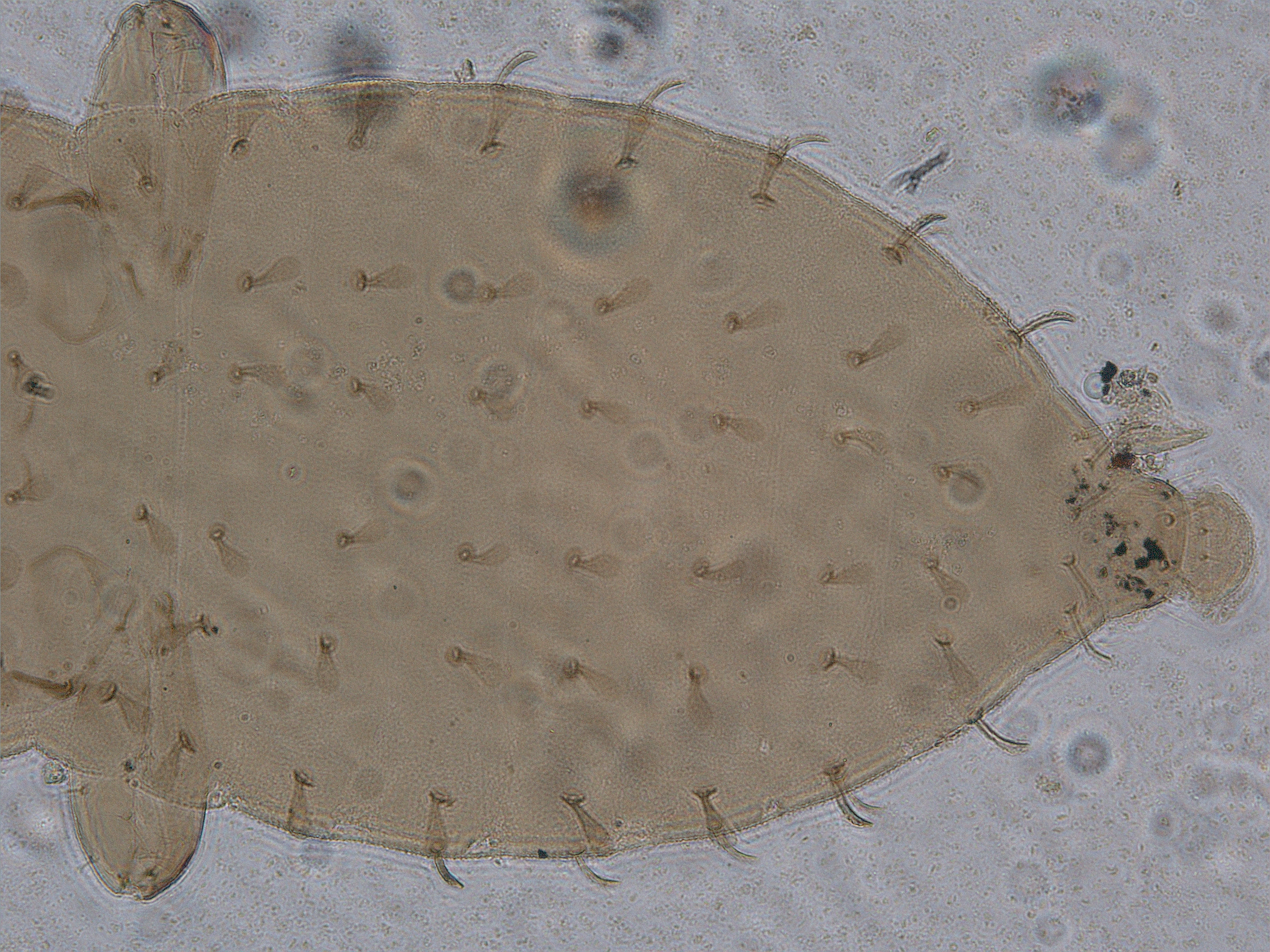 描述:二龄若虫:体黄色,但触角节I及III-VII浅黄色,体鬃暗黄色;头背后部、胸部、腹部背板布满微颗粒;头背复眼内各鬃略扇形,触角节II和III背端部各一对鬃略扇形,前胸背板有7对鬃,中后胸背板有7对鬃,腹部节I有2对,节II-VII各有3对鬃,节IX较长鬃及节X中对鬃均略扇形。