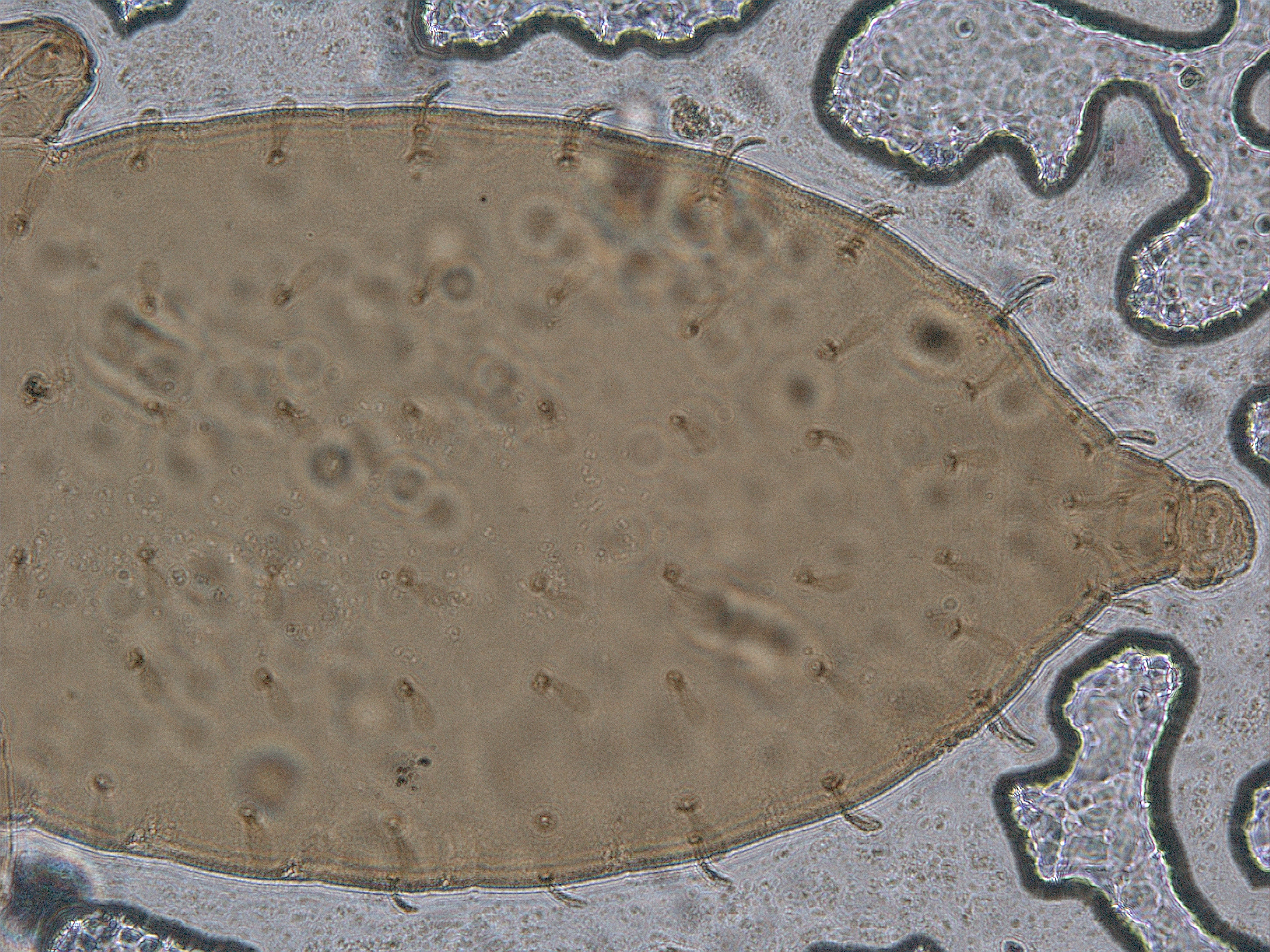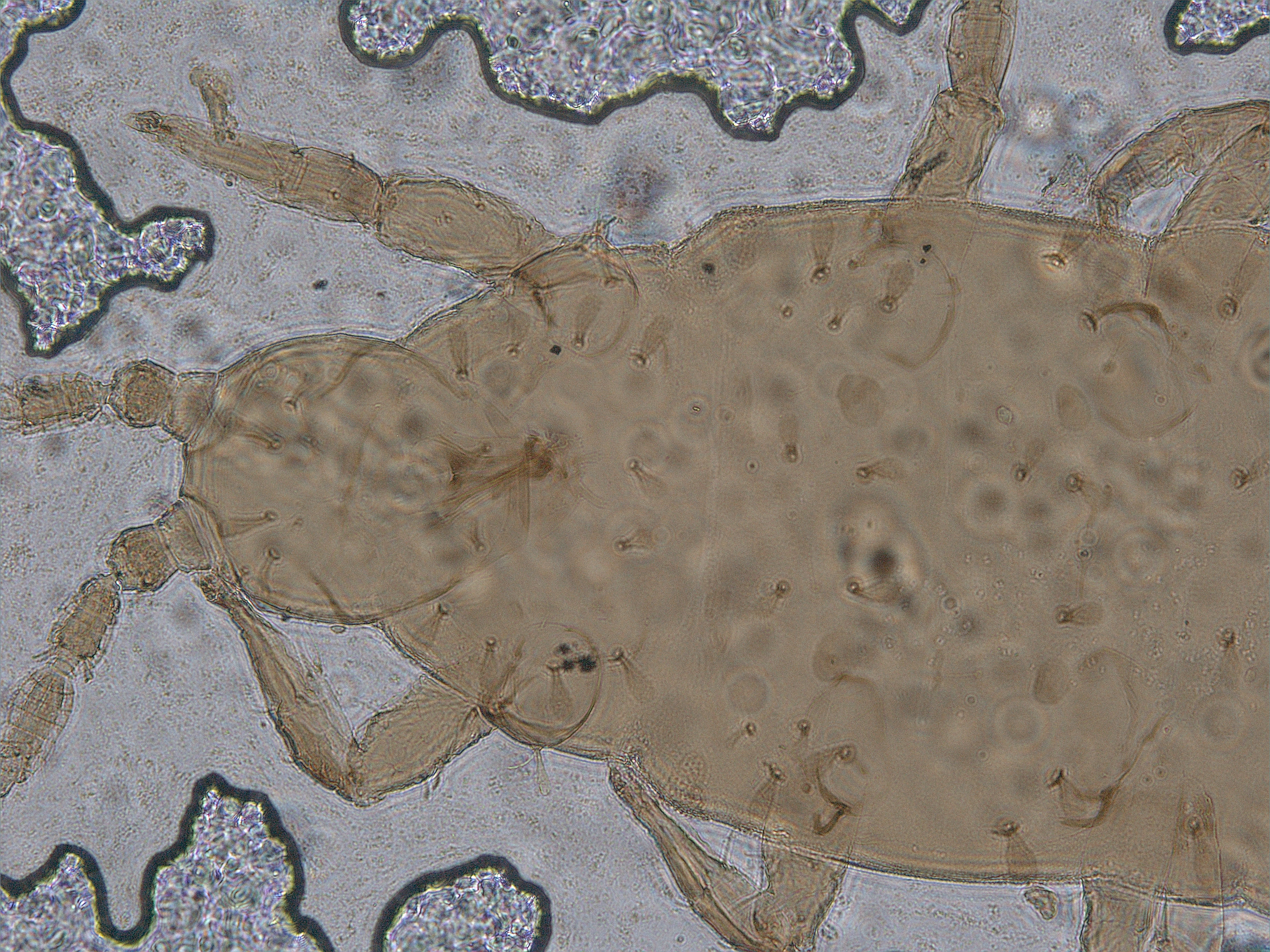 描述:二龄若虫:体黄色,但触角节I及III-VII浅黄色,体鬃暗黄色;头背后部、胸部、腹部背板布满微颗粒;头背复眼内各鬃略扇形,触角节II和III背端部各一对鬃略扇形,前胸背板有7对鬃,中后胸背板有7对鬃,腹部节I有2对,节II-VII各有3对鬃,节IX较长鬃及节X中对鬃均略扇形。