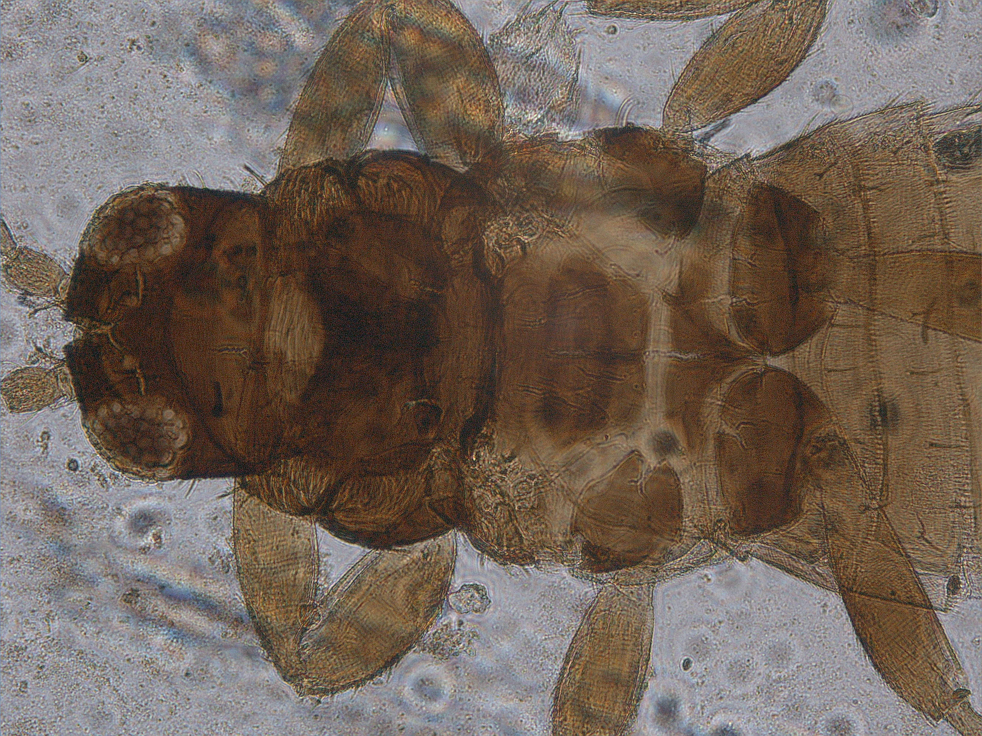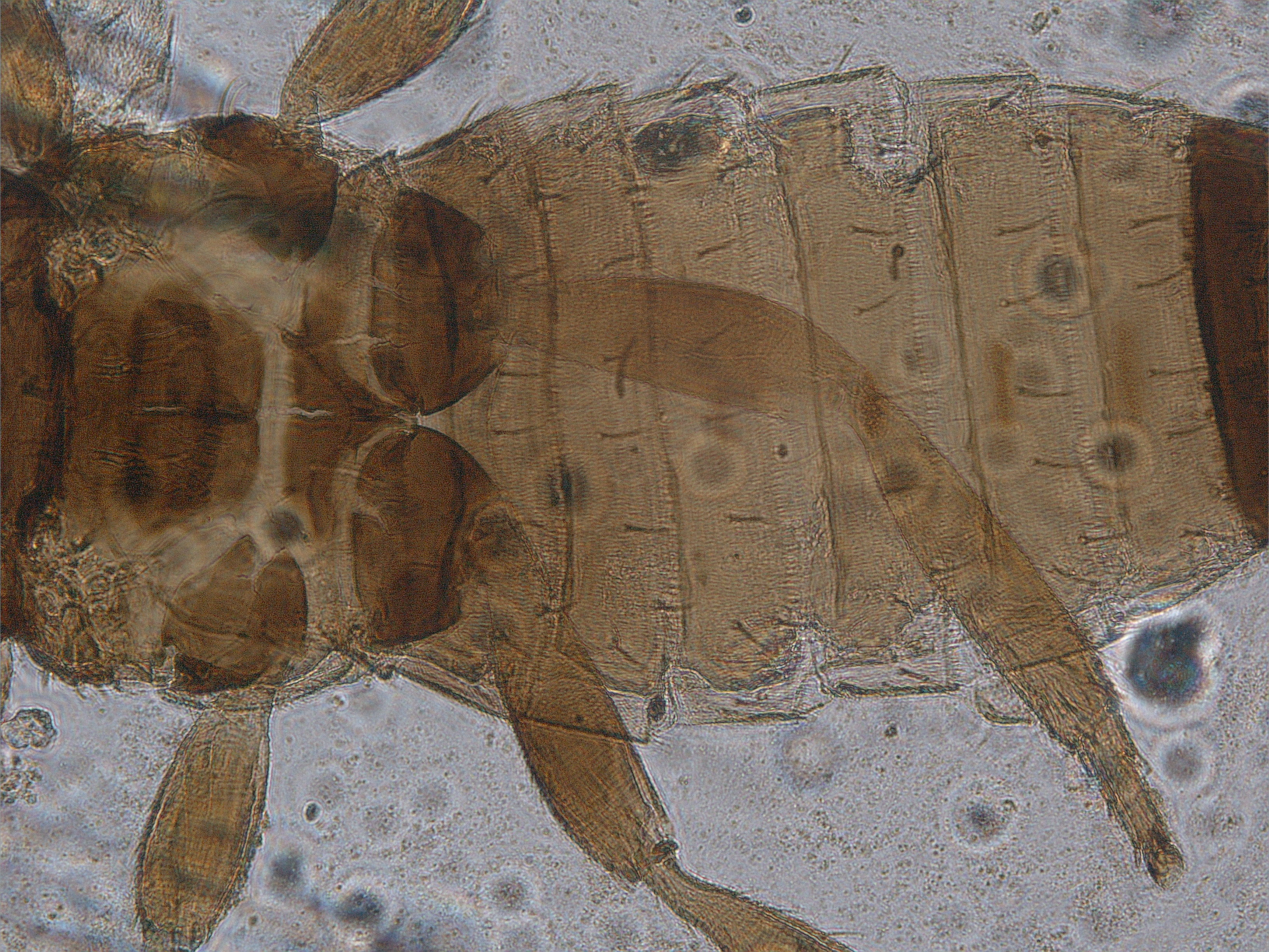 描述:雄虫:短翅型,一般体色和结构相似于雌虫,但体较小,腹部节I-VII黄色,翅短小;腹部节IX背鬃长度近似,前排2对,中排1对,后排4对;腹板节IV-VII有横腺域。