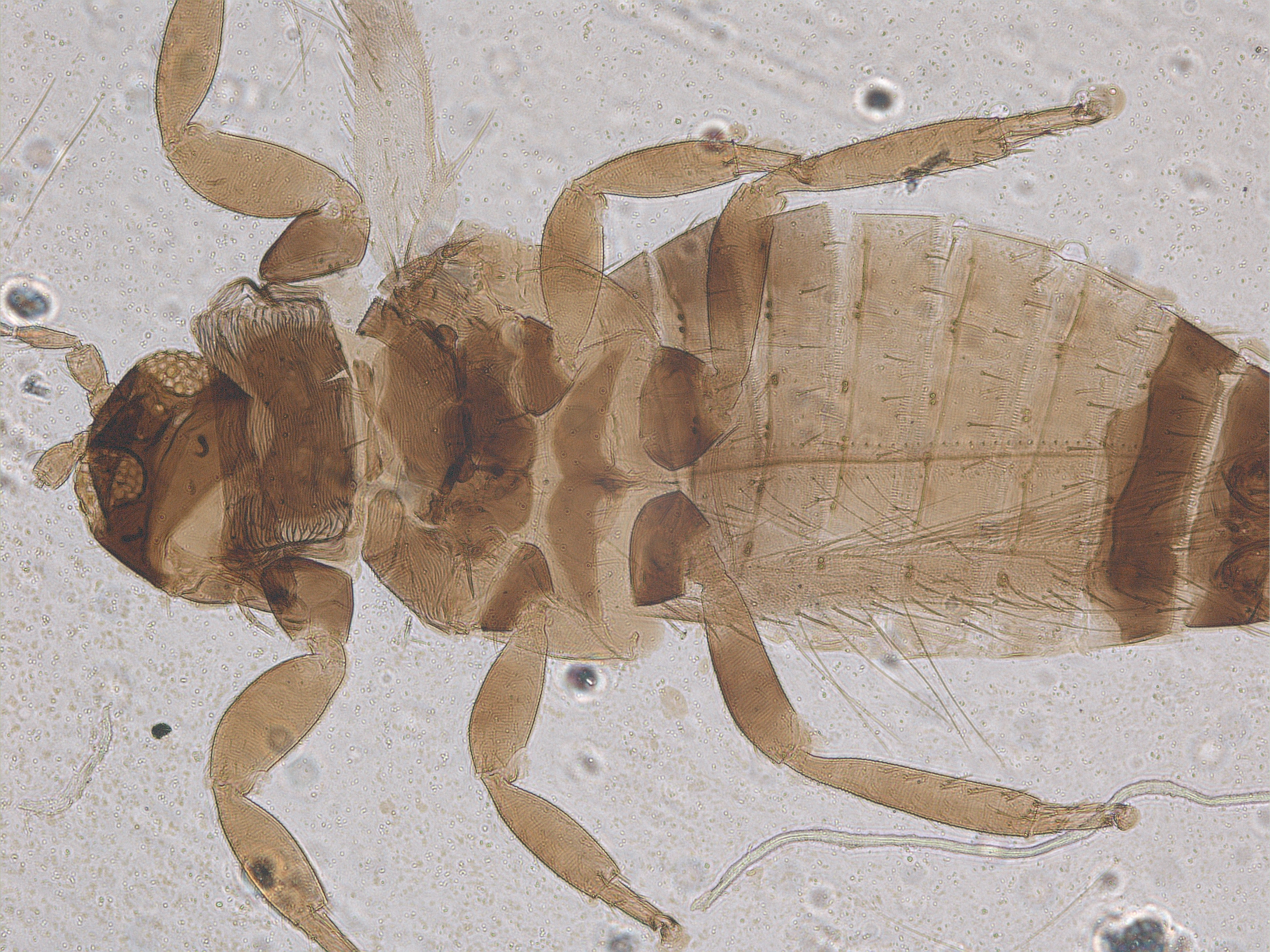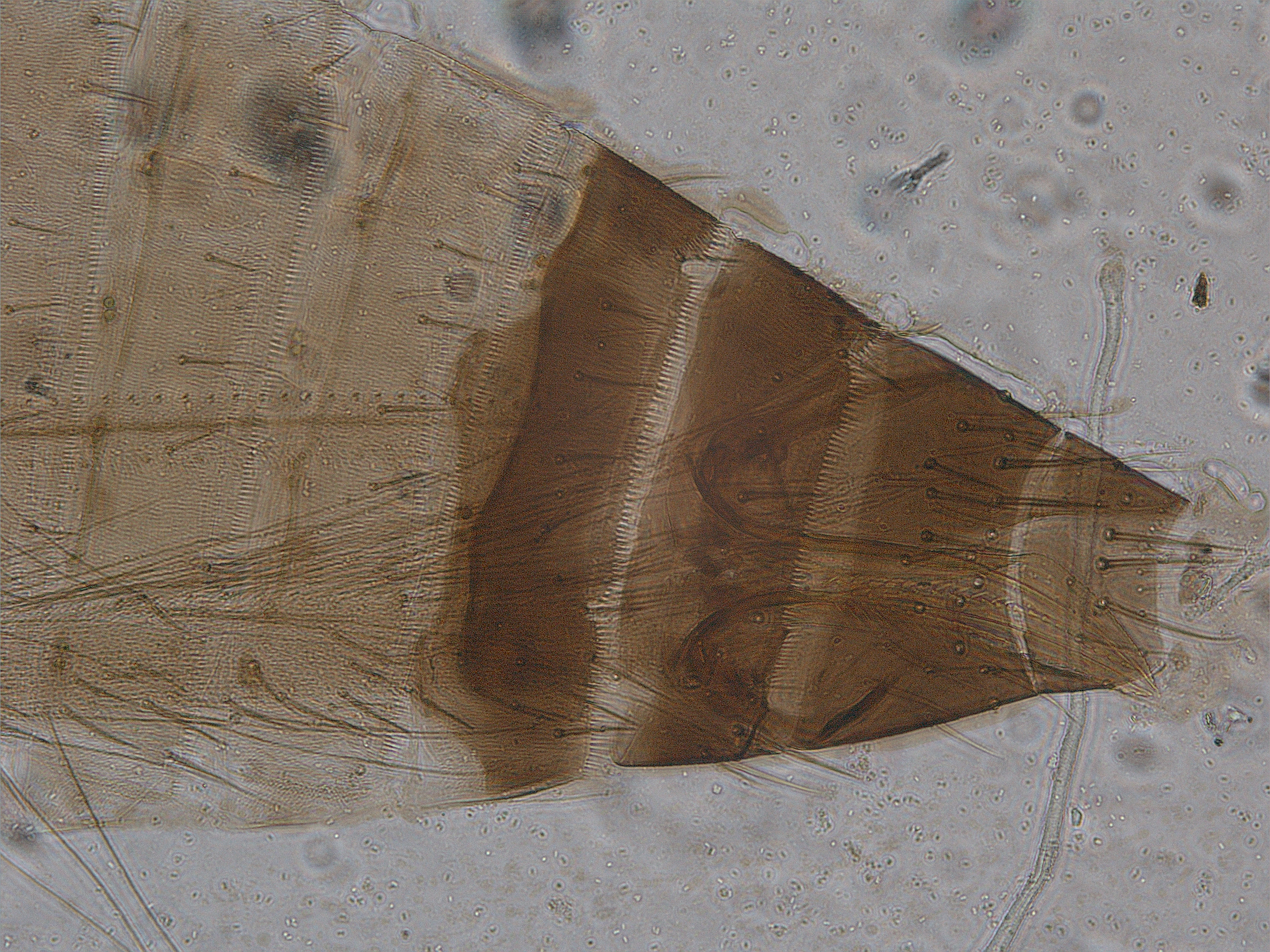 描述:雄虫:短翅型,一般体色和结构相似于雌虫,但体较小,腹部节I-VII黄色,翅短小;腹部节IX背鬃长度近似,前排2对,中排1对,后排4对;腹板节IV-VII有横腺域。