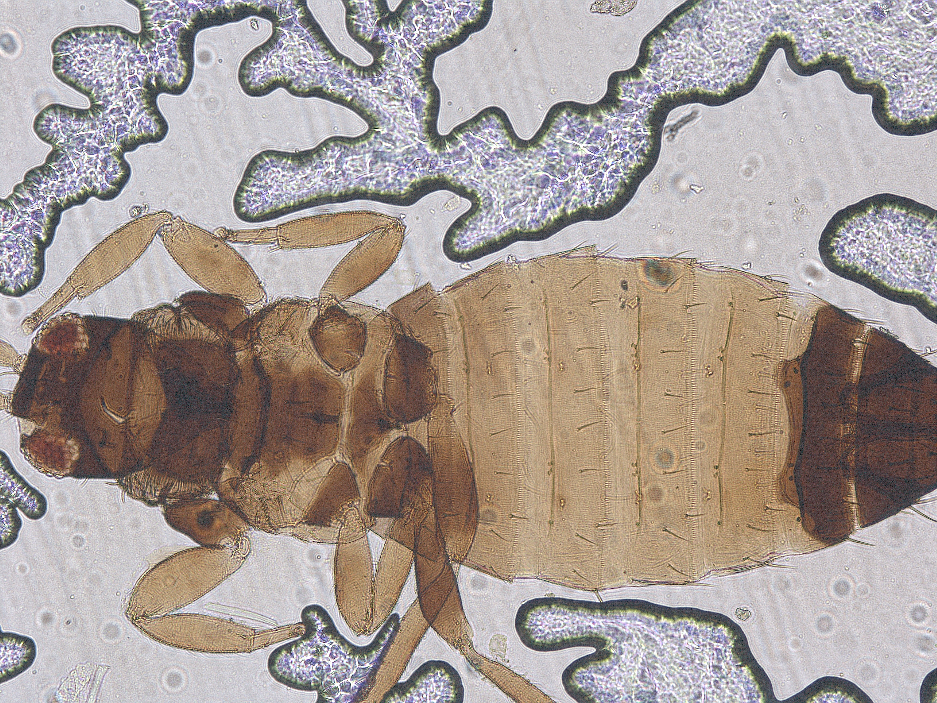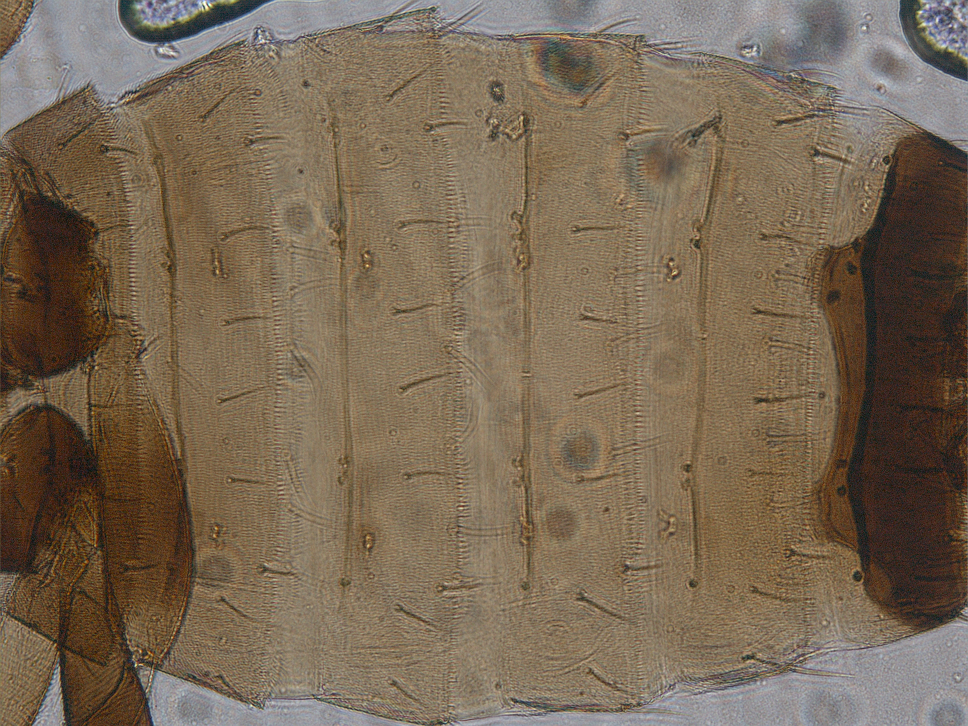 描述:雌虫(长翅型):体二色,除腹部节III-VII或IV-VII浅黄色外,其余部分棕色;触角节I-III浅黄色至黄色;前翅近基部浅黄色,其余暗黄色;各足棕色,但股节、胫节的基部黄色;体鬃与所在部位同色。头宽于长,短于前胸;复眼后一条弧线吧后部切割成半月形后头区,眼间线纹中有细颗粒,眼后有众多横纹;前侧鬃在前单眼两侧,单眼间鬃较细,位于前单眼后缘之两侧,在前后单眼外缘连线上;复眼后短鬃6对;触角8节,节III长约为宽的3.7倍;节V-VI内侧感觉锥基部常与该节愈合;口锥端部窄,申达前胸腹后部;下颚须3节。前胸背板布满交错横纹,骨化板前缘中部显著凹,板区内前内角及后部两侧各有一小无纹区,两侧有大而横的无纹区;各边缘鬃及板内鬃大小近似;中胸背板布满横交错线纹,前外侧鬃短于中后鬃和后缘鬃;后胸背板中、后部有交错横纹,中部线纹略呈迂迴网纹;后部横线内有极短纵线,两侧纵线内有模糊微颗粒;无钟形感觉器;前翅剑形,前缘鬃23根,前脉基鬃+端鬃18根,后脉鬃缺;中胸腹板内叉骨骨刺,后胸内叉骨刺呈双分支;后胸腹板横向半月形,前缘线不特别骨化,中部略向后凹;前足股节较膨大,后足基节粗大,后胫、跗节较长。腹部节I-VIII背板密排微毛,后缘梳毛完整;节II-VII背板前脊线显著,脊线上每侧有骨化结点2+1;节II-VII背板鬃大小近似,除内III鬃在后缘上以外,其余背板鬃均位于背板之前;节IX背板鬃较特殊,前排鬃4对,后缘鬃6对,长鬃3对;腹部节II-VI完全密布微毛,后缘梳毛完整,但节VII-VIII腹部中部缺微毛,节VII后缘两侧有梳毛;无附属鬃。 短翅型雌虫:体色和结构与长翅型相似,但翅胸窄,宽似前胸,翅短小,仅伸达腹部节I。