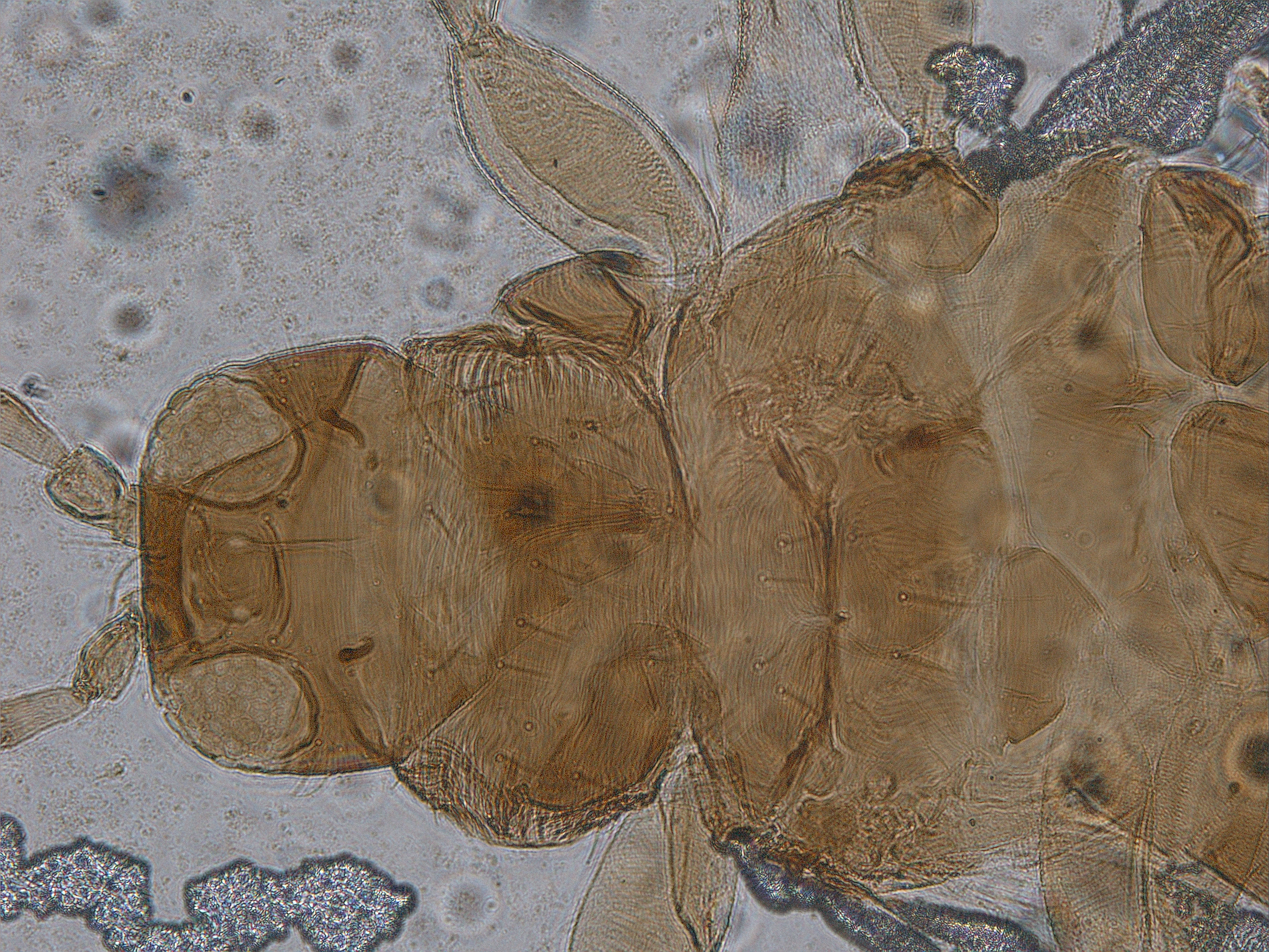 描述:雌虫(长翅型):体二色,除腹部节III-VII或IV-VII浅黄色外,其余部分棕色;触角节I-III浅黄色至黄色;前翅近基部浅黄色,其余暗黄色;各足棕色,但股节、胫节的基部黄色;体鬃与所在部位同色。头宽于长,短于前胸;复眼后一条弧线吧后部切割成半月形后头区,眼间线纹中有细颗粒,眼后有众多横纹;前侧鬃在前单眼两侧,单眼间鬃较细,位于前单眼后缘之两侧,在前后单眼外缘连线上;复眼后短鬃6对;触角8节,节III长约为宽的3.7倍;节V-VI内侧感觉锥基部常与该节愈合;口锥端部窄,申达前胸腹后部;下颚须3节。前胸背板布满交错横纹,骨化板前缘中部显著凹,板区内前内角及后部两侧各有一小无纹区,两侧有大而横的无纹区;各边缘鬃及板内鬃大小近似;中胸背板布满横交错线纹,前外侧鬃短于中后鬃和后缘鬃;后胸背板中、后部有交错横纹,中部线纹略呈迂迴网纹;后部横线内有极短纵线,两侧纵线内有模糊微颗粒;无钟形感觉器;前翅剑形,前缘鬃23根,前脉基鬃+端鬃18根,后脉鬃缺;中胸腹板内叉骨骨刺,后胸内叉骨刺呈双分支;后胸腹板横向半月形,前缘线不特别骨化,中部略向后凹;前足股节较膨大,后足基节粗大,后胫、跗节较长。腹部节I-VIII背板密排微毛,后缘梳毛完整;节II-VII背板前脊线显著,脊线上每侧有骨化结点2+1;节II-VII背板鬃大小近似,除内III鬃在后缘上以外,其余背板鬃均位于背板之前;节IX背板鬃较特殊,前排鬃4对,后缘鬃6对,长鬃3对;腹部节II-VI完全密布微毛,后缘梳毛完整,但节VII-VIII腹部中部缺微毛,节VII后缘两侧有梳毛;无附属鬃。 短翅型雌虫:体色和结构与长翅型相似,但翅胸窄,宽似前胸,翅短小,仅伸达腹部节I。