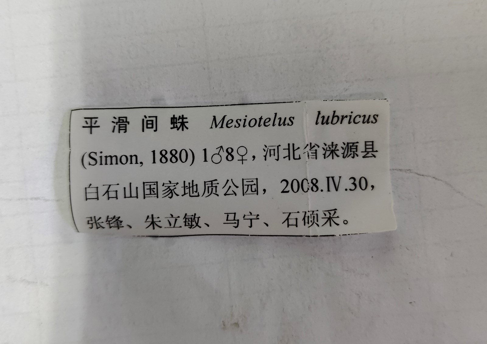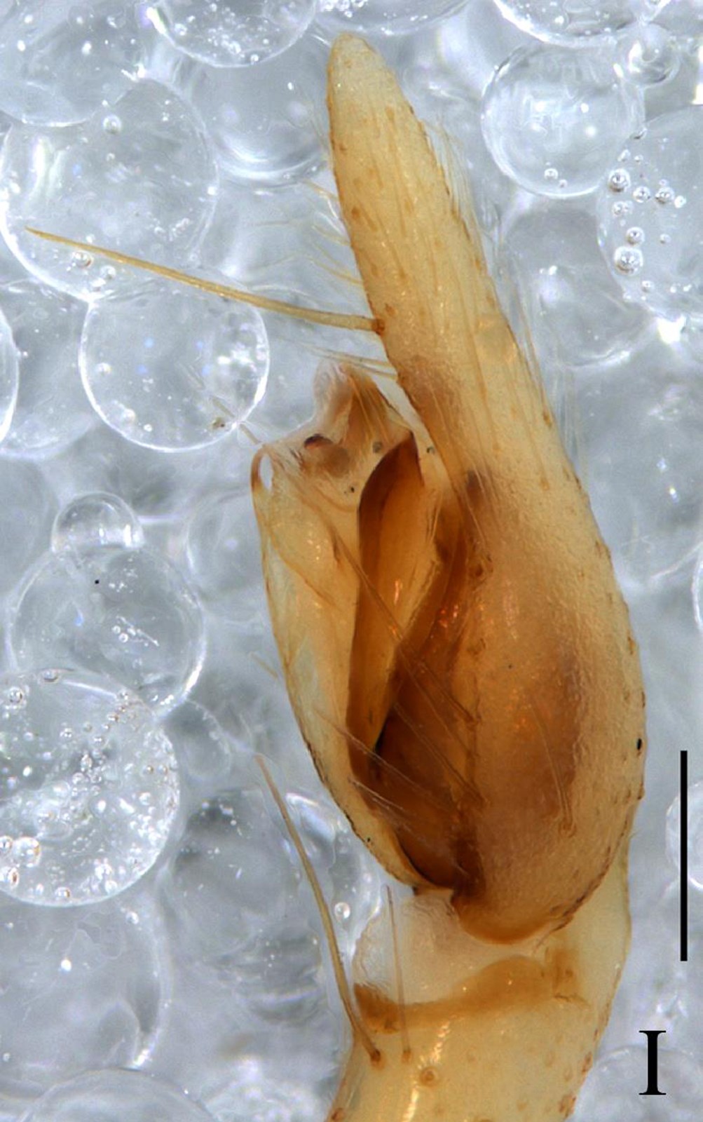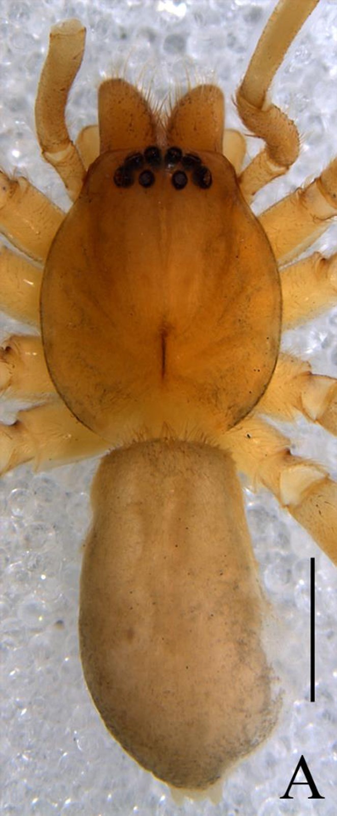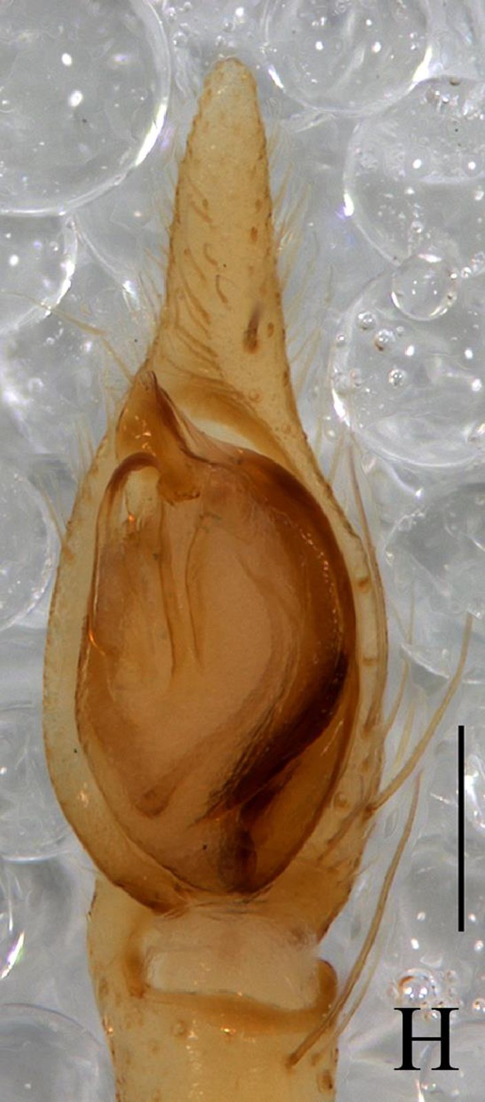 一雄蛛体长3.72:头胸部长1.55,宽1.42;腹部长2.17,宽1.32。背甲平滑黄褐色;背面观卵圆形,眼区颜色加深。额高0.10,等于一个前中眼直径。前中眼0.10,前侧眼0.12,后中眼0.10,后侧眼0.10;前中眼间距0.16,前中、侧眼间距0.13,后中眼间距0.19,后中、侧眼间距0.19。中眼域长0.19,前边宽0.13,后边宽0.19。中窝纵向,颜色较深,放射沟可见。螯肢褐色,近乎方形;前齿堤3齿,第3齿最小,后齿堤2齿。颚叶、下唇黄褐色;颚叶长大于宽,下唇长约等于宽。胸板近心形,黄褐色,后端尖。步足细长,浅黄色。步足Ⅰ腿节有2根背刺,1根外侧刺,步足Ⅱ腿节有2根背刺,步足Ⅲ腿节有2根背刺,1根外侧刺和1根内侧刺;步足Ⅰ胫节具有两对长的和两列短的腹刺,步足Ⅱ胫节有2对长的和两列短的腹刺,步足Ⅲ胫节具有3对腹刺,2根内侧和1根外侧刺;步足Ⅰ、Ⅱ后跗节具有1对长的腹刺,步足Ⅲ后跗节具有一对腹刺,1根外侧刺和1根内侧刺。第Ⅳ步足丢失。步足测量:7.78 (1.13+1.80+2.07+0.78+2.00);Ⅱ 6.50 (1.07+1.58+1.61+0.55+ 1.77);Ⅲ 5.38 (0.65+1.32+1.35+0.61 +1.45);Ⅳ丢失。腹部长卵圆形,浅灰色。心脏斑浅黄褐色,背面中央具两对褐色肌痕,纺器的周围具有一白色的环带。雄蛛触肢很长:腿节0.78,膝节0.61,胫节(包括胫节突)0.84,跗节(跗舟)0.78。触肢器的胫节具有一个短的外侧突和一个长的背突;中突扁盘状,基部细,起于盾板的中央;盾板端部具有一大的盾板突,棕色,硬化,腹面观具有两个刺状的尖端;插入器长,起于内侧,中间部分隐藏在盾板突的后面,尖端紧靠引导器;引导器端位,白色膜状;亚盾板小,几乎隐藏在盾板的内侧。一雌蛛体长5.76:头胸部长2.16,宽1.80;腹部长3.60,宽2.25。额高0.13,几乎接近前中眼直径。前中眼0.13,前侧眼0.14,后中眼0.12,后侧眼0.12;前中眼间距0.07,前中、侧眼间距0.03,后中眼间距0.13,后中、侧眼间距0.13。中眼域长0.33,前边宽0.30,后边宽0.36。Ⅰ、Ⅱ步足腿节有2根背刺,1根外侧刺,胫节具有2对长的和2列短的腹刺,后跗节具有1对长的腹刺。Ⅲ、Ⅳ步足腿节有2根背刺,1根内侧刺和1根外侧刺,胫节有3对长的腹刺,2根内侧刺和1根外侧刺,后跗节具3对长腹刺,1根内侧刺和1根外侧刺;步足其它节无刺。触肢测量:3.05 (0.86+0.66+0.72+0.81);步足测量:Ⅰ 8.29 (2.16+1.10+2.19+1.76+1.08);Ⅱ 7.66 (2.03+1.07+1.90+1.67+0.99);Ⅲ 7.03 (1.76+0.99+1.40+1.89+0.99);Ⅳ 9.99 (2.61+1.12+2.30+2.79+1.17)。足式:4 1 2 3。其余特征同雄蛛。外雌器有左右两边缘角质突起,自前斜向后方。外雌板纵长,前方有一新月形的垂兜,其凹面向后;插入孔2个,不明显,位于隆起角质片下面;外雌板中央为一些横向的褶皱;交配管非常短,直接进入纳精囊;纳精囊圆球形,背位;粘液囊腹位。