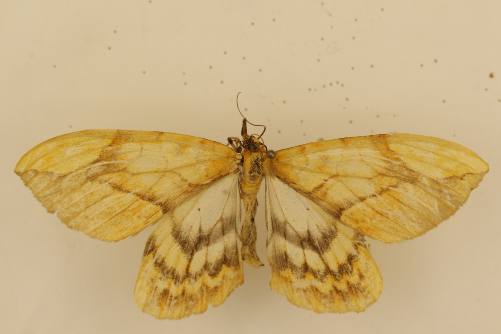 描述:前翅长:♂30-35 mm,♀33-35 mm。下唇须黑褐色,额、头顶和胸腹部背面黄色。前翅枯黄色;亚基线、内线和中线波状,内线和中线间黄色,有枯黄和灰褐色晕影;中线外侧有二条细纹,中点黑色短条状,外线“>”形,其外侧在M1以上至顶角有一黄色大斑,略带桔黄色;缘毛深灰褐色。后翅基半部白色,端半部黄色;中点微小;中带“)”形,外带和亚缘带锯齿形,后者较宽,其外侧边缘模糊,上端未达前缘;缘毛在顶角附近黄色,向下逐渐过渡为灰褐色。前翅反面灰黄色,中点同正面;内线、外线和翅端部各有一个褐斑。后翅反面灰白至灰黄色,斑纹同正面但十分模糊。♂第二性征发达。后翅中室端脉为极弱的双折角。雄性外生殖器(图577):抱器瓣宽大。阳茎基环侧突较细。 雌性外生殖器(图584):骨环细长。囊片近水滴形。