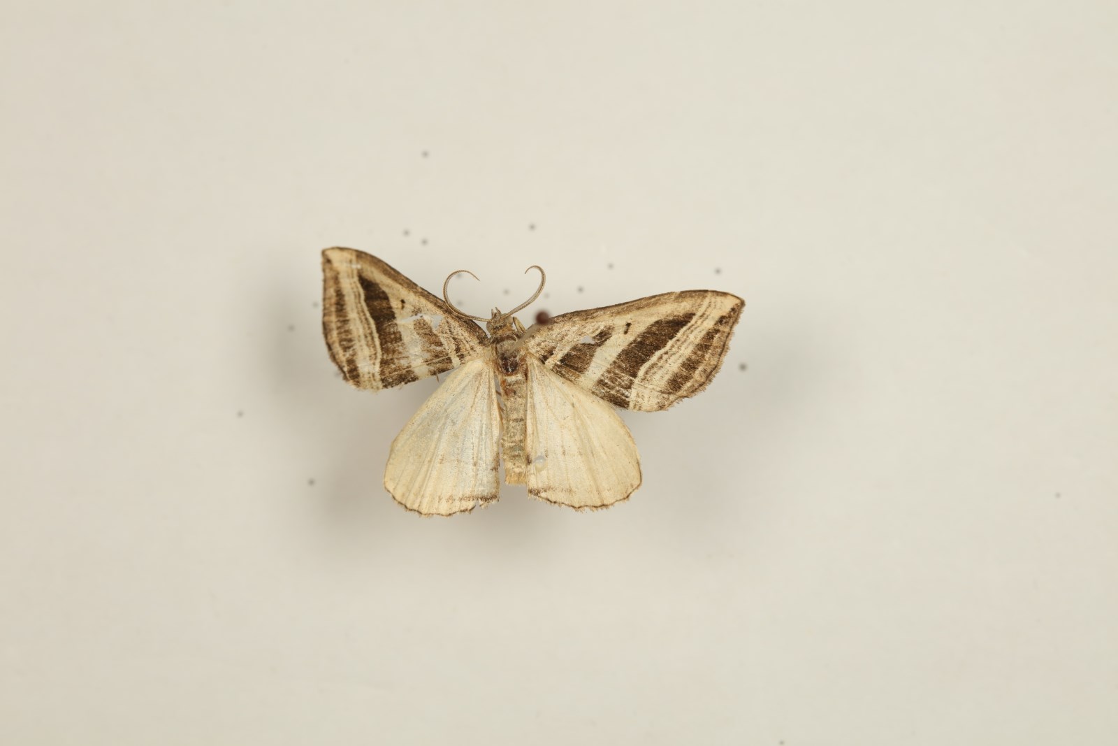 描述:前翅长:♂17—20mm,♀18—21mm。头和胸背深灰褐色与灰黄色掺杂,腹部背面灰褐色。前翅黑褐色,大部分为污白色条带所覆盖,只留下几个黑褐色楔形斑;前缘有一条由翅基直达顶角的污白色纵带,其下缘在中室前缘脉下方,前缘至Sc之间散布灰褐色;内线、中线、外线各为一条污白色带,其中内线和外线各由4条白线组成,前者上端向顶角方向倾斜,后者接近外缘,呈弧形弯曲;中线与后缘近于垂直,最大宽度约1.5mm,但其下端常不同程度消失,有时中线完全消失;亚缘线污白色纤细,其外侧色较浅;缘线黑褐色纤细;缘毛灰褐色,基半部色较深。后翅白色,灰色中点极微小,通常无外线和亚缘线,在少数个体中可见灰褐色外线残迹和亚缘线;翅端部略带灰褐色,缘浅深灰褐色,缘毛基半部土灰色,端半部灰白色。前翅反面隐见正面斑纹,前缘附近和翅端部散布黄褐色;后翅反面污黄色,翅脉黄色,散布大量褐鳞,前后翅反面均有深褐色中点。 雄性外生殖器(图63):钩形突细。阳茎基环侧突棒状。囊形突宽度大于背兜。抱器背短小,具一对小突;抱器腹极发达,端部延伸并包在抱器瓣端部之外,呈矛状。阳茎粗大,直径大于背兜上端宽度,无角状器。雌性外生殖器(图67):前表皮突短小。前阴片骨化宽大。囊导管短粗,骨化。囊颈骨化并膨大,扭曲。囊体膜质,具一片由微刺组成的囊片,近圆形。