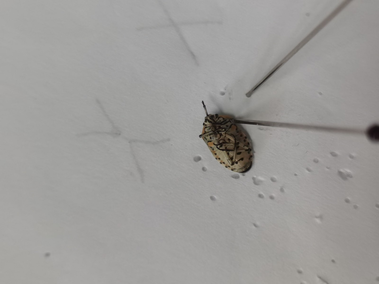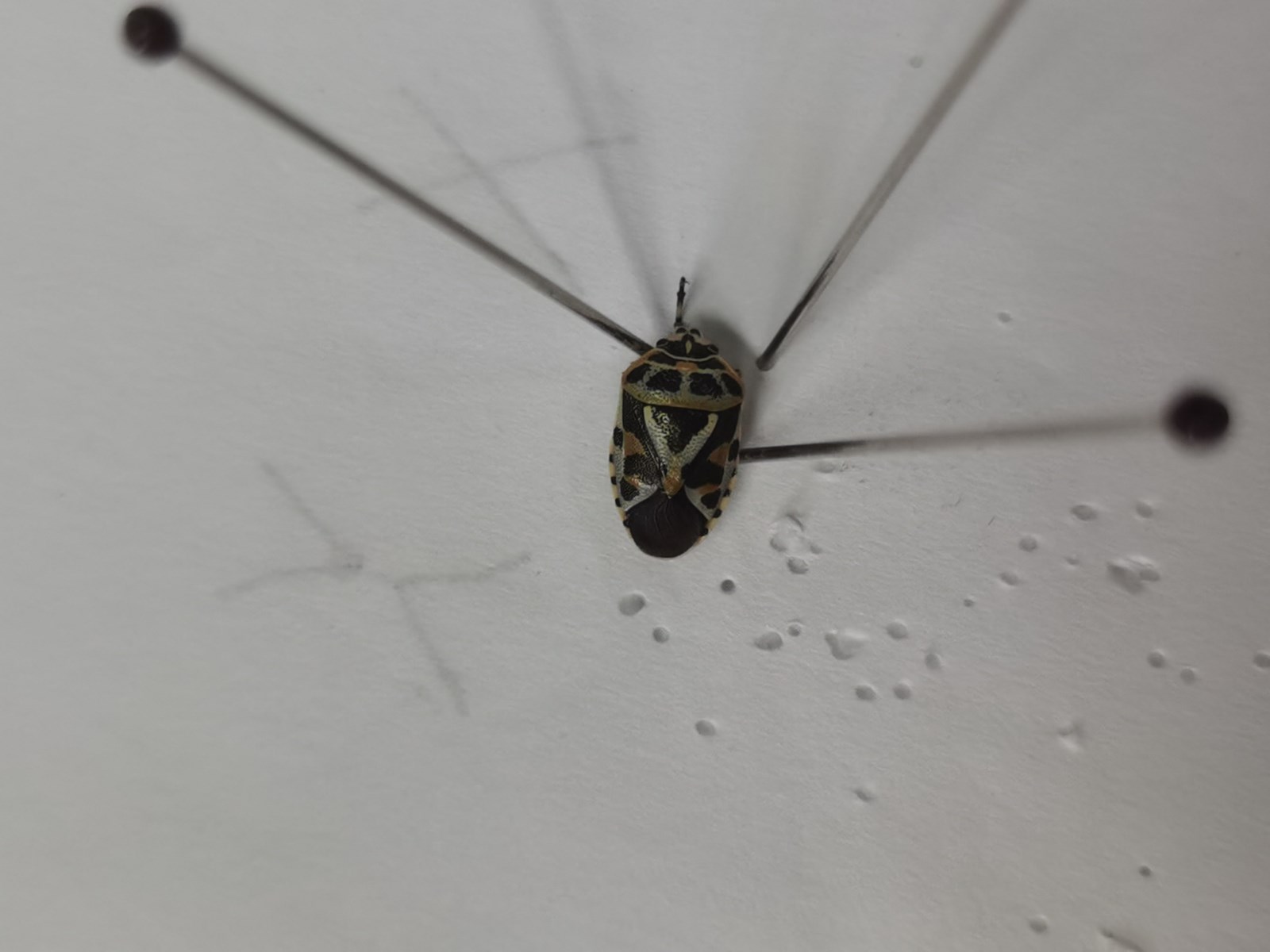成虫:椭圆形,体长6-9毫米,体色橙红或橙黄,有黑色斑纹。头部黑色,侧缘上卷,橙色或橙红。前胸背板上有6个大黑斑,略成两排,前排2个,后排4个。小盾片基部有1个三角形大黑斑,近端部两侧各有1个较小黑斑,小盾片橙红色部分成“Y”字形,交会处缢缩。翅革片具橙黄或橙红色曲纹,在翅外缘形成2黑斑;膜片黑色,具白边。足黄、黑相间。腹部腹面黄白色,具4纵列黑班。