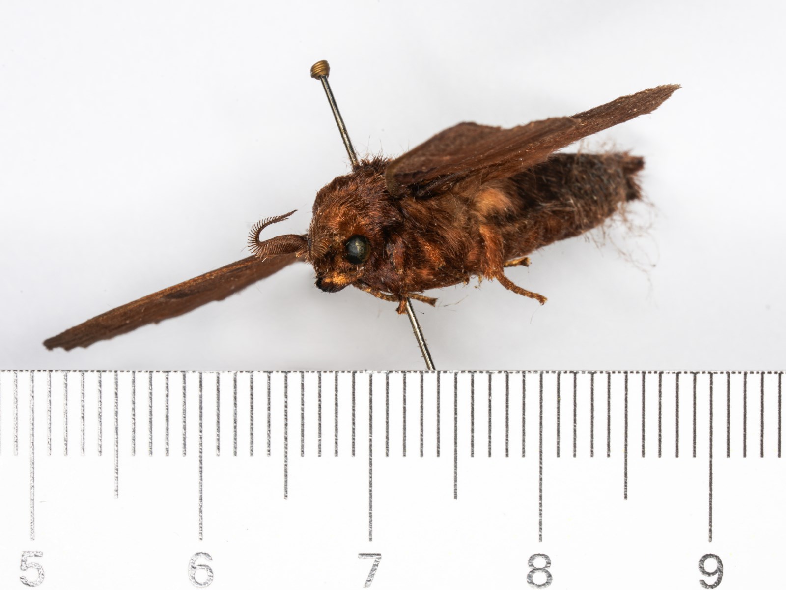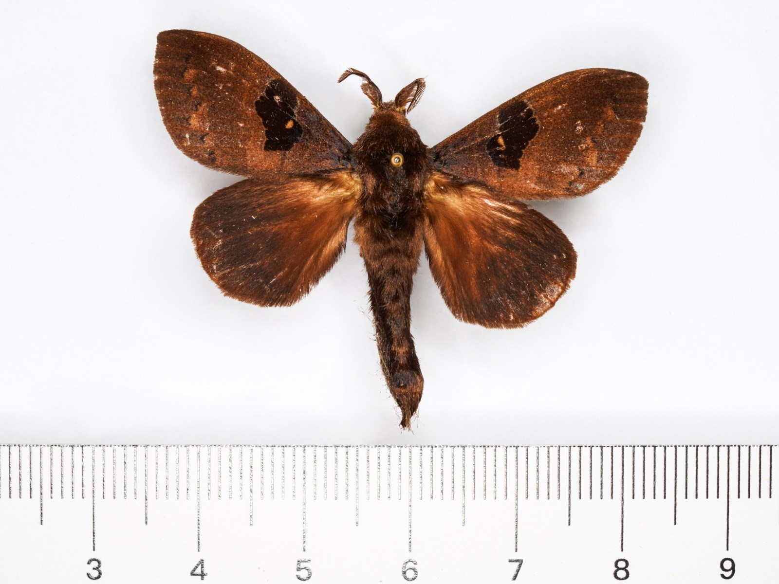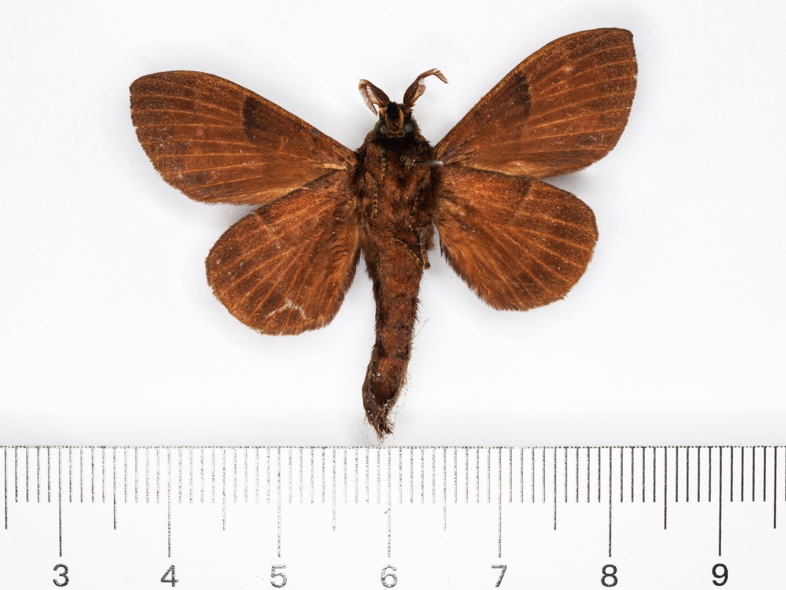 体长:雄蛾20-23mm,雌蛾30-38mm。翅展:雄蛾44-48mm,雌蛾65-84mm。 雄蛾体翅焦褐色。前翅前缘较直,外缘弧形弓出,全翅较宽短,前翅中间呈二条深褐色中带,两带间有黑色大斑;中室端小白点短,半月形到圆形,较明显,位于大斑内侧;大斑两侧镶以铅灰色线纹;亚外缘斑列黑褐色,内侧衬以褐色斑纹。后翅污褐色,近翅基处色淡。 雌蛾体翅褐色,前翅前角较尖,全翅呈4条浅褐色横线,外侧第2横线自中部开始向内弯曲,其它三线较直;中室端小白点模糊尚可识;亚外缘斑列黑色明显或不明显;缘毛灰褐色。后翅中间呈淡色斜带,缘毛灰褐色。 雄性外生殖器:大抱针指状,小抱针退化,抱囊略呈方形。抱足展开略呈"八"字形,自中部以下的外缘呈细齿状。阳茎刀状,末端圆钝,刀刃自基部开始呈小齿,靠端部着生8-9枚长齿,靠刀背端齿稍短,短齿均向上曲。 雌性外生殖器:前阴片相互连接在一起略呈圆圈状,两侧有多条皱褶;交配囊略呈三角形,有1枚横置的弯月形的囊突。 卵:圆形,灰白色,有两个褐色卵斑呈对称排列,卵斑中间暗灰色,周围白色。 幼虫:1龄幼虫除头部和前胸背板为黑色外,其余部分淡黄色;中、后胸背面有明显的"丫"字形纹。老熟幼虫体长70-85mm,头宽5-6mm。胸部第二节背面有1束黑色长毛;每对胸足的上方及腹部第2-8节的背面都有一毛束;腹部背面毛束前部的为淡黄色,后部的为黑色。 蛹:椭圆形,蛹长34-40mm,宽10-12mm。棕色,有深黄色短毛。茧长45-55mm,宽12-18mm。