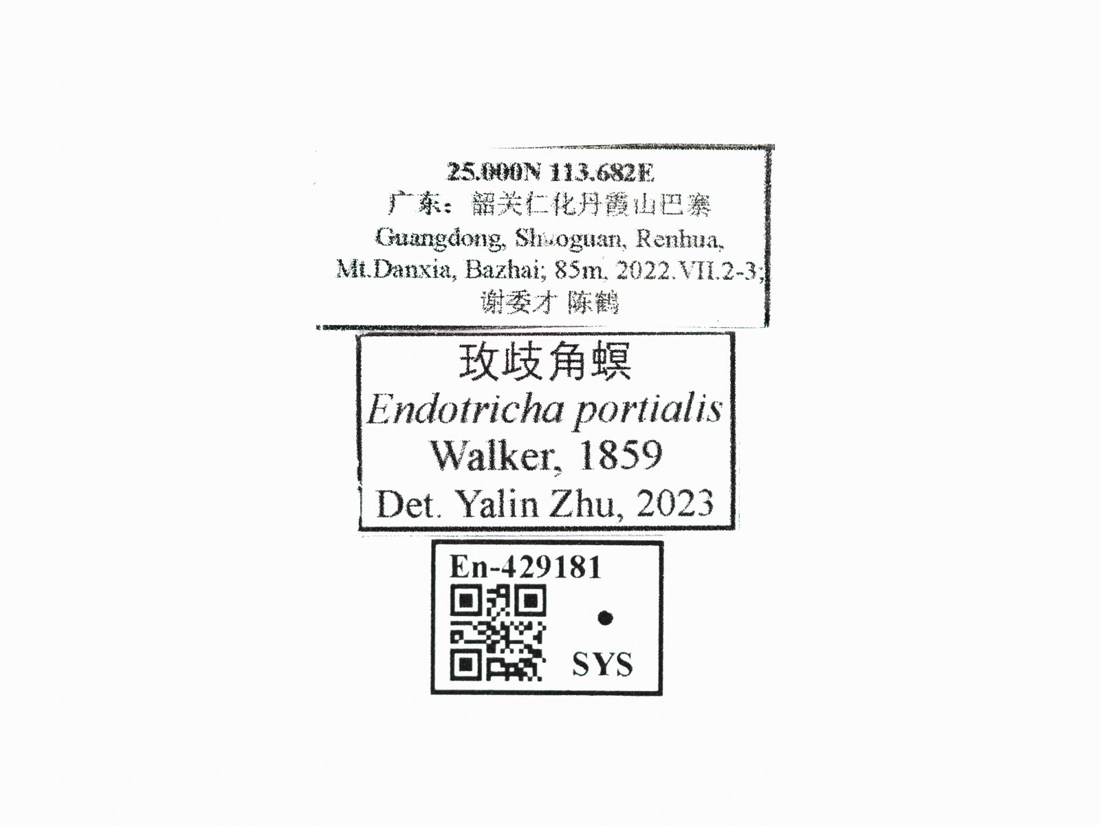 翅展15-20mm。头黄褐色。下唇须赤褐色,第2节下侧及第3节顶端黄色。触角淡褐色,雄性触角基节后方有1突起。胸、腹部背面褐色。前翅紫红色,中部前缘有1列白色刻点。内、外横线白色有黑色镶边,中室端有1黑点,外缘有1排黑点。后翅紫红色,内横线白色、波状,外横线白色有黑色镶边,外缘有1排黑点。双翅缘毛黄色。雄性外生殖器:爪形突篦状,基部两侧有三角形突起,颚形突方形,抱器瓣短宽,背缘中部有3根弯曲长鳞毛,抱器腹端弯钩状刺突,基部有细小尖突;阳端基环叉状基部宽大;阳茎长筒状端部有1狼牙棒状角状器。
