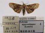 翅展25~35mm。头红褐色混杂黑褐鳞片,下唇须短、前伸,淡褐至黑褐色;触角黑褐色,雄性栉齿状;胸背茶褐色,腹背黑褐色,各节后缘淡褐色,足淡褐色,胫节及后足第1跗节有毛丛。前翅紫褐色,外缘赭褐色,亚基线淡黄色向外倾斜,外侧有1橙红色斜斑,内横线淡黄色呈环形弯曲,中室端有1"<"形黑色斑纹,斑纹周围淡黄色,外横线淡黄色弯曲在后缘与内横线靠近,外横线内侧有黑色镶边,缘毛赭褐与黑褐色相间。后翅褐色,外横线弯曲,缘毛灰白色基部黑褐色。雄性外生殖器:爪形突宽大,基部狭窄;颚形突粗壮顶端细尖钩状;抱器瓣舌状,抱器背基突左右愈合,端部分叉;阳端基环叉状,端部具细刺;阳茎粗壮长筒形,叉骨双叶细长尖;囊形突三角形。